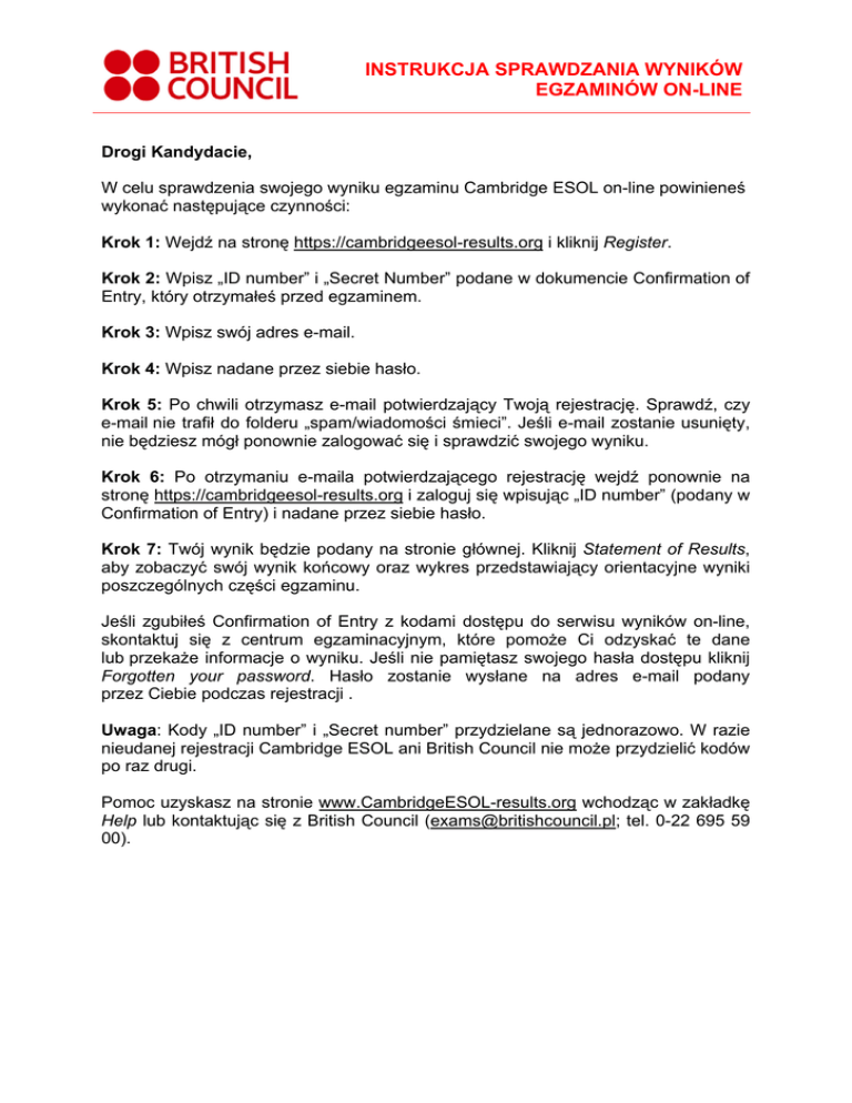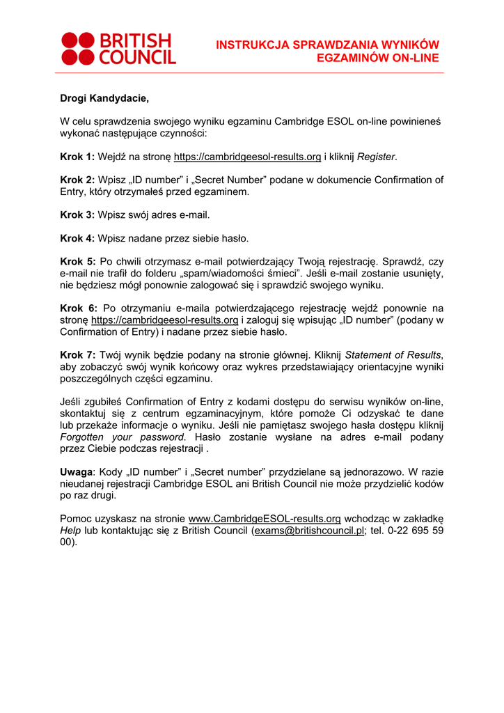 INSTRUKCJA SPRAWDZANIA WYNIKÓW EGZAMINÓW ON-LINE Drogi Kandydacie, W celu sprawdzenia swojego wyniku egzaminu Cambridge ESOL on-line powinieneś wykonać następujące czynności: Krok 1: Wejdź na stronę https://cambridgeesol-results.org i kliknij Register. Krok 2: Wpisz „ID number” i „Secret Number” podane w dokumencie Confirmation of Entry, który otrzymałeś przed egzaminem. Krok 3: Wpisz swój adres e-mail. Krok 4: Wpisz nadane przez siebie hasło. Krok 5: Po chwili otrzymasz e-mail potwierdzający Twoją rejestrację. Sprawdź, czy e-mail nie trafił do folderu „spam/wiadomości śmieci”. Jeśli e-mail zostanie usunięty, nie będziesz mógł ponownie zalogować się i sprawdzić swojego wyniku. Krok 6: Po otrzymaniu e-maila potwierdzającego rejestrację wejdź ponownie na stronę https://cambridgeesol-results.org i zaloguj się wpisując „ID number” (podany w Confirmation of Entry) i nadane przez siebie hasło. Krok 7: Twój wynik będzie podany na stronie głównej. Kliknij Statement of Results, aby zobaczyć swój wynik końcowy oraz wykres przedstawiający orientacyjne wyniki poszczególnych części egzaminu. Jeśli zgubiłeś Confirmation of Entry z kodami dostępu do serwisu wyników on-line, skontaktuj się z centrum egzaminacyjnym, które pomoże Ci odzyskać te dane lub przekaże informacje o wyniku. Jeśli nie pamiętasz swojego hasła dostępu kliknij Forgotten your password. Hasło zostanie wysłane na adres e-mail podany przez Ciebie podczas rejestracji . Uwaga: Kody „ID number” i „Secret number” przydzielane są jednorazowo. W razie nieudanej rejestracji Cambridge ESOL ani British Council nie może przydzielić kodów po raz drugi. Pomoc uzyskasz na stronie www.CambridgeESOL-results.org wchodząc w zakładkę Help lub kontaktując się z British Council ([email protected]; tel. 0-22 695 59 00).