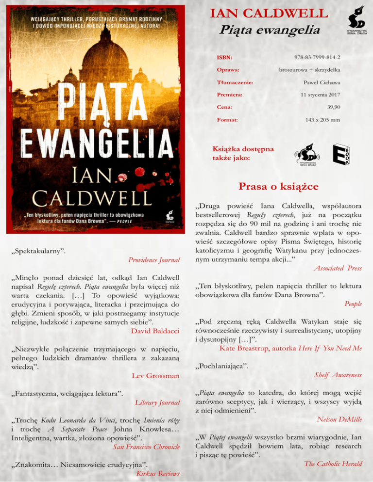 IAN CALDWELL Piąta ewangelia ISBN: 978-83-7999-814-2 Oprawa: Tłumaczenie: Premiera: broszurowa + skrzydełka Paweł Cichawa 11 stycznia 2017 Cena: 39,90 Format: 143 x 205 mm Książka dostępna także jako: Prasa o książce „Spektakularny”. Providence Journal „Minęło ponad dziesięć lat, odkąd Ian Caldwell napisał Regułę czterech. Piąta ewangelia była więcej niż warta czekania. […] To opowieść wyjątkowa: erudycyjna i porywająca, literacka i przejmująca do głębi. Zmieni sposób, w jaki postrzegamy instytucje religijne, ludzkość i zapewne samych siebie”. David Baldacci „Niezwykłe połączenie trzymającego w napięciu, pełnego ludzkich dramatów thrillera z zakazaną wiedzą”. Lev Grossman „Fantastyczna, wciągająca lektura”. Library Journal „Trochę Kodu Leonarda da Vinci, trochę Imienia róży i trochę A Separate Peace Johna Knowlesa… Inteligentna, wartka, złożona opowieść”. San Francisco Chronicle „Znakomita… Niesamowicie erudycyjna”. Kirkus Reviews „Druga powieść Iana Caldwella, współautora bestsellerowej Reguły czterech, już na początku rozpędza się do 90 mil na godzinę i ani trochę nie zwalnia. Caldwell bardzo sprawnie wplata w opowieść szczegółowe opisy Pisma Świętego, historię katolicyzmu i geografię Watykanu przy jednoczesnym utrzymaniu tempa akcji...” Associated Press „Ten błyskotliwy, pełen napięcia thriller to lektura obowiązkowa dla fanów Dana Browna”. People „Pod zręczną ręką Caldwella Watykan staje się równocześnie rzeczywisty i surrealistyczny, utopijny i dysutopijny […]”. Kate Breastrup, autorka Here If You Need Me „Pochłaniająca”. Shelf Awareness „Piąta ewangelia to katedra, do której mogą wejść zarówno sceptycy, jak i wierzący, i wszyscy wyjdą z niej odmienieni”. Nelson DeMille „W Piątej ewangelii wszystko brzmi wiarygodnie, Ian Caldwell spędził bowiem lata, robiąc research i pisząc tę powieść”. The Catholic Herald IAN CALDWELL Fragmenty wywiadu z autorem Czy możesz opowiedzieć nam trochę o genezie Piątej ewangelii? Zaczęło się od historycznej zagadki, którą odkryłem ponad dekadę temu. Biblia milczy na temat wyglądu Jezusa, na najstarszych zachowanych malowidłach czasem przedstawiany jest z krótkimi włosami, czasem bez brody, jednak żadna z wersji nie była na tyle mocna, by wygrać z innymi. Jeszcze około roku Pańskiego 400 wszystkie konkurujące ze sobą wizerunki zostały zastąpione przez portret, który znamy dziś – długowłosego Jezusa z brodą. Dlaczego? Jakie odkrycie sprawiło, że chrześcijański świat zdecydował, że tak właśnie wyglądał Jezus? To pytanie dało początek Piątej ewangelii. W podziękowaniach piszesz o tym, że pracowałeś nad książką dziesięć lat. Możesz powiedzieć coś więcej? Urodzony 18 marca 1976 roku amerykański powieściopisarz. Po skończeniu studiów wraz ze swym przyjacielem z dzieciństwa, Dustinem Thomasonem, postanowił napisać półautobiograficzną opowieść Reguła czterech. Książka została opublikowana w 2004 roku i przez czterdzieści dziewięć tygodni utrzymywała się na liście bestsellerów „New York Timesa”. Została też przetłumaczona na trzydzieści pięć języków, a jej sprzedaż wyniosła prawie 2 miliony egzemplarzy. Książkę porównuje się często do Kodu Leonarda da Vinci Dana Browna ze względu na pokrewny sposób nauki o historii przez wplatanie jej w fikcyjną fabułę oraz zbliżoną datę publikacji powieści. Caldwell i Thomason w 1994 roku ukończyli naukowo-techniczne liceum Thomasa Jeffersona w hrabstwie Fairfax w Virginii, a cztery lata później studia na Princetown University. Obecnie Ian Caldwell mieszka z żoną i dziećmi pod Waszyngtonem D.C. Sonia Draga Sp. z o.o., Pl. Grunwaldzki 8-10, 40-127 Katowice, Tel.: 32 7826477, 7826037, Fax: 032 2537728 Dział handlowy: Danuta Czarnowska, 693420384, [email protected] Promocja: Agnieszka Jedlińska, 695672067, [email protected] Redakcja: [email protected] Piąta ewangelia w całości osadzona jest w Watykanie i opowiedziana z perspektywy katolickiego księdza. Sam nie jestem katolikiem, a że autentyczność i faktograficzna precyzja były dla mnie ważne, to napisanie powieści wymagało olbrzymiego researchu. Przeczytałem ponad 600 pozycji o Watykanie, rozmawiałem z specjalizującymi się w tym temacie duchownymi, dyplomatami Stolicy Apostolskiej, katolickimi uczonymi i ekspertami z dziedziny prawa kościelnego. Czy powieści historyczne to twój wybór? Co jest takiego w tym gatunku, że cię on pociąga? Piszę o współczesnych ludziach, którzy mają głębokie poczucie związku z tajemnicami z przeszłości. Odkryłem, że rozumiem siebie i mój świat lepiej, kiedy mogę przejrzeć się w historii jak w lustrze. Czy Piąta ewangelia to opowieść o ojcach i synach, o grzechu i odkupieniu czy też wierze i rodzinie? To opowieść o każdej z tych rzeczy. To także thriller o tym, jak we współczesnym świecie pogodzić bycie człowiekiem nauki i wiary. Źródło: http://www.thehindu.com/features/metroplus/histor y-as-a-mirror-ian-caldwell-the-fifthgospel/article7098946.ece