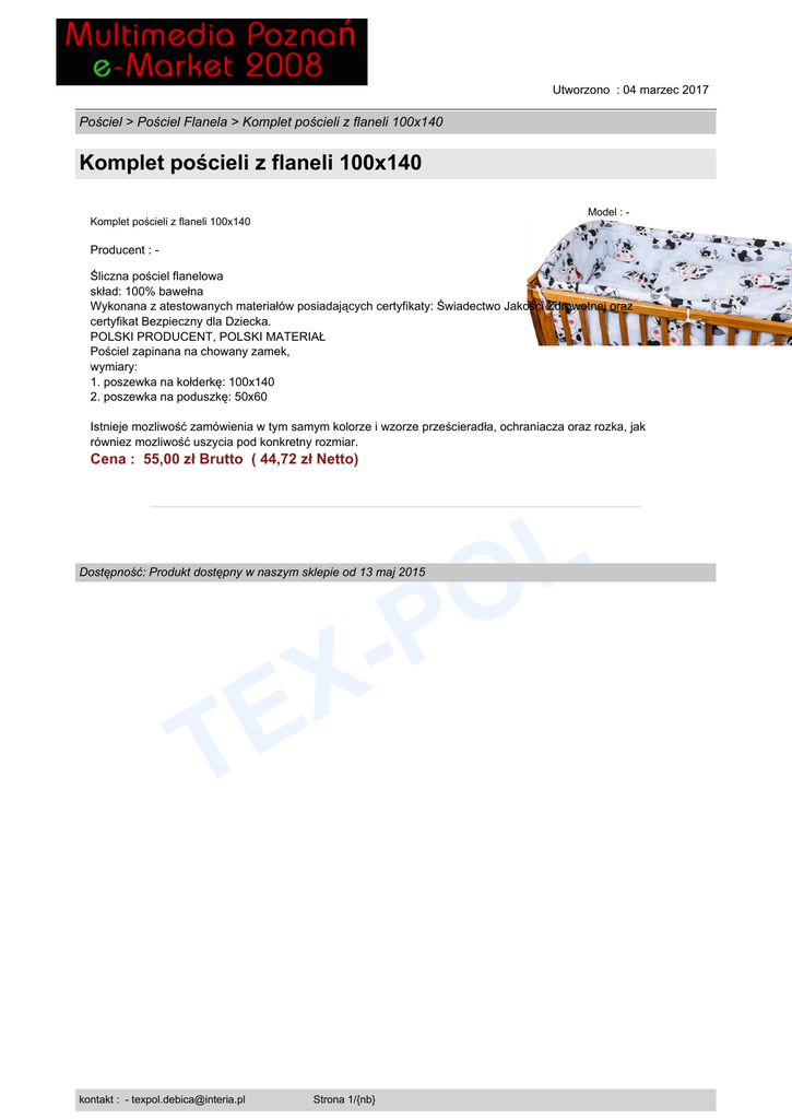 Utworzono : 04 marzec 2017 Pościel > Pościel Flanela > Komplet pościeli z flaneli 100x140 Komplet pościeli z flaneli 100x140 Model : - Komplet pościeli z flaneli 100x140 Producent : Śliczna pościel flanelowa skład: 100% bawełna Wykonana z atestowanych materiałów posiadających certyfikaty: Świadectwo Jakości Zdrowotnej oraz certyfikat Bezpieczny dla Dziecka. POLSKI PRODUCENT, POLSKI MATERIAŁ Pościel zapinana na chowany zamek, wymiary: 1. poszewka na kołderkę: 100x140 2. poszewka na poduszkę: 50x60 Istnieje mozliwość zamówienia w tym samym kolorze i wzorze prześcieradła, ochraniacza oraz rozka, jak równiez mozliwość uszycia pod konkretny rozmiar. Cena : 55,00 zł Brutto ( 44,72 zł Netto) Dostępność: Produkt dostępny w naszym sklepie od 13 maj 2015 E T kontakt : - [email protected] P X L O Strona 1/{nb}