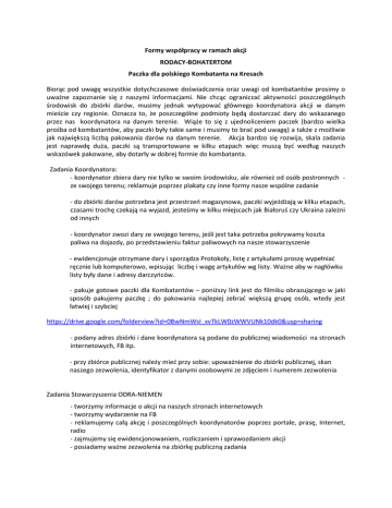 Formy współpracy w ramach akcji RODACY-BOHATERTOM Paczka dla polskiego Kombatanta na Kresach Biorąc pod uwagę wszystkie dotychczasowe doświadczenia oraz uwagi od kombatantów prosimy o uważne zapoznanie się z naszymi informacjami. Nie chcąc ograniczać aktywności poszczególnych środowisk do zbiórki darów, musimy jednak wytypować głównego koordynatora akcji w danym mieście czy regionie. Oznacza to, że poszczególne podmioty będą dostarczać dary do wskazanego przez nas koordynatora na danym terenie. Wiąże to się z ujednoliceniem paczek (bardzo wielka prośba od kombatantów, aby paczki były takie same i musimy to brać pod uwagę) a także z możliwie jak największą liczbą pakowania darów na danym terenie. Akcja bardzo się rozwija, skala zadania jest naprawdę duża, paczki są transportowane w kilku etapach więc muszą być według naszych wskazówek pakowane, aby dotarły w dobrej formie do kombatanta. Zadania Koordynatora: - koordynator zbiera dary nie tylko w swoim środowisku, ale również od osób postronnych ze swojego terenu; reklamuje poprzez plakaty czy inne formy nasze wspólne zadanie - do zbiórki darów potrzebna jest przestrzeń magazynowa, paczki wyjeżdżają w kilku etapach, czasami trochę czekają na wyjazd, jesteśmy w kilku miejscach jak Białoruś czy Ukraina zależni od innych - koordynator zwozi dary ze swojego terenu, jeśli jest taka potrzeba pokrywamy koszta paliwa na dojazdy, po przedstawieniu faktur paliwowych na nasze stowarzyszenie - ewidencjonuje otrzymane dary i sporządza Protokoły, listę z artykułami proszę wypełniać ręcznie lub komputerowo, wpisując liczbę i wagę artykułów wg listy. Ważne aby w nagłówku listy były dane i adresy darczyńców. - pakuje gotowe paczki dla Kombatantów – poniższy link jest do filmiku obrazującego w jaki sposób pakujemy paczkę ; do pakowania najlepiej zebrać większą grupę osób, wtedy jest łatwiej i szybciej https://drive.google.com/folderview?id=0BwNmWsI_xvTkLW0zWWVUNk10dk0&usp=sharing - podany adres zbiórki i dane koordynatora są podane do publicznej wiadomości na stronach internetowych, FB itp. - przy zbiórce publicznej należy mieć przy sobie: upoważnienie do zbiórki publicznej, skan naszego zezwolenia, identyfikator z danymi osobowymi ze zdjęciem i numerem zezwolenia Zadania Stowarzyszenia ODRA-NIEMEN - tworzymy informacje o akcji na naszych stronach internetowych - tworzymy wydarzenie na FB - reklamujemy całą akcję i poszczególnych koordynatorów poprzez portale, prasę, Internet, radio - zajmujemy się ewidencjonowaniem, rozliczaniem i sprawozdaniem akcji - posiadamy ważne zezwolenia na zbiórkę publiczną zadania - jesteśmy koordynatorem głównym akcji oraz mamy swoich koordynatorów regionalnych z naszych oddziałów, zbieramy dary od prywatnych darczyńców z Polski i z zagranicy i wykonujemy wszystkie powyższe czynności koordynatora - wysyłamy do koordynatora zestaw materiałów: plakat akcji w formie elektronicznej do rozsyłania czy wydruku – mogą być własne modyfikacje, ważne aby wszędzie była nazwa zadania upoważnienie do zbiórki publicznej i skan naszego zezwolenia kartony do pakowania według liczby zamówień po zakończeniu akcji przesyłamy dyplomy z podziękowaniem dla największych darczyńców a dla wszystkich przesyłamy podsumowanie z wykonania zadania, zawsze w podsumowaniu są zaznaczone informacje z regionów i przedstawiani partnerzy akcji Zajmujemy się logistyką paczek, organizacją wypraw Pokrywamy koszty paliwa związane z dowozem darów na danym terenie Oferujemy wspólne wyprawy z darami do kombatantów na Litwę , Ukrainę i Białoruś dla najbardziej zaangażowanych osób Osoby deklarujące koordynować akcje na swoim terenie są proszone o przesłanie swoich danych na adres: [email protected] Imię i nazwisko koordynatora akcji lub Dane organizacji występującego jako koordynatora akcji Telefon, Adres e-mailowy, Miejsce zbiórki darów, godziny przyjmowania darów – informacja dla darczyńców na strony www i FB, Deklaracja, czy paczki będą pakowane na terenie koordynatora Deklaracja czy jest możliwy transport w obrębie danego regionu, Deklaracja czy jest możliwość magazynu, większego miejsca na zbieranie darów