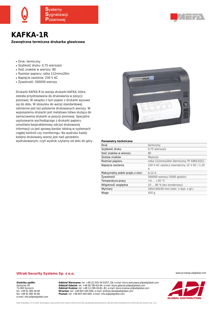 KAFKA-1R Zewnętrzna termiczna drukarka głowicowa ● ● ● ● ● ● Druk: termiczny Szybkość druku: 0,75 wiersza/s Ilość znaków w wierszu: 80 Rozmiar papieru: rolka 112mmx20m Napięcie zasilania: 230 V AC Żywotność: 500000 wierszy Drukarki KAFKA R to wersja drukarki KAFKA, która została przystosowana do drukowania w pozycji pionowej. W związku z tym papier z drukarki wysuwa się do dołu. W stosunku do wersji standardowej odmienne jest też położenie drukowanych wierszy. W wyposażeniu drukarki jest metalowa listwa służąca do zamocowania drukarki w pozycji pionowej. Specjalne usytuowanie wychodzącego z drukarki papieru umożliwia bezproblemowy odczyt drukowanej informacji co jest sprawą bardzo istotną w systemach ciągłej kontroli czy monitoringu. Na wydruku każdy kolejno drukowany wiersz jest nad uprzednio wydrukowanym, czyli wydruk czytamy od dołu do góry. Parametry techniczne Druk Szybkość druku Ilość znaków w wierszu Zestaw znaków Rozmiar papieru Napięcie zasilania Maksymalny pobór prądu z sieci Żywotność Temperatura pracy Wilgotność względna Wymiary Waga termiczny 0,75 wiersza/s 80 Mazovia rolka 112mmx20m (termiczny TF 50KS-E2C) 230 V AC zasilacz zewnętrzny 12 V DC / 1,25 A 0,12 A 500000 wierszy (5000 godzin) +5 ... +35 °C 10 ... 80 % bez kondensacji 165x140x50 mm (szer. x wys. x gł.) 450 g Ultrak Security Systems Sp. z o.o. Siedziba spółki: Santocka 39 71-083 Szczecin tel. +48 91 485 40 60 fax +48 91 485 40 80 e-mail: [email protected] Oddział Warszawa: tel. +48 22 519-76-53/57..58, e-mail: [email protected] Oddział Gdańsk: tel. +48 58 785-62-94, e-mail: [email protected] Oddział Kraków: tel: +48 12 290-10-81..82, e-mail: [email protected] Wrocław: tel: +48 607-445-836, e-mail: [email protected] Poznań: tel: +48 607-445-640, e-mail: [email protected] Data modyfikacji: 27.11.2016. Zastrzegamy sobie prawo zmian danych technicznych bez uprzedniego powiadomienia. ADI jest marką handlową firmy Ultrak Security Systems Sp. z o.o. www.pl-eshop.adiglobal.com