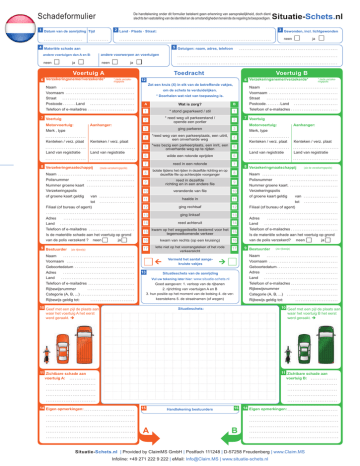 Schadeformulier De handtekening onder dit formulier betekent geen erkenning van aansprakelijkheid, doch dient slechts ter vaststelling van de identiteit en de omstandigheden teneinde de regeling te bespoedigen. Situatie-Schets.nl 2 Land · Plaats · Straat: 1 Datum van de aanrijding Tijd 3 Gewonden, incl. lichtgewonden neen 4 Materiële schade aan andere voertuigen dan A en B: andere voorwerpen an voertuigen neen neen ja ja Voertuig A Toedracht * ziede verzekeringspolis 6 Verzekeringsnemer/verzekerde* Voertuig B 6 Verzekeringsnemer/verzekerde* 12 Zet een kruis (X) in elk van de betreffende vakjes, Naam Voornaam * Doorhalen wat niet van toepassing is. Straat Land Straat A Wat is zorg? B 1 * stond geparkeerd / stil 1 2 * reed weg uit parkeerstand / opende een portier 2 3 ging parkeren 3 4 *reed weg van een parkeerplaats, een uitrit, een onverharde weg 4 5 *was bezig een parkeerplaats, een inrit, een onverharde weg op te rijden 5 6 wilde een rotonde oprijden 6 7 reed in een rotonde 7 8 botste tijdens het rijden in dezelfde richting en op dezelfde file op achterzijde voorganger 8 9 reed in dezelfde richting en in een andere file 9 10 veranderde van file 10 11 haalde in 11 12 ging rechtsaf 12 13 ging linksaf 13 Land 14 reed achteruit 14 Telefoon of e-mailadres Is de materiële schade aan het voertuig op grond kwam op het weggedeelte bestemd voor het 15 15 tegemoetkomende verkeer van de polis verzekerd ? neen 16 kwam van rechts (op een kruising) 16 17 lette niet op het voorrangsteken of het rode verkeerslicht 17 Telefoon of e-mailadres 7 Voertuig Aanhanger: Motorvoertuig: Merk , type Kenteken / verz. plaat Land van registratie Kenteken / verz. plaat (ziede verzekeringspolis) Naam Polisnummer Nummer groene kaart Verzekeringspolis of groene kaart geldig van tot Filiaal (of bureau of agent) Adres 9 Bestuurder (zie rijbewijs) ja Postcode Land Telefoon of e-mailadres 7 Voertuig Aanhanger: Motorvoertuig: Land van registratie 8 Verzekeringmaatschappij * ziede verzekeringspolis Naam om de schets te verduidelijken. Voornaam Postcode ja 5 Getuigen: naam, adres, telefoon Merk, type Kenteken / verz. plaat Kenteken / verz. plaat Land van registratie Land van registratie 8 Verzekeringmaatschappij (zie de verzekeringspolis) Naam Polisnummer Nummer groene kaart. Verzekeringspolis of groene kaart geldig van tot Filiaal (of bureau of agent) Adres Land Telefoon of e-mailadres Is de materiële schade aan het voertuig op grond van de polis verzekerd? 9 Bestuurder neen ja (zie rijbewijs) Naam Naam Voornaam Geboortedatum 13 Adres Land Telefoon of e-mailadres Vermeld het aantal aangekruiste vakjes Voornaam Geboortedatum Situatieschets van de aanrijding Adres Vul uw tekening later hier: www.situatie-schets.nl Land Telefoon of e-mailadres Goed aangeven: 1. verloop van de rijbanen 2. rijrichting van voertuigen A en B 3. hun positie op het moment van de botsing 4. de verkeerstekens 5. de straatnamen (of wegen) Rijbewijsnummer Categorie (A, B, ...) Rijbewijs geldig tot: 10 Geef met een pijl de plaats aan waar het voertuig A het eerst werd geraakt. Rijbewijsnummer Categorie (A, B, ...) Rijbewijs geldig tot: 10 Geef met een pijl de plaats aan waar het voertuig B het eerst werd geraakt. Situatieschets: 11 Zichtbare schade aan voertuig A: 14 Eigen opmerkingen: 11 Zichtbare schade aan voertuig B: 15 A Handtekening bestuurders 15 14 Eigen opmerkingen: B Situatie-Schets.nl | Provided by ClaimMS GmbH | Postfach 111248 | D-57258 Freudenberg | www.Claim.MS Infoline: +49 271 222 9 222 | eMail: [email protected] | www.situatie-schets.nl Relacja z wypadku 1 Data wypadku Szkic-Sytuacyjny.pl Wszystkie dane w poniższym sprawozdaniu służą przedstawieniu stanu faktycznego i nie stanowią przyznania się do winy. 2 Kraj / Kod pocztowy / miejscowość Godzina 3 Ranni, nawet lekko ranni nie 4 Szkody materialne dotyczące innych pojazdów niż A i B nie tak 5 Świadkowie: nazwiska, adresy, nr tel. innych przedmiotów niż pojazdów: tak nie tak Pojazd A 6 Ubezpieczony* Okoliczności zdarzenia *(patrz potwierdzenie ubezpieczenia) Pojazd B 12 6 Ubezpieczony* W celu sprecyzowania szkicu zakreślić krzyżykiem nazwisko odpowiednie pola. Niepotrzebne skreślić: imię * (patrz potwierdzenie ubezpieczenia) nazwisko imię adres adres kod pocztowy kraj nr tel. lub e-mail 7 Pojazd pojazd mechaniczny: Przyczepa: marka, typ nr rej. nr rej. kraj dopuszczenia kraj dopuszczenia pojazdu do ruchu pojazdu do ruchu 8 Zakład ubezpieczeń ( patrz potwierdzenie ubezpieczenia ) nazwa nr umowy nr zielonej karty potwierdzenie ubezpieczenia zielonej karty ważnej od do nazwa oddziału (biuro lub makler) adres kraj nr tel. lub e-mail Czy szkody materialne pojazdu są ubezpieczone umową? nie tak A Jak doszło do wypadku? B 1 parkował / stał 1 2 opuszczal parking / otwierał drzwi pojazdu 2 3 wjeżdżał na miejsce postoju 3 4 wyjeżdżał z parkingu, terenu prywatnego, drogi 4 5 wjeżdżał na parking, teren prywatny, drogę 5 włączał się do ruchu okrężnego (rondo) 6 7 jechał w ruchu okrężnym 7 8 uderzył w tył pojazdu jadącego w tym samym kierunku i tym samym pasem 8 9 jechał w tym samym kierunku, lecz innym pasem 9 10 zmieniał pas ruchu 10 11 wyprzedzał 11 12 skręcał w prawo 12 13 skręcał w lewo 13 14 cofał 14 15 wjechał na pas ruchu dla przeciwnego kierunku 15 6 kod pocztowy kraj nr tel. lub e-mail 7 Pojazd pojazd mechaniczny: Przyczepa: marka, typ nr rej. nr rej. kraj dopuszczenia kraj dopuszczenia pojaz- pojazdu do ruchu du do ruchu 8 Zakład ubezpieczeń (patrz potwierdzenie ubezpieczenia) nazwa nr umowy nr zielonej karty potwierdzenie ubezpieczenia lub zielonej karty ważnej od do nazwa oddziału (biuro lub makler) adres kraj nr tel. lub e-mail Czy szkody materialne pojazdu są ubezpieczone umową? nie tak 16 nadjeżdżał z prawej strony (na skrzyżowaniu) 16 9 Kierowca (patrz prawo jazdy) zlekceważył znak pierwszeństwa przejazdu lub czerwone światło 17 nazwisko imię data ur. adres 13 kraj Podać liczbę zakreślonych pól 17 i