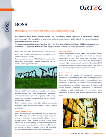 BOSS BOSS Rozwiązanie do tworzenia optymalnej sieci logistycznej Czy zadaliście sobie kiedyś Państwo pytanie, czy zaopatrujecie swoich odbiorców z optymalnego centrum dystrybucyjnego? Albo czy sądzicie, że lepiej byłoby ulokować swoje magazyny gdzieś indziej? Czy macie może nadmiar przestrzeni magazynowej po fuzji? W takich sytuacjach idealnym rozwiązaniem dla Twojej firmy jest aplikacja BOSS firmy ORTEC. Przy pomocy tego systemu ORTEC wypracuje dla Państwa firmy najlepszą strategię tworzenia lub restrukturyzacji sieci logistycznej. BOSS stworzony został przy współpracy z firmą z sektora Proces planowania paliwowego do planowania zaopatrzenia stacji paliwowych Oprócz analizowania bieżącej sytuacji jest również możliwe z różnych rozlewni i rafinerii. wyliczanie planów na przyszłość. Co zrobić ze zbędnymi Przy pomocy tego systemu ORTEC bada, które stacje paliw muszą być zaopatrywane z których magazynów tak, by uzyskać najniższy poziom kosztów. magazynami po fuzji? Czy należy znowu przypisać swoich odbiorców do magazynów? Co się stanie, jeśli zmienisz terminy dostawy? Wprowadzenie różnych scenariuszy do aplikacji BOSS jest łatwe i umożliwia sprawdzenie konsekwencji, które wynikną z decyzji strategicznych opartych na tych scenariuszach. Różne scenariusze BOSS może być używany do wyznaczenia optymalnego rozwiązania dla konkretnej sytuacji. Może być ona wykorzystana jako punkt wyjścia, mogą być również tworzone całkowicie nowe scenariusze. Możliwe jest, że wyliczone rozwiązanie nie będzie satysfakcjonujące ze względów praktycznych. W takiej sytuacji można Obecnie BOSS daje możliwość zamodelowania całego łańcucha dostaw oraz sieci logistycznych, wykonując obliczenia od miejsca wytworzenia poprzez jeden lub więcej wyliczyć scenariusze alternatywne i obserwować wynikające z nich konsekwencje. W ten sposób można zdecydować o wyborze drogi rozwoju łańcucha dostaw Waszej firmy. magazynów pośrednich/przeładunkowych aż do miejsca przeznaczenia produktu. BOSS rozróżnia obiekty takie jak: miejsca wytwarzania, magazyny, centra dystrybucyjne, sortownie, węzły i miejsca przeładunku. Analiza sytuacji bieżącej BOSS daje rozwiązanie przy określaniu strategii logistycznej firmy. Powodami do analizy bieżącej strategii mogą być zmiany w sieci dróg, zwiększenie ilości odbiorców czy też zmiana rynków zbytu. System pokazuje wąskie gardła i możliwości w sieci dystrybucji. Następnie można analizować wiele wariantów i wybrać najbardziej odpowiedni. Może to być np. zmiana tras dostawy, otwarcie nowych lub zamknięcie istniejących magazynów czy też centrów dystrybucyjnych. PROFESJONALIŚCI W PLANOWANIU Co może zrobić BOSS? Raporty • określić optymalną ilość, wielkość i lokalizację obiektów Jest oczywiste, że polityka strategiczna firmy musi być oparta na rzetelnych wyliczeniach. BOSS ma szereg raportów zarządczych każdego rodzaju • wyznaczyć główne punkty w każdym obszarze sprzedaży przeznaczonych do tego celu. BOSS może wyliczać kluczowe • wyliczyć efekt synergii przy integracji sieci dystrybucyjnych wskaźniki, takie jak: wielkość pojedynczej dostawy na 1 odbiorcę • wyliczać wskaźniki KPI takie jak: całkowite koszty lub na 1 centrum dystrybucyjne, ilość tras i punktów na trasie oraz dystrybucji, koszty jednostkowe, średnia wielkość dostawy na łączne koszty. Wskaźniki te mają wielkie znaczenie przy odbiorcę podejmowaniu kluczowych decyzji. • znaleźć odpowiedzi na pytania „co-jeśli” Prezentacja wyników Konsekwencje zmian w Waszej sieci dystrybucyjnej wyświetlane są w postaci wykresu, pokazując nie tylko w postaci liczbowej ale również graficznej bezpośrednie różnice pomiędzy scenariuszami. Naciskając klawisz można dodać lub usunąć informacje z wykresu zależnie od pożądanego w danej sytuacji poziomu szczegółowości. Łatwy import danych BOSS ma interfejs do łatwego importu danych z Twojej bazy danych lub z arkuszy Excel. Co BOSS uwzględnia w obliczeniach? Przy obliczaniu optymalnych lokalizacji i przepływu (transportu) towarów BOSS bierze pod uwagę m.in.: • zamówienia i ilość dostaw do odbiorców końcowych • dostępność produktów w różnych lokalizacjach • koszty produkcji, przeładunku, dostawy, dystrybucji i administracyjne • pojemność każdego obiektu • odległości i czasy jazdy pomiędzy różnymi lokalizacjami na podstawie map cyfrowych • maksymalne czasy dostawy pomiędzy wszystkimi punktami Kto z tego korzystał przed Tobą? Od szeregu lat ekspertyzy ORTEC i BOSS wykorzystywane są przez takie firmy jak: TNT, BP, DHL oraz ACR Logistics. Dalsze informacje Potrzebujesz więcej informacji? Skontaktuj się z nami aby zorganizować niezobowiązujące spotkanie. Zespół naszych konsultantów z przyjemnością zademonstruje nasze rozwiązania do zaawansowanego planowania (APS) i związane z tym usługi eksperckie. . w łańcuchu • stałe i zmienne czasy załadunku i rozładunku dla każdej lokalizacji • dostępną flotę pojazdów ORTEC - P.O. Box 490 - 2800 AL Gouda - Tel. +31 (0)182 540 500 - www.ortec.com - [email protected]