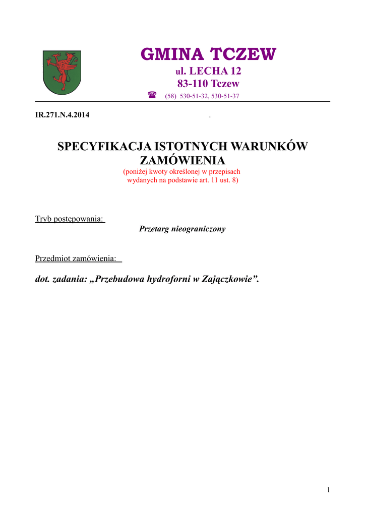 GMINA TCZEW ul. LECHA 12 83-110 Tczew IR.271.N.4.2014 (58) 530-51-32, 530-51-37 . SPECYFIKACJA ISTOTNYCH WARUNKÓW ZAMÓWIENIA (poniżej kwoty określonej w przepisach wydanych na podstawie art. 11 ust. 8) Tryb postępowania: Przetarg nieograniczony Przedmiot zamówienia: dot. zadania: „Przebudowa hydroforni w Zajączkowie”. 1 Postępowanie zostało wszczęte i prowadzone jest zgodnie z ustawą Prawo zamówień publicznych z dnia 29 stycznia 2004 roku (Dz. U. z 2013r. poz. 907 ze zmianami) zwanej dalej ustawą. 1. NAZWA I ADRES ZAMAWIAJĄCEGO Gmina Tczew reprezentowana przez Wójta z siedzibą w Tczewie (83-110), ul. Lecha 12, woj. pomorskie 2.TRYB UDZIELENIA ZAMÓWIENIA Postępowanie prowadzone jest w trybie przetargu nieograniczonego na podstawie art. 10 ust. 1 w powiązaniu z art. 39 ustawy, którego wartość nie przekracza kwoty określonej w przepisach wydanych na podstawie art. 11 ust. 8. 3.OPIS PRZEDMIOTU ZAMÓWIENIA Przedmiotem zamówienia jest przebudowa hydroforni w Zajączkowie. Zadanie polega na usunięciu ubytków tynku na elewacji budynku, usunięciu zawilgotnienia ścian oraz usunięciu ubytków farby wewnątrz budynku. Szczegółowy zakres prac przedstawiony został w przedmiarze robót załączonym do SIWZ. Wykonawca zobowiązany jest do zapoznania się z przedmiotem zamówienia oraz zawarcia w cenie oferty wszystkich kosztów za roboty niezbędne do prawidłowego ich wykonania, zgodnie z technologią robót określoną Polską Normą. Zaleca się dokonanie wizji lokalnej terenu, który zostanie objęty umową. Wykonawca zobowiązany jest do wykonania robót budowlanych zgodnie ze sztuką budowlaną, obowiązującymi przepisami i normami oraz przy zachowaniu przepisów BHP, przy maksymalnym ograniczeniu uciążliwości prowadzenia robót. Wykonawca gwarantuje także wykonanie przedmiotu zamówienia pod kierownictwem osób posiadających wymagane przygotowanie zawodowe do pełnienia samodzielnych funkcji technicznych w budownictwie. Wykonawca zapewnienia materiały, sprzęt i urządzenia niezbędne do wykonania przedmiotu umowy, posiadające aktualne atesty i certyfikaty pozwalające na ich stosowanie. Transport materiałów na plac budowy oraz dostarczenie i eksploatacja maszyn i urządzeń obciążają Wykonawcę. Wykonawca zabezpiecza teren robót mając w szczególności na względzie mienie Zamawiającego i własne. Wykonawca zobowiązany jest na własny koszt zabezpieczyć zdemontowane urządzenia, sprzęt oraz materiały. Wykonawca w trakcie wykonywania robót ponosi odpowiedzialność za bezpieczeństwo swoich pracowników oraz innych osób znajdujących się w obrębie przekazanego placu budowy z tytułu prowadzonych robót. Wykonawca zobowiązany jest do ubezpieczenia się od OC w zakresie prowadzonej działalności gospodarczej. 2 Wykonawca zapewnia we własnym zakresie wywóz i utylizację odpadów budowlanych (np. śmieci, gruz i inne), co musi zostać potwierdzone w dokumentacji odbiorowej. Wykonawca przed przystąpieniem do wykonywania robót stanowiących przedmiot zamówienia zainstaluje liczniki zużycia wody i liczniki zużycia energii (jeżeli będzie to konieczne). Rozliczenie Wykonawcy z tytułu zużycia wody i energii nastąpi po odbiorze robót na podstawie wskazań zainstalowanych liczników. Podpisanie przez strony bez zastrzeżeń Końcowego Protokołu Odbioru uważa się za termin wykonania robót. Jeżeli w trakcie odbioru zostaną ujawnione wady przedmiotu odbioru lub jego niekompletność, strony wpiszą je do Końcowego Protokołu Odbioru i wyznaczą termin do ich usunięcia. W takiej sytuacji za dzień końcowego odbioru przyjmuje się dzień, w którym strony podpisały Protokół Odbioru Usunięcia Wad. Po zakończeniu robót, ale przed ostatecznym odbiorem przez Zamawiającego Wykonawca zobowiązany jest do uporządkowania terenu budowy wraz z terenem przyległym i doprowadzenia ich do stanu, jaki był przed rozpoczęciem robót. Na dzień zgłoszenia gotowości do odbioru końcowego przedmiotu umowy, Wykonawca przekaże Zamawiającemu w szczególności niżej wymienione dokumenty: a) oświadczenie kierownika budowy o zgodności wykonania przedmiotu umowy zgodnie z przepisami i normami, b) oświadczenie o doprowadzeniu do należytego stanu technicznego terenu budowy i terenów przyległych, c) gwarancje i atesty producentów na wbudowane materiały i zamontowane urządzenia, d) protokoły badań i sprawozdań (np. badania instalacji elektrycznej, odbioru kominów dymnych i wentylacyjnych, natężenia światła itp.), jeśli badania są wymagane, e) inwentaryzację geodezyjną powykonawczą wykonanych robót w ilości 2 egz. złożoną do Powiatowego Zasobu Geodezyjno-Kartograficznego w Tczewie. Po wykonaniu przez Wykonawcę robót przewidzianych niniejszą SIWZ Zamawiający dokona ich odbioru. Celem odbioru jest sprawdzenie należytego wykonania tych robót, tzn. zgodnie z SIWZ oraz przedmiarem robót. Wykonawca zobowiązany jest do skalkulowania ceny za przedmiot zamówienia z należytą starannością. Przedmiar robót stanowi materiał pomocniczy przy kalkulowaniu ceny. Wykonawca zobowiązany jest udzielić gwarancji na swoje roboty na okres 3 lat od dnia odbioru inwestycji przez Zamawiającego, a także na zamontowane urządzenia zgodnie z gwarancją udzieloną przez producenta. Wykonawca zobowiązany jest ująć w swej wycenie wszelkie koszty związane ze sporządzeniem i wykonaniem dokumentacji powykonawczej w 2 egz. (np. pomiar powykonawczy, atesty, aprobaty, itp). 3 W przypadku zatrudnienia podwykonawców Wykonawca będzie ponosił pełną odpowiedzialność wobec Zamawiającego i osób trzecich za działania i zaniechania podwykonawców, jak również za jakość wykonanych przez nich robót zgodnie z zasadami opisanymi w rozdziale 25 niniejszej SIWZ. Ponieważ obowiązującym wynagrodzeniem jest wynagrodzenie ryczałtowe, kosztorys ofertowy jest jedynie dokumentem, który będzie wykorzystywany do obliczenia należnego wy