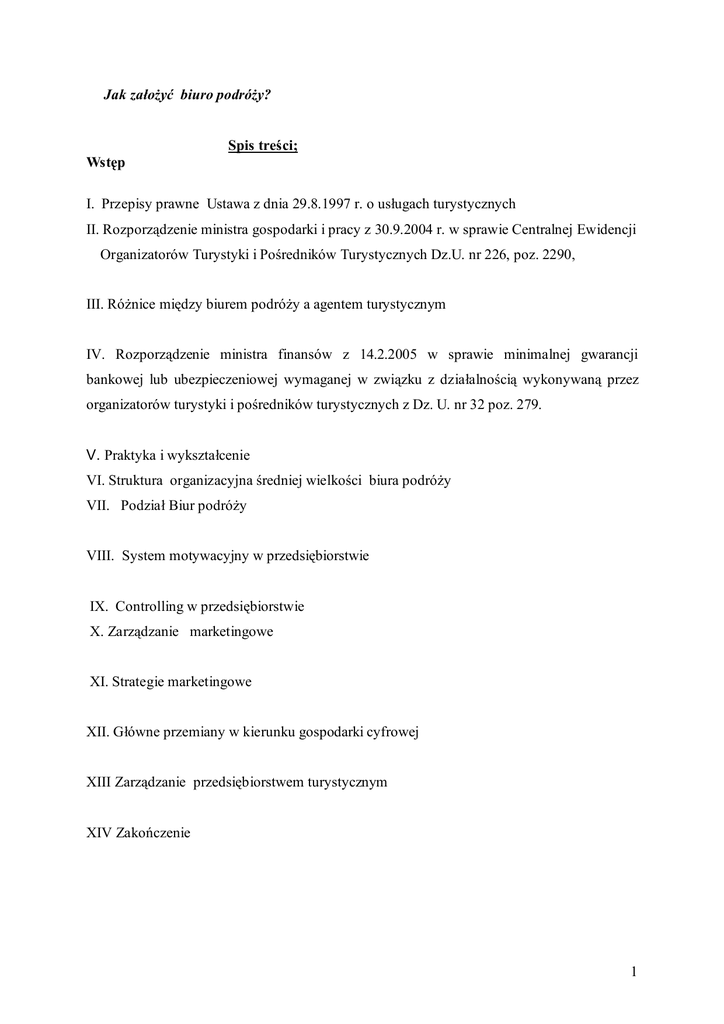 Jak załoŜyć biuro podróŜy? Spis treści; Wstęp I. Przepisy prawne Ustawa z dnia 29.8.1997 r. o usługach turystycznych II. Rozporządzenie ministra gospodarki i pracy z 30.9.2004 r. w sprawie Centralnej Ewidencji Organizatorów Turystyki i Pośredników Turystycznych Dz.U. nr 226, poz. 2290, III. RóŜnice między biurem podróŜy a agentem turystycznym IV. Rozporządzenie ministra finansów z 14.2.2005 w sprawie minimalnej gwarancji bankowej lub ubezpieczeniowej wymaganej w związku z działalnością wykonywaną przez organizatorów turystyki i pośredników turystycznych z Dz. U. nr 32 poz. 279. V. Praktyka i wykształcenie VI. Struktura organizacyjna średniej wielkości biura podróŜy VII. Podział Biur podróŜy VIII. System motywacyjny w przedsiębiorstwie IX. Controlling w przedsiębiorstwie X. Zarządzanie marketingowe XI. Strategie marketingowe XII. Główne przemiany w kierunku gospodarki cyfrowej XIII Zarządzanie przedsiębiorstwem turystycznym XIV Zakończenie 1 Wstęp; Zanim załoŜysz biuro podróŜy zastanów się dlaczego chcesz działać w branŜy turystycznej, czy chcesz być organizatorem turystyki czy agentem turystycznym a jeŜeli organizatorem imprez i usług turystycznych to wyjazdowych, dla Polaków w kraju i za granicą, czy przyjazdowych dla gości zagranicznych odwiedzających Polskę a moŜe chcesz mieć dwa działy turystyki wyjazdowej i turystyki przyjazdowej? Czy marzy Ci się biuro wydające co roku katalogi; - imprez wypoczynkowych z pobytem w kraju nad morzem, w górach, nad jeziorami i w ciepłych bliskich i dalekich krajach, na wyspach, - imprez krajoznawczych po Polce dla szkół, gości zagranicznych i za granicą dla turystów polskich, szkół i instytucji, - imprez turystyki kwalifikowanej w kraju i za granicą, - rejsów po rzekach n. p. po Nilu, po morzach , wokół wysp, do krajów dla nas egzotycznych - pobytów sanatoryjnych w uzdrowiskach w kraju i na świecie, - pielgrzymek? Jeśli chcesz organizować wycieczki dla gości zagranicznych to z przekonaniem iŜ Polska; ma korzystne połoŜenie, w środku Europy, włączona w strukturę Unii Europejskiej, ma duŜy potencjał kulturowy, bardzo dobrze zachowane środowisko naturalne, jest wiele atrakcji dla zwiedzających i wiele moŜliwości do wypoczynku równieŜ czynnego dla turystów. 2 Musisz mieć świadomość iŜ na turystykę rzutuje wiele dziedzin począwszy od transportu, ochrony środowiska, komunikacji, atrakcji turystycznych, infrastruktury oraz jaki jest program państwa na najbliŜsze lata i w przypadku turystyki wyjazdowej za granicę jak wpływają negatywnie tworząc barierę rozwoju wydarzenia zewnętrzne takie jak katastrofy komunikacyjne, budowlane, na skutek działań niszczycielskich przyrody w tym powodzie, trzęsienia ziemi, huragany, lawiny, ataki terrorystyczne. Musi towarzyszyć Ci myśl o ryzyku, by dobrze się zabezpieczyć a przede wszystkim ubezpieczyć firmę i swoich turystów. W takich przypadkach występują nagminnie anulacje rezerwowanych wyjazdów. Działanie siły wyŜszej, nikt nie zawinił a jednak będą powaŜne straty, co z zaliczkami przekazanymi kontrahentom, gestorom bazy, przewoźnikom? Wojna przed laty na Bałkanach w byłej Jugosławii doprowadziła do bankructwa wiele biur podróŜy z powodu braku zainteresowania wyjazdami do Grecji, Turcji, w sąsiadujących państwach, gdzie biura wcześniej zakontraktowały bazę. KaŜde zamieszki czy to w Stambule, Salonikach, Atenach, poŜary niedawno na Peloponezie, ataki terrorystyczne w Madrycie, w Izraelu wpływały bardzo negatywnie na turystykę na wiele miesięcy. DuŜa firma – duŜe ryzyko. Mała firma ryzyko zdecydowanie mniejsze. Rynek turystyczny odróŜnia się od innych, ma wiele elementów składowych; miejsce pobytu turysty, środek transportu, usługi Ŝywieniowe, program wycieczki, usługi pilota i przewodnickie, ubezpieczenia. Ludzie mają potrzeby zapełnienia czasu wolnego, realizacji wypoczynku i chęci poznania świata, kultur, krajobrazów, przeŜycia przygody. JeŜeli rząd przyjął plan rozwoju i w scenariuszu „ ostroŜnym” ze względu na kryzys gospodarek świata przyjmuje realizację podróŜy Polaków w ilości 48,1 mln po Polsce w 2015 r. i dalszy wzrost turystyki krajowej o 5% rocznie do 2020 r. to warto działać w tej branŜy. Dochody sektorów gospodarki turystycznej powinny wzrosnąć do 2015 r. o 33,6 mld. 3 t. j. o 48,8 % a wydatki cudzoziemców wzrosną o 11, 6 mld czyli 72,8 % w stosunku do 2007r. Wydatki państwa na turystykę do 2015 r. / dane z rachunku satelitarnego turystyki dla Polski będą na poziomie 4, 3 mld zł czyli wzrost o 1,4 mld zł tj. o 48,3% w stosunku 2007 r. to następny argument aby otworzyć biuro podróŜy. Przyjrzeć naleŜy się jeszcze konkurencji zwłaszcza duŜym firmom z zagranicy osadzonym w Polsce. Warto sprzedawać za prowizję ich imprezy. Mają duŜe moŜliwości, bogatą ofertę. NaleŜy teŜ wyciągać wnioski iŜ z prawie 4 tys. firm przed kilku lat pozostało 2900 co oznacza iŜ 1/3 sobie nie poradziła na rynku. Zdarzają się teŜ bankructwa z winy nieuczciwych właścicieli. JeŜeli ma powstać biuro podróŜy z prawdziwego zdarzenia to właściciele powinni być pasjonatami turystyki i rekreacji, najlepiej z wykształceniem w tej dziedzinie, z praktyką i zatrudnić powinni wykwalifikowaną kadrę. Ludzie ci przede wszystkim z pasją do krajoznawstwa, z umiłowaniem do podróŜy, do turystyki kwalifikowanej do poznania świata oprócz miłej aparycji, dobrego zdrowia psychiczno-fizycznego powinni mieć takie cechy charakteru jak uczciwość, kulturę osobistą, witalność, mądrość, zdrowy rozsądek, roztropność, takt, wyobraźnie i łatwość w nawiązywaniu kontaktów. Ludzie z turystyki się rozumieją, mają łatwość w podejmowaniu trafnych decyzji a kontakty z kontrahentami owocują wieloletnią współpracą, moŜna rzec przyjaźnią. JeŜeli jesteś młodym człowiekiem, po studiach z turystyki al