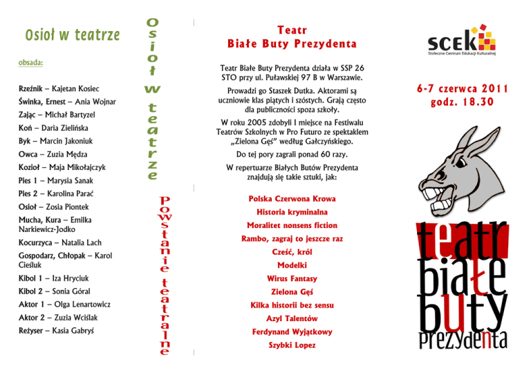 | obsada: Teatr Białe Buty Prezydenta działa w SSP 26 STO przy ul. Puławskiej 97 B w Warszawie. Rzeźnik – Kajetan Kosiec Prowadzi go Staszek Dutka. Aktorami są uczniowie klas piątych i szóstych. Grają często dla publiczności spoza szkoły. Świnka, Ernest – Ania Wojnar Zając – Michał Bartyzel W roku 2005 zdobyli I miejsce na Festiwalu Teatrów Szkolnych w Pro Futuro ze spektaklem „Zielona Gęś” według Gałczyńskiego. Koń – Daria Zielińska Byk – Marcin Jakoniuk Owca – Zuzia Mędza Do tej pory zagrali ponad 60 razy. Kozioł – Maja Mikołajczyk Pies 1 – Marysia Sanak Pies 2 – Karolina Parać W repertuarze Białych Butów Prezydenta znajdują się takie sztuki, jak: | Polska Czerwona Krowa Osioł – Zosia Piontek Historia kryminalna Mucha, Kura – Emilka Narkiewicz-Jodko Moralitet nonsens fiction Rambo, zagraj to jeszcze raz Kocurzyca – Natalia Lach Cześć, król Gospodarz, Chłopak – Karol Cieśluk Modelki Kibol 1 – Iza Hryciuk Wirus Fantasy Kibol 2 – Sonia Góral Zielona Gęś Aktor 1 – Olga Lenartowicz Kilka historii bez sensu Aktor 2 – Zuzia Wciślak Azyl Talentów Reżyser – Kasia Gabryś Ferdynand Wyjątkowy Szybki Lopez | „Nawrócenie lansera” obsada: Mietkochodzik – Michał Cieślak Artur – Franek Rybarczyk Bronka – Dorota Romanowicz Steff, Prymus – Antek Kosiński Elcia, Klientka 2 – Zosia Zatorska Osioł w teatrze to bajka zwierzęca. Tytułowy Osioł wiedzie życie przeciętnego bydlęcia – wszystko wydaje mu się okay, bo ma czym napchać bebechy. Kłopot zaczyna się od dziwnego snu: naszemu bohaterowi wyświetla się idealny teatr. Gdy otwiera oczy, nie umie już uwolnić się od marzenia o nim. Wyrusza w drogę. Dzielnie wędruje przez świat, nieraz masując obolałe miejsca pod ogonem. Jego wędrówka przypomina te, które odbywali inni młodzieńcy: Pinokio albo Koziołek Matołek. Czy jego wędrówka okaże się sensowna? Czy uda mu się dotrzeć do wyśnionego teatru? Michała Cieślaka z 6B – z humorem opowiedziana historia o problemach rodzinnych wywołanych żądaniami dorastającego Artura, chcącego mieć nowe markowe buty. „Próba” Antka Kosińskiego z 6A – opowieść o sposobach, jakie stosują uczniowie, by przetrwać na lekcjach w szkole. Przy okazji poczujemy zapach pewnej popularnej zupki błyskawicznej. Marciol – Maciek Chmielewski Sprzedawca, Prezydent Komor – Maciek Chodkowski Nauczyciel – Cecylia Kłosińska Hanka – Dominika Paluch Heniek, Tajemniczy Gość – Janek Zawadowski Aktorka 1, Lekarz, Klientka 1 – Zosia Neuber Aktorka 2 – Kornelia Kennedy Powstanie teatralne, czyli skecze autorskie uczniów – powstały jako „praca domowa” na zajęciach teatralnych dla klas 6-tych. Okazało się, że niektórzy aktorzy mają własne historie do opowiedzenia i co najważniejsze – potrafią to napisać. Powstały więc sztuki: „Amerykańskie spodnie” i „W oczekiwaniu na rolę” 2 skecze Staszka Dutki (też uczeń – tyle że na etacie) – pierwszy parodiuje reklamę, a drugi pokazuje emocje kobiet oczekujących tajemniczego gościa. Scenografia: Anna Kordys