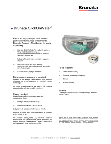 Brunata ClickOnWater+ Elektroniczny nadajnik radiowy dla jednostrumieniowego wodomierza Brunata Sensus - Residia Jet do wody użytkowej. • Brunata ClickOnWater to nadajnik radiowy, który może być stosowany na jednostrumieniowym wodomierzu Brunata Sensus - Residia Jet • Łatwe nakładanie na wodomierz – system click-on • Może być instalowany na nowych wodomierzach lub wodomierzach wcześniej zainstalowanych Radio telegram Co dwie minuty wysyła telegram • Okres zużycia wody • Ostatnie okresy zużycia wody • Status • Numer licznika • + Dane przechowywane w pamięci Odczyty z pierwszego i piętnastego dnia każdego miesiąca są przechowywane w pamięci modułu radiowego. W sumie przechowywane są dane z 52 okresów odpowiadających danym z 26 miesięcy. Baterie Licznik jest wyposażony w baterię litową o trwałości 10 lat + 1 rok. Zalety pamięci Dla każdego okresu przechowywane są następujące dane: • Bieżące okresy zużycia wody • Poprzednie okresy zużycia wody Zużycie wody jest zapamiętywane w litrach. Roczne zużycie jest przechowywane w pamięci przez okres 10 lat. W pamięci zapisywane są również wszelkie manipulacje lub uszkodzenia, jakim poddany jest + moduł Brunata ClickOnWater wraz z informacją dotyczącą daty oraz czasu zdarzenia. Brunata jest w 100% firmą duńską. Posiadamy ponad 85-letnie doświadczenie w projektowaniu i produkcji podzielników kosztów ciepła, oraz w przeprowadzaniu rozliczeń. Stosujemy system kontroli jakości spełniający warunki normy EN ISO 9001. Prosimy o skontaktowanie się z nami w sprawie dalszych informacji o naszych produktach. Brunata Sp. z o.o.  tel +48 32 205 52 12  fax +48 32 205 52 13  www.brunata.pl Dane techniczne Nadajnik: Częstotliwość: 433MHz Modulacja: FSK Częstotliwość nadawania: Nadajnik Brunata ClickOnWater + Ver2 wysyła telegram co dwie minuty. Należy pamiętać, że aby otrzymywać telegramy z nadajnika ClickOnWater+ trzeba mieć odpowiedni typ odbiornika. Odbiornik: Stopień ochrony: BrunataNet RS-485 dla Brunata ClickOnWater+ lub BrunataNet RS-485 ver2 dla Brunata ClickOnWater+ ver2. IP52 Wymiary: Wymiary i waga: 36,17 x 62,12 mm, waga: ok. 62 g Bateria: 2/3 AA baterie litowe o trwałości 10 lat + 1 rok. Brunata Sp. z o.o.  tel +48 32 205 52 12  fax +48 32 205 52 13  www.brunata.pl