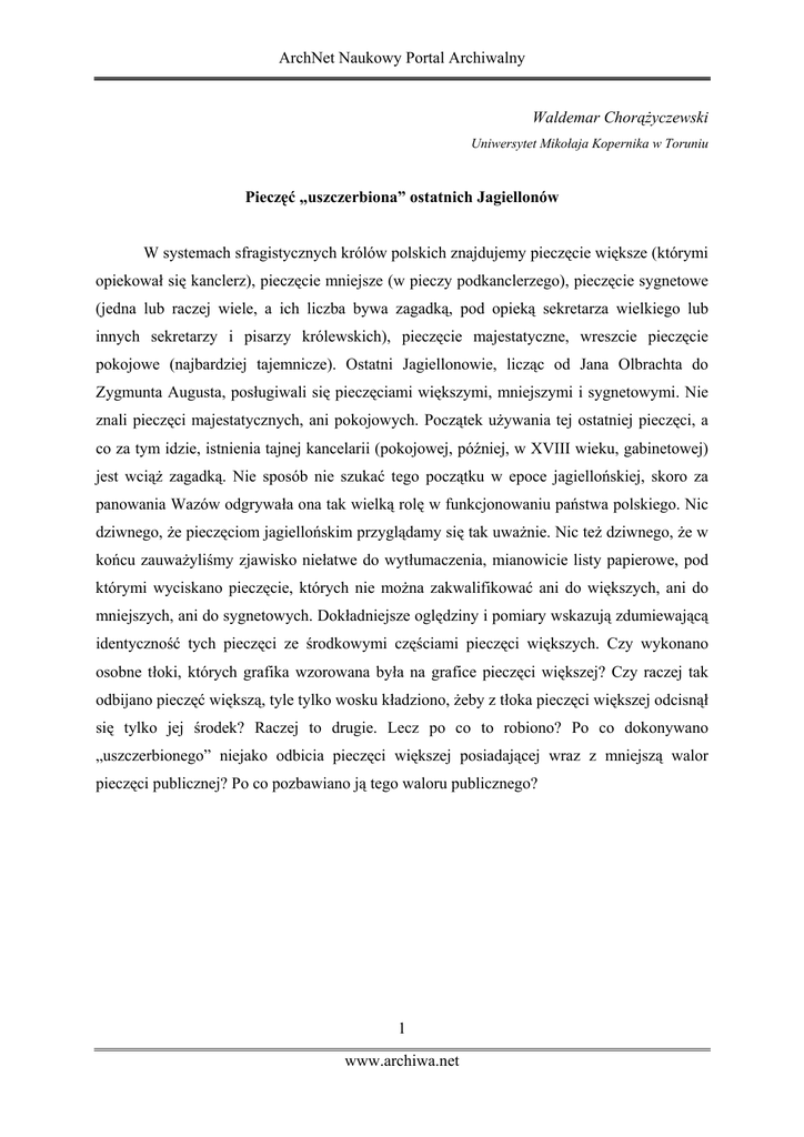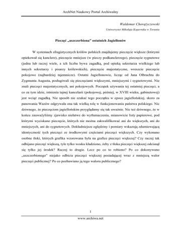 ArchNet Naukowy Portal Archiwalny Waldemar Chorążyczewski Uniwersytet Mikołaja Kopernika w Toruniu Pieczęć „uszczerbiona” ostatnich Jagiellonów W systemach sfragistycznych królów polskich znajdujemy pieczęcie większe (którymi opiekował się kanclerz), pieczęcie mniejsze (w pieczy podkanclerzego), pieczęcie sygnetowe (jedna lub raczej wiele, a ich liczba bywa zagadką, pod opieką sekretarza wielkiego lub innych sekretarzy i pisarzy królewskich), pieczęcie majestatyczne, wreszcie pieczęcie pokojowe (najbardziej tajemnicze). Ostatni Jagiellonowie, licząc od Jana Olbrachta do Zygmunta Augusta, posługiwali się pieczęciami większymi, mniejszymi i sygnetowymi. Nie znali pieczęci majestatycznych, ani pokojowych. Początek używania tej ostatniej pieczęci, a co za tym idzie, istnienia tajnej kancelarii (pokojowej, później, w XVIII wieku, gabinetowej) jest wciąż zagadką. Nie sposób nie szukać tego początku w epoce jagiellońskiej, skoro za panowania Wazów odgrywała ona tak wielką rolę w funkcjonowaniu państwa polskiego. Nic dziwnego, że pieczęciom jagiellońskim przyglądamy się tak uważnie. Nic też dziwnego, że w końcu zauważyliśmy zjawisko niełatwe do wytłumaczenia, mianowicie listy papierowe, pod którymi wyciskano pieczęcie, których nie można zakwalifikować ani do większych, ani do mniejszych, ani do sygnetowych. Dokładniejsze oględziny i pomiary wskazują zdumiewającą identyczność tych pieczęci ze środkowymi częściami pieczęci większych. Czy wykonano osobne tłoki, których grafika wzorowana była na grafice pieczęci większej? Czy raczej tak odbijano pieczęć większą, tyle tylko wosku kładziono, żeby z tłoka pieczęci większej odcisnął się tylko jej środek? Raczej to drugie. Lecz po co to robiono? Po co dokonywano „uszczerbionego” niejako odbicia pieczęci większej posiadającej wraz z mniejszą walor pieczęci publicznej? Po co pozbawiano ją tego waloru publicznego? 1 www.archiwa.net ArchNet Naukowy Portal Archiwalny Pieczęć większa koronna króla Zygmunta Starego Dotychczasowe badania jedynie marginalnie wskazywały na pojawianie się na dokumentach królewskich doby jagiellońskiej pieczęci zwanej przeze mnie dalej „uszczerbioną” (przez analogię do „uszczerbionych” herbów znanych heraldyce). Marian Gumowski podał, że kancelaria Zygmunta Starego, w przypadku odbijania pieczęci większej przez papier, wykorzystywała czasem pieczęć bez napisu otokowego albo sam środek czyli tarczę z orłem1. Kancelaria Zygmunta Augusta, podobnie jak jego ojca, używała również, bywało, samego tylko środka pieczęci większej2. Czy zjawisko to pojawiło się za panowania Zygmunta Starego? Irena Sułkowska-Kurasiowa, pisząc o dwóch sygnetach Aleksandra Jagiellończyka zauważyła, że „druga pieczęć sygnetowa Aleksandra [...] ma kształt tarczy o pięciu polach”3, co rodzi podejrzenie, że chodzi nie o sygnet, a o użycie środkowej części pieczęci większej. 1 M. Gumowski, Pieczęcie królów polskich, Kraków 1910, s. 25-27; Z. Piech, Monety, pieczęcie i herby w systemie symboli władzy Jagiellonów, Warszawa 2003, s. 77-80. 2 M. Gumowski, dz. cyt., s.27. 3 I. Sułkowska-Kurasiowa, Polska kancelaria królewska w latach 1447-1506, Wrocław-Warszawa-Kraków 1967, s.75. 2 www.archiwa.net ArchNet Naukowy Portal Archiwalny Pieczęć „uszczerbiona” Zygmunta Starego i centralne pole jego pieczęci większej Nowych danych dostarcza analiza dokumentów królewskich z początku XVI wieku. Podane niżej informacje niekoniecznie wyczerpują liczbę wystąpień pieczęci „uszczerbionych” w latach 1501-1515, dotyczą jednak reprezentatywnej próbki i dobrze obrazują skalę i natężenie zjawiska. Ważne jest tutaj rozróżnienie pomiędzy dokumentami będącymi wynikiem podejmowania przez króla decyzji po konsultacji z radą (wyposażonych w formułę relacyjną) oraz wystawianych w imieniu króla działającego samodzielnie (dokumenty, mandaty i listy z formułami dominus rex per se, komisji, ad mandatum) Zaledwie w czterech przypadkach w okresie od 20 IV 1505 do 8 IX 1507 pieczęć „uszczerbiona” znalazła się na dokumentach papierowych o uproszczonym formularzu wychodzących pod relacją kanclerza Jana Łaskiego4. W przypadku króla działającego z radą niemal nie posługiwano się zatem niepubliczną pieczęcią „uszczerbioną”. Nie dziwi to, gdyż dokumenty z formułą relacyjną powinny zyskać walor publiczny, a to gwarantowały tylko oficjalne pieczęcie koronne. Jeśli chodzi o drugą grupę dokumentów, to: • dokumenty Aleksandra Jagiellończyka z formułą dominus rex per se pieczętowane były pieczęcią „uszczerbioną” 11 razy5, natomiast z początkowego okresu panowania Zygmunta Starego 5 razy6; 4 Archiwum Państwowe w Gdańsku, 300,D/4,611, 300,D/5,655, 300,D/5,663; AP w Toruniu, Kat. I, 2697. 5 AP w Gdańsku, 300,D/4,574, 593, 595, 597, 615, 625, 631, 634, 635, 639, 640; Akta Aleksandra króla polskiego, wielkiego księcia litewskiego i t.d. (1501-1506), wyd. F. Papée, Kraków 1927, nr 319, 325, 328, 333. 6 AGAD, AZ 2999, k.29; AP w Gdańsku, 300,D/5,649, 656; AP w Toruniu, Kat. I, 2715, 2760. 3 www.archiwa.net ArchNet Naukowy Portal Archiwalny • dokumenty wyposażone w formułę commissio propria regie maiestatis z okresu panowania Aleksandra Jagiellończyka posiadały pieczęć „uszczerbioną” przynajmniej trzykrotnie7, z początku panowania zaś Zygmunta Starego (do roku 1515) 12 razy8; • dokumenty zaopatrzone formułą ad mandatum regie maiestatis wychodziły pod pieczęcią „uszczerbioną” w 10 przypadkach9; • dokumenty króla Aleksandra pozbawione formuł końcowych uwierzytelniono w dwóch przypadkach pieczęcią „uszczerbioną”10; z pierwszego okresu panowania Zygmunta Starego również dwukrotnie posłużono się środkową częścią pieczęci większej11. Z powyższego zestawienia wynika, iż pieczęć tzw. „uszczerbiona
