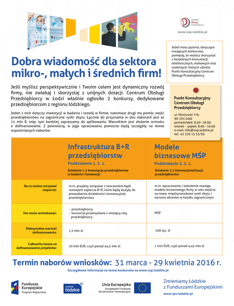www.cop.lodzkie.pl Jeżeli masz pytania, dotyczące trwających konkursów, pamiętaj, że możesz skorzystać z bezpłatnych konsultacji: telefonicznych, mailowych oraz osobistych, których udziela Punkt Konsultacyjny Centrum Obsługi Przedsiębiorcy Dobra wiadomość dla sektora mikro-, małych i średnich firm! Jeśli myślisz perspektywicznie i Twoim celem jest dynamiczny rozwój firmy, nie zwlekaj i skorzystaj z unijnych dotacji. Centrum Obsługi Przedsiębiorcy w Łodzi właśnie ogłosiło 2 konkursy, dedykowane przedsiębiorcom z regionu łódzkiego. Jeden z nich dotyczy inwestycji w badania i rozwój w firmie, natomiast drugi ma pomóc wejść przedsiębiorstwu na zagraniczne rynki zbytu. Łącznie do przyznania w obu naborach jest aż 11 mln €, więc tym bardziej zapraszamy do aplikowania. Warunkiem jest złożenie wniosku o dofinansowanie. Z pewnością, w jego opracowaniu pomocne będą szczegóły na temat wspomnianych naborów: Na co można otrzymać wsparcie: Kto może wnioskować: Maksymalna wartość dofinansowania: Całkowita kwota na dofinansowanie projektów: Punkt Konsultacyjny Centrum Obsługi Przedsiębiorcy ul. Moniuszki 7/9, 90-101 Łódź poniedziałek: 8.00 -18.00, wtorek - piątek: 8.00 - 16.00 e-mail: [email protected] tel.: 42 230 15 55/56 Infrastruktura B+R przedsiębiorstw Modele biznesowe MŚP Poddziałanie 1. 2. 1. Poddziałanie 2. 2. 1. Działanie 1.2 Inwestycje przedsiębiorstw w badania i innowacje Działanie 2.2 Internacjonalizacja przedsiębiorstw m.in. projekty związane z tworzeniem bądź rozwojem zaplecza B+R, które będą służyły do prowadzenia działalności innowacyjnej przedsiębiorstwa m.in. opracowanie i wdrożenie nowego modelu biznesowego firmy w celu wejścia na nowe, międzynarodowe rynki zbytu i wzrostu obrotów w handlu zagranicznym - przedsiębiorcy - konsorcja przemysłowe z wiodącą rolą przedsiębiorcy MŚP 1,5 mln zł 100 tys. zł 10 mln EUR, czyli ponad 44,5 mln zł 1 mln EUR, czyli ponad 4,45 mln zł Termin naborów wniosków: 31 marca - 29 kwietnia 2016 r. Szczegółowe informacje na temat konkursów na www.cop.lodzkie.pl Zmieniamy Łódzkie z Funduszami Europejskimi www.rpo.lodzkie.pl
