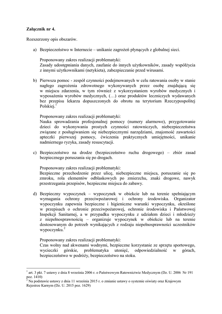 Załącznik nr 4. Rozszerzony opis obszarów. a) Bezpieczeństwo w Internecie – unikanie zagrożeń płynących z globalnej sieci. Proponowany zakres realizacji problematyki: Zasady udostępniania danych, zaufanie do innych użytkowników, zasady współżycia z innymi użytkownikami (netykieta), zabezpieczanie przed wirusami. b) Pierwsza pomoc - zespół czynności podejmowanych w celu ratowania osoby w stanie nagłego zagrożenia zdrowotnego wykonywanych przez osobę znajdującą się w miejscu zdarzenia, w tym również z wykorzystaniem wyrobów medycznych i wyposażenia wyrobów medycznych, (…) oraz produktów leczniczych wydawanych bez przepisu lekarza dopuszczonych do obrotu na terytorium Rzeczypospolitej Polskiej.1 Proponowany zakres realizacji problematyki: Nauka sprowadzania profesjonalnej pomocy (numery alarmowe), przygotowanie dzieci do wykonywania prostych czynności ratowniczych, niebezpieczeństwa związane z posługiwaniem się niebezpiecznymi narzędziami, znajomość zawartości apteczki pierwszej pomocy, ćwiczenia praktycznych umiejętności, unikanie nadmiernego ryzyka, zasady resuscytacji. c) Bezpieczeństwo na drodze (bezpieczeństwo ruchu drogowego) – zbiór zasad bezpiecznego poruszania się po drogach. Proponowany zakres realizacji problematyki: Bezpieczne przechodzenie przez ulicę, niebezpieczne miejsca, poruszanie się po zmroku, rola elementów odblaskowych po zmierzchu, znaki drogowe, nawyk przestrzegania przepisów, bezpieczne miejsca do zabawy. d) Bezpieczny wypoczynek – wypoczynek w obiekcie lub na terenie spełniającym wymagania ochrony przeciwpożarowej i ochrony środowiska. Organizator wypoczynku zapewnia bezpieczne i higieniczne warunki wypoczynku, określone w przepisach o ochronie przeciwpożarowej, ochronie środowiska i Państwowej Inspekcji Sanitarnej, a w przypadku wypoczynku z udziałem dzieci i młodzieży z niepełnosprawnością – organizuje wypoczynek w obiekcie lub na terenie dostosowanym do potrzeb wynikających z rodzaju niepełnosprawności uczestników wypoczynku.2 Proponowany zakres realizacji problematyki: Czas wolny nad akwenami wodnymi, bezpieczne korzystanie ze sprzętu sportowego, wycieczki górskie, problematyka utonięć, odpowiedzialność w górach, bezpieczeństwo w podróży, bezpieczeństwo na stoku. 1 art. 3 pkt. 7 ustawy z dnia 8 września 2006 r. o Państwowym Ratownictwie Medycznym (Dz. U. 2006 Nr 191 poz. 1410) 2 Na podstawie ustawy z dnia 11 września 2015 r. o zmianie ustawy o systemie oświaty oraz Krajowym Rejestrze Karnym (Dz. U. 2015 poz. 1629) e) Zagrożenia bezpieczeństwa w sytuacjach niespodziewanych, np. pożar, powódź, gradobicie – pośrednie lub bezpośrednie destrukcyjne oddziaływania na podmiot.3 Proponowany zakres realizacji problematyki: Sposób postępowania w sytuacjach niespodziewanych, zasady ewakuacji, współpraca ze służbami, metody unikania zagrożeń, f) Problematyka oszustw domowych - oszustwa mające na celu wyłudzenie pieniędzy lub wprowadzenie osoby w błąd w celu uzyskania z tego procederu korzyści materialnych. Proponowany zakres realizacji problematyki: Sposoby zabezpieczenia mieszkań i domów, metody działania przestępców, oszustwa skierowane do seniorów, oszustwa żywieniowe, problem nieuczciwych sprzedawców. g) Ochrona danych osobowych – regulacje prawne dotyczące tworzenia i posługiwania się zbiorami danych osobowych oraz pojedynczymi danymi. Za dane osobowe uważa się wszelkie informacje dotyczące zidentyfikowanej lub możliwej do zidentyfikowania osoby fizycznej.4 Proponowany zakres realizacji problematyki: Zagrożenia wynikające z publikacji danych osobowych, bezprawne udostępnianie danych osobowych, jednostki uprawnione do udostępniania danych osobowych. h) Problematyka uzależnień - uzależnienie od środków odurzających lub substancji psychotropowych to zespół zjawisk psychicznych lub somatycznych wynikających z działania środków odurzających lub substancji psychotropowych na organizm ludzki, charakteryzujący się zmianą zachowania lub innymi reakcjami psychofizycznymi i koniecznością używania stale lub okresowo tych środków lub substancji w celu doznania ich wpływu na psychikę lub dla uniknięcia następstw wywołanych ich brakiem. 5 Proponowany zakres realizacji problematyki: Zagrożenia wynikające z uzależnień, konsekwencje prawne wynikające z zażywania środków odurzających, problem dostępności szkodliwych substancji, metody leczenia, ośrodki pomocy dla osób uzależnionych. i) Bezpieczne środowisko – wiąże się z pojęciem „ochrona środowiska”, rozumianym jako podjęcie lub zaniechanie działań, umożliwiające zachowanie lub przywracanie równowagi przyrodniczej; ochrona ta polega w szczególności na: a) racjonalnym kształtowaniu środowiska i gospodarowaniu zasobami środowiska zgodnie z zasadą zrównoważonego rozwoju, b) przeciwdziałaniu zanieczyszczeniom, 3 Na podstawie internetowej „Propozycji zmian do MINISŁOWNIKA Biura Bezpieczeństwa Narodowego” Art. 6 ust. 1 ustawy z dnia 29 sierpnia 1997 r. o ochronie danych osobowych (Dz. U. z 2002 r. Nr 101, poz. 926 ze zm.) 5 Art. 4 pkt. 29 ustawy z dnia 29 lipca 2005 r. o przeciwdziałaniu narkomanii (Dz. U. z 2005 nr 179 poz. 1485) 4 c) przywracaniu elementów przyrodniczych do stanu właściwego;6 Proponowany zakres realizacji problematyki: Segregacja śmieci, oszczędzanie energii elektrycznej i wody, dokarmianie zwierząt, wyroby ekologiczne, odnawialne źródła energii j) Terroryzm – przestępstwo o charakterze terrorystycznym jest czyn zabroniony zagrożony karą pozbawienia wolności, której górna granica wynosi co najmniej 5 lat, popełniony w celu: 1. Poważnego zastraszenia wielu osób, 2. Zmuszenia organu władzy publicznej Rzeczypospolitej Polskiej lub innego państwa albo organu organizacji międzynarodowej do podjęcia lub zaniechania określonych czynności 3. Wywołania poważnych zakłóceń w ustroju lub gospodarc