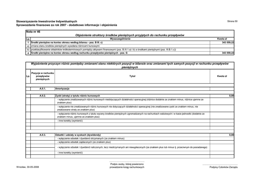 Stowarzyszenie Inwestrorów Indywidualnych Sprawozdanie finansowe za rok 2007 - dodatkowe informacje i objaśnienia Strona 50 Nota nr 46 Objaśnienie struktury środków pieniężnych przyjętych do rachunku przepływów Lp. 1 a) b) 4 Wyszczególnienie Środki pieniężne na koniec okresu według bilansu - poz. B III. c) zmiana stanu środków pieniężnych wywołana różnicami kursowymi przeklasyfikowanie składników krótkoterminowych pomiędzy aktywami finansowymi (poz. B.III.1.a) i b) a środkami pieniężnymi (poz. III.B.1.c)) Środki pieniężne na koniec okresu według rachunku przepływów pieniężnych - poz. G Kwota zł 343 559,22 343 559,22 Wyjaśnienie przyczyn różnic pomiędzy zmianami stanu niektórych pozycji w bilansie oraz zmianami tych samych pozycji w rachunku przepływów pieniężnych Lp. Pozycja w rachunku przepływów pieniężnych Tytuł A.II.1. Amortyzacja A.II.2. Zyski (straty) z tytułu różnic kursowych Kwota zł 0,00 - wyłączenie zrealizowanych różnic kursowych niedotyczących działalności operacyjnej (różnice dodatnie ze znakiem minus, różnice ujemne ze znakiem plus) - wyłączenie nie zrealizowanych różnic kursowych nie dotyczących działalności operacyjnej (nie zrealizowane zyski ze znakiem minus, nie zrealizowane straty ze znakiem plus) - wyłączenie różnic kursowych z tytułu wyceny środków pieniężnych zgromadzanych na rachunkach walutowych i w kasie jednostki (dodatnie ze znakiem minus, ujemne ze znakiem plus) - inne korekty (wymienić) A.II.3. Odsetki i udziały w zyskach (dywidendy) - wyłączenie odsetek i dywidend otrzymanych (ze znakiem minus) - wyłączenie odsetek zapłaconych (ze znakiem plus) 0,00 - wyłączenie odsetek i dywidend naliczonych, lecz nieotrzymanych ani niewypłaconych (ze znakiem plus lub minus tj. przeciwnym do posiadanego) - inne korekty (wymienić) Wrocław, 30-05-2008 ...................................................... Podpis osoby, której powierzono prowadzenie ksiąg rachunkowych ...................................................... Podpisy Członków Zarządu Stowarzyszenie Inwestrorów Indywidualnych Sprawozdanie finansowe za rok 2007 - dodatkowe informacje i objaśnienia Strona 51 Wyjaśnienie przyczyn różnic pomiędzy zmianami stanu niektórych pozycji w bilansie oraz zmianami tych samych pozycji w rachunku przepływów pieniężnych A.II.4. Zysk (strata) z działalności inwestycyjnej 0,00 - korekta z wiązana z zyskiem (ze znakiem minus) lub stratą (ze znakiem plus) na sprzedaży składników działalności inwestycyjnej - korekta związana z stratą (ze znakiem plus) na likwidacji składników działalności inwestycyjnej - korekty wynikająca z przekazania darowizn niepieniężnych składników działalności inwestycyjnej (ze znakiem plus) - korekty dotyczące ujawnionych nadwyżek (ze znakiem minus) i niedoborów (ze znakiem plus) inwentaryzacyjnych składników działalności inwestycyjnej - korekty dotyczące zdarzeń losowych (ze znakiem plus lub minus) - korekty dotyczące odpisów korygujących wartość składników aktywów trwałych oraz krótkoterminowych aktywów finansowych z tytułu trwałej utraty wartości i ich korekty (plus lub minus) - inne korekty (wymienić) A.II.5. Zmiana stanu rezerw - zmiana stanu według bilansu - korekta z tytułu zmiany stanu rezerw na odroczony podatek dochodowy utworzonych w ciężar kapitału (funduszu) własnego - inne korekty (wymienić) 0,00 0,00 A.II.6. Zmiana stanu zapasów - zmiana stanu według bilansu 0,00 0,00 - korekta wynikająca ze zmiany stanu zapasów z tytułu wkładu niepieniężnego otrzymanego lub przekazanego pod postacią składników aktywów obrotowych (zapasów) - inne korekty (wymienić) A.II.7. Wrocław, 30-05-2008 Zmiana stanu należności - zmiana stanu według bilansu, poz. A. III i B. II - korekta z tytułu zmiany stanu należności dotyczących działalności inwestycyjnej ...................................................... Podpis osoby, której powierzono prowadzenie ksiąg rachunkowych -3 777,98 -3 777,98 ...................................................... Podpisy Członków Zarządu Stowarzyszenie Inwestrorów Indywidualnych Sprawozdanie finansowe za rok 2007 - dodatkowe informacje i objaśnienia Strona 52 Wyjaśnienie przyczyn różnic pomiędzy zmianami stanu niektórych pozycji w bilansie oraz zmianami tych samych pozycji w rachunku przepływów pieniężnych - inne korekty ( wymienić) A.II.8. Zmiana stanu zobowiązań krótkoterminowych, z wyjątkiem pożyczek i kredytów - zmiana stanu według bilansu - korekta z tytułu zmiany stanu zobowiązań działalności inwestycyjnej - korekta z tytułu zmiany stanu zobowiązań działalności finansowej (leasingu finansowego) - korekta z tytułu zmiany stanu ZFŚS związana z odpisem z zysku na ten fundusz - korekta z tytułu zmiany stanu funduszu nagród z tytułu zadeklarowanych, a nie wypłaconych nagród z zysku - inne korekty (wymienić) 57 159,02 57 159,02 A.II.9. Zmiana stanu rozliczeń międzyokresowych - zmiana stanu według bilansu - czynne (wzrost stanu ze znakiem minus, zmniejszenie zez znakiem plus) - rozliczenia międzyokresowe przychodów (wzrost stanu ze znakiem plus, zmniejszenie ze znakiem minus) 4 857,29 4 857,29 1 767,29 3 090,00 - korekta dotycząca rozliczeń czynnych z tytułu odroczonego podatku dochodowego odnoszonego bezpośrednio na kapitał (fundusz) własny - korekta dotycząca rozliczeń międzyokresowych przychodów z tytułu zmiany stanu ujemnej wartości firmy w roku jej powstania - korekta dotycząca rozliczeń międzyokresowych z tytułu wartości darowizn niepieniężnych aktywów trwałych - korekta rozliczeń międzyokresowych przychodów z tytułu wartości dotacji w roku ich otrzymania - zmiana stanu wykazana w rachunku przepływów pieniężnych A.II.10. B.I.1. Wrocław, 30-05-2008 Inne korekty - 0,00 Zbycie wartości niematerialnych i prawnych oraz rzeczowych aktywów trwałych ...............................