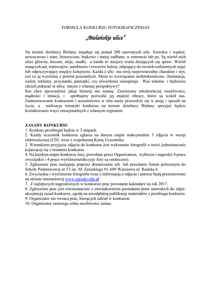 FORMUŁA KONKURSU FOTOGRAFICZNEGO „Bielańskie ulice” Na terenie dzielnicy Bielany znajduje się ponad 200 nazwanych ulic. Szerokie i wąskie, nowoczesne i stare, historyczne, bajkowe i mniej zadbane, w remoncie lub po. Są wśród nich ulice główne, boczne, aleje, zaułki, a każda to miejsce wielu dziejących się spraw. Wśród sunących aut, tramwajów, autobusów i rowerów ludzie, zdążający do swoich codziennych zajęć lub odpoczywający między kolejnymi. Każda z ulic ma swój niepowtarzalny charakter i styl, coś co ją wyróżnia z pośród pozostałych. Może to rozwiązanie architektoniczne, iluminacja, zieleń, reklamy, przystanki, pamiątki, czy oświetlenie zainspiruje Was właśnie i będziecie chcieli pokazać te ulicę innym z własnej perspektywy? Kto chce opowiedzieć jakąś historię ma szansę. Zawierzmy młodzieńczej wrażliwości, mądrości i intuicji, i spróbujmy pozwolić jej znaleźć obrazy, które są wokół nas. Zainteresowanie konkursem i uczestnictwo w nim może przerodzić się w pasję i sposób na życie, a realizacja tematyki konkursu na terenie dzielnicy Bielany sprzyjać będzie kształtowaniu więzi emocjonalnych z własnym regionem. ZASADY KONKURSU 1. Konkurs przebiegał będzie w 3 etapach. 2. Każdy uczestnik konkursu zgłasza na danym etapie maksymalnie 3 zdjęcia w wersji elektronicznej (CD) wraz z wypełnioną Kartą Uczestnika. 3. Warunkiem przyjęcia zdjęcia do konkursu jest wykonanie fotografii o treści jednoznacznie kojarzącej się z tematem konkursu. 4. Na każdym etapie konkursu Jury, powołane przez Organizatora, wybierze i nagrodzi 4 prace zwycięskie i 4 prace wyróżnione(decyzje Jury są ostateczne). 5. Zgłoszenie prac następuje poprzez dostarczenie ich lub przesłanie listem poleconym do Szkoły Podstawowej nr 53 im. M. Zaruskiego 01-689 Warszawa ul. Rudzka 6. 6. Zwycięskie i wyróżnione fotografie wraz z informacją o zdjęciu i autorze będą prezentowane na stronie internetowej www.zaruski.edu.pl 7. Z najlepszych nagrodzonych w konkursie prac powstanie kalendarz na rok 2017. 8. Zgłoszenie prac jest równoznaczne z oświadczeniem posiadania praw autorskich do zdjęć, akceptacją zasad konkursu, zgodą na nieodpłatną publikację materiałów z przebiegu konkursu. 9. Organizator nie zwraca prac, biorących udział w konkursie 10. Organizator zastrzega sobie możliwości zmian.
