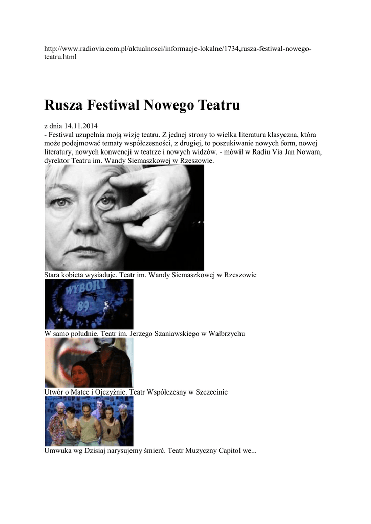 http://www.radiovia.com.pl/aktualnosci/informacje-lokalne/1734,rusza-festiwal-nowegoteatru.html Rusza Festiwal Nowego Teatru z dnia 14.11.2014 - Festiwal uzupełnia moją wizję teatru. Z jednej strony to wielka literatura klasyczna, która może podejmować tematy współczesności, z drugiej, to poszukiwanie nowych form, nowej literatury, nowych konwencji w teatrze i nowych widzów. - mówił w Radiu Via Jan Nowara, dyrektor Teatru im. Wandy Siemaszkowej w Rzeszowie. Stara kobieta wysiaduje. Teatr im. Wandy Siemaszkowej w Rzeszowie W samo południe. Teatr im. Jerzego Szaniawskiego w Wałbrzychu Utwór o Matce i Ojczyźnie. Teatr Współczesny w Szczecinie Umwuka wg Dzisiaj narysujemy śmierć. Teatr Muzyczny Capitol we... Paradise. Komuna// Warszawa Jeżycjada. Komuna//Warszawa, Centrum Kultury Zamek w Poznaniu Dziady. Teatr Nowy im. Tadeusza Łomnickiego w Poznaniu Chopin bez fortepianu. Centrala Bohaterowie Przyszłości. Komuna//Warszawa Acropolis. Narodowy Stary Teatr w Krakowie Już jutro (15. listopada) w Rzeszowie rozpoczyna się Festiwal Nowego Teatru. Nowego, czyli takiego, który za pomocą nowej technologii eksperymentuje z konstruowaniem opowieści. - Dziś bardzo często młodzi twórcy mieszają na scenie porządek tradycyjny, teatralny z narracją pochodząca z nowych mediów, z projekcjami, formatami video i to jest jeden z elementów nowego teatru przez nas czytanego. Myślimy o połączeniu rożnych gatunków na scenie, ale również o tym, że teatr dziś bardzo często przekracza granice, także estetyczne stąd na naszym festiwalu pojawią się spektakle podobne do koncertów, albo podobne do performansów, instalacji, wernisaży. Takim spektaklem jest „Stara kobieta wysiaduje”, która nasz teatr inauguruje festiwal. Publiczność nie pójdzie tradycyjnie na Sokoła, do starej sali Teatru Siemaszkowej, ale do Galerii Rzeszów, do hali industrialnej. – dodaje Jan Nowara. Festiwal nowego Teatru to nowa odsłona Rzeszowskich Spotkań Teatralnych, które odbędą się po raz 53. Festiwal potrwa do 21. listopada. W programie ponad dziesięć przedstawień teatrów, takich jak: Stary w Krakowie, Nowy im. Tadeusza Łomnickiego w Poznaniu czy Współczesny w Szczecinie. Bilety, w cenie od 40 do 100 złotych, można kupić w kasie Teatru im. W. Siemaszkowej. Festiwal to także imprezy towarzyszące: nocne czytania najnowszych polskich sztuk i tekstów teatralnych, Kinoteatr, czyli prezentacje filmowe spektakli teatralnych. Wstęp na imprezy towarzyszące będzie bezpłatny. Czołówka reżyserów młodego pokolenia: FALKOWSKI/ LIBER/ NATURSKI/ TWARKOWSKI/ ZADARA/ ZIEMILSKI ÖHRN/ RYCHCIK/ SZCZAWIŃSKA/ Laboratorium nowych form i gatunków scenicznych: COVERY KLASYKI/ REMIKSY/ SPEKTAKLE-KONCERTY/ WIDEOTEATR PERFORMANSE/ Chcesz poczuć puls współczesnego teatru? Przyjdź! Program Festiwalu: – 15 listopada, godz. 17.00, Teatr im. Wandy Siemaszkowej – Duża Scena Komuna// Warszawa Paradise Now? Re//mix Living Theatre Reżyseria: Komuna//Warszawa – 15 listopada, godz. 19.00, Hotel Rzeszów – Sala Industrialna Teatr im. Siemaszkowej w Rzeszowie Stara kobieta wysiaduje Tadeusza Różewicza PREMIERA! Reżyseria: Kuba Falkowski – 16 listopada, godz. 17.00, Hotel Rzeszów – Sala Industrialna Komuna//Warszawa, Centrum Kultury Zamek w Poznaniu Teren badań: Jeżycjada Koncepcja i reżyseria: Weronika Szczawińska – 16 listopada, godz. 19.00, Teatr im. Wandy Siemaszkowej – Duża Scena Teatr Nowy im. Tadeusza Łomnickiego w Poznaniu Dziady Adama Mickiewicza Reżyseria: Radosław Rychcik – 17 listopada, godz. 18.00, Hotel Rzeszów – Sala Industrialna Komuna//Warszawa Bohaterowie przyszłości Koncepcja i reżyseria Markus Öhrn – 17 listopada, godz. 20.00, Teatr im. Wandy Siemaszkowej – Duża Scena (spektakl kameralny) Teatr im. Jerzego Szaniawskiego w Wałbrzychu W samo południe Reżyseria: Wojtek Ziemilski – 18 listopada, godz. 19.00, Teatr im. Wandy Siemaszkowej – Duża Scena Centrala Chopin bez fortepianu Reżyseria: Michał Zadara – 19 listopada, godz. 19.00, Teatr im. Wandy Siemaszkowej – Duża Scena Teatr Muzyczny Capitol we Wrocławiu Umwuka wg Dzisiaj narysujemy śmierć Wojciecha Tochmana Reżyseria: Jan Naturski – 20 listopada, godz. 19.00, Hotel Rzeszów – Sala Industrialna Teatr Współczesny w Szczecinie Utwór o Matce i Ojczyźnie Bożeny Keff Reżyseria: Marcin Liber – 21 listopada, godz. 18.00, Teatr im Wandy Siemaszkowej – Duża Scena Narodowy Stary Teatr w Krakowie Akropolis wg Stanisława Wyspiańskiego Reżyseria: Łukasz Twarkowski – 21 listopada, godz. 20.00, Hotel Rzeszów – Sala Industrialna Teatr im. Siemaszkowej w Rzeszowie Stara kobieta wysiaduje Tadeusza Różewicza Reżyseria: Kuba Falkowski Specjalnie dla Państwa po raz drugi! WYDARZENIA TOWARZYSZĄCE KINOTEATR – filmowe rejestracje remiksów, czyli nowych interpretacji legendarnych dzieł z obszaru teatru, tańca i sztuk wizualnych, zrealizowanych w ramach nowatorskiego projektu KOMUNY// WARSZAWA 17 listopada, godz. 11.00, Mała Scena – ekranizacje współczesnych polskich sztuk zrealizowane w Wytwórni Dokumentalnych i Fabularnych w Warszawie w ramach cyklu TEATROTEKA Walizka Małgorzaty Sikorskiej-Miszczuk; Trash Story Magdy Fertacz 19 listopada, godz. 11.00, Mała Scena Cukier Stanik Zyty Rudzkiej; Walentyna Julii Kamińskiej i Wojciecha Farugi 20 listopada, godz 11.00, Mała Scena – wideoteatr/spektakl dokamerowy o Jerzym Grotowskim i Ryszardzie Cieślaku Książę, reż. Karol Radziszewski 18 listopada, godz. 11.00, Mała Scena Filmów DRAMA LAB – nocne czytania najnowszych polskich sztuk/ tekstów dla teatru 18,19,20 listopada, godz. 22.00, Galeria Szajna TEATR LAB – szkic sceniczny rejestrujący wstępny etap pracy nad spektaklem 21 listopada, godz.11.00, Galeria Szajna ROZMOWY O TEATRZE – wieczorne spotkania z twórcami spektakli 16,17,18,19,20 listopada, po ostatnim spektaklu, Salonik Siemaszkowej – Kawiarnia Artystyczna lub Hotel 