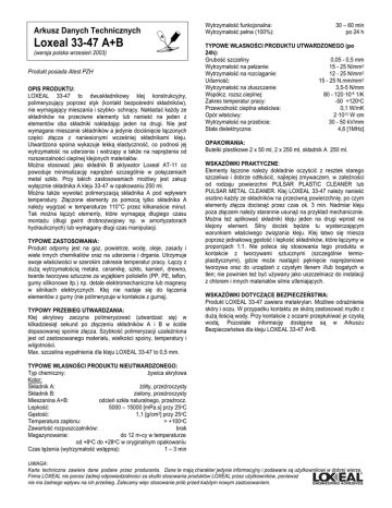 Arkusz Danych Technicznych Loxeal 33-47 A+B (wersja polska wrzesień 2003) Produkt posiada Atest PZH OPIS PRODUKTU: LOXEAL 33-47 to dwuskładnikowy klej konstrukcyjny, polimeryzujący poprzez styk (kontakt bezpośredni składników), nie wymagający mieszania i szybko- schnący. Nakładać kaŜdy ze składników na przeciwne elementy lub nanieść na jeden z elementów oba składniki nakładając jeden na drugi. Nie jest wymagane mieszanie składników a jedynie dociśnięcie łączonych części złącza z naniesionymi wcześniej składnikami kleju. Utwardzona spoina wykazuje lekką elastyczność, co podnosi jej wytrzymałość na uderzenia i wstrząsy a takŜe na napręŜenia od rozszerzalności cieplnej klejonych materiałów. MoŜna stosować jako składnik B aktywator Loxeal AT-11 co powoduje minimalizację napręŜeń szczególnie w połączeniach metal szkło. Przy takich zastosowaniach moŜliwy jest zakup wyłącznie składnika A kleju 33-47 w opakowaniu 250 ml. MoŜna takŜe wywołać polimeryzacją składnika A pod wpływem temperatury. Złączone elementy za pomocą tylko składnika A naleŜy wygrzać w temperaturze 110°C przez kilkanaście minut. Tak moŜna łączyć elementy, które wymagają długiego czasu montaŜu (długi gwint drobnozwojowy np. w amortyzatorach hydraulicznych) lub wymagany długi czas manipulacji. TYPOWE ZASTOSOWANIA: Produkt odporny jest na gaz, powietrze, wodę, oleje, zasady i wiele innych chemikaliów oraz na uderzenia i drgania. Utrzymuje swoje właściwości w szerokim zakresie temperatur pracy. Łączy z duŜą wytrzymałością metale, ceramikę, szkło, kamień, drewno, twarde tworzywa sztuczne za wyjątkiem poliolefin (PP, PE, teflon, gumy silikonowe itp.) np. detale elektromechaniczne lub magnesy w silnikach elektrycznych. Klej nie nadaje się do łączenia elementów z gumy (nie polimeryzuje w kontakcie z gumą). TYPOWY PRZEBIEG UTWARDZANIA: Klej akrylowy zaczyna polimeryzować (utwardzać się) w kilkadziesiąt sekund po złączeniu składników A i B w ściśle dopasowanej spoinie złącza. Szybkość polimeryzacji uzaleŜniona jest od zastosowanego materiału, wielkości spoiny, temperatury i wilgotności. Max. szczelina wypełnienia dla kleju LOXEAL 33-47 to 0,5 mm. Wytrzymałość funkcjonalna: Wytrzymałość pełna (100%): 30 – 60 min po 24 h TYPOWE WŁASNOŚCI PRODUKTU UTWARDZONEGO (po 24h): Grubość szczeliny 0,05 - 0,5 mm Wytrzymałość na pełzanie: 15 - 25 N/mm2 Wytrzymałość na rozciąganie: 12 - 25 N/mm2 Udarność: 15 - 25 N.mm/mm2 Wytrzymałość na złuszczanie: 3,5-5 N/mm Współcz. rozsz.cieplnej: 80 - 12010-6 1/K Zakres temperatur pracy: -50 +120oC Przewodność cieplna właściwa: 0,1 W/mK Opór właściwy: 21013 Wcm Wytrzymałość na przebicie: 30 - 50 kV/mm Stała dielektryczna: 4,6 [1MHz] OPAKOWANIA: Butelki plastikowe 2 x 50 ml, 2 x 250 ml, składnik A 250 ml. WSKAZÓWKI PRAKTYCZNE: Elementy łączone naleŜy dokładnie oczyścić z resztek starego szczeliwa i dobrze odtłuścić, najlepiej zmywaczem, w zaleŜności od rodzaju powierzchni PULSAR PLASTIC CLEANER lub PULSAR METAL CLEANER. Klej LOXEAL 33-47 naleŜy nanieść osobno kaŜdy ze składników na przeciwną powierzchnię, po czym elementy złącza docisnąć przez czas ok. 3 min. Nadmiar kleju poza złączem naleŜy starannie usunąć na przykład mechanicznie. MoŜna teŜ aplikować składniki kleju jeden na drugi wprost na klejony element. Silny docisk będzie tu wystarczającym warunkiem właściwego związania kleju. Klej łatwo się miesza poprzez jednakową gęstość i lepkość składników, które łączymy w proporcjach 1:1. Nie poleca się stosowania tego produktu w kontakcie z tworzywami sztucznymi (szczególnie termoplasttycznymi), gdzie moŜe nastąpić pęknięcie napręŜeniowe tworzywa oraz do urządzeń z czystym tlenem i/lub bogatych w tlen; nie powinien teŜ być uŜywany jako uszczelniacz do instalacji z chlorem i innych materiałów silnie utleniających. WSKAZÓWKI DOTYCZĄCE BEZPIECZEŃSTWA: Produkt LOXEAL 33-47 zawiera metakrylan. MoŜliwe odraŜnienie skóry i oczu. W przypadku kontaktu ze skórą zastosować mydło z duŜą ilością wody. Przy kontakcie z oczami przepłukiwać je czystą wodą. Pozostałe informację dostępne są w Arkuszu Bezpieczeństwa dla kleju LOXEAL 33-47 A+B. TYPOWE WŁASNOŚCI PRODUKTU NIEUTWARDZONEGO: Typ chemiczny: Ŝywica akrylowa Kolor: Składnik A: Ŝółty, przeźroczysty Składnik B: zielony, przeźroczysty Mieszanina A+B: odcień szkła naturalnego, przeźrocz. Lepkość: 5000 – 15000 [mPa.s] przy 25oC Gęstość: 1,1 [g/cm3] przy 25oC Temperatura zapłonu: > +100oC Zawartość rozpuszczalników: brak Magazynowanie: do 12 m-cy w temperaturze od +8oC do +28oC w oryginalnym opakowaniu Czas tęŜenia (wytrzymałość wstępna): 1 – 3 min UWAGA: Karta techniczna zawiera dane podane przez producenta. Dane te mają charakter jedynie informacyjny i podawane są uŜytkownikowi w dobrej wierze. Firma LOXEAL nie ponosi Ŝadnej odpowiedzialności za skutki stosowania produktów LOXEAL przez uŜytkowników, poniewaŜ nie ma Ŝadnego wpływu na ich przebieg. Zalecamy więc stosowanie prób przed kaŜdym nowym zastosowaniem.