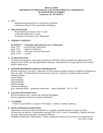 REGULAMIN MISTRZOSTW ZRZESZENIA LZS WOJEWÓDZTWA ŁODZKIEGO W KOSZYKÓWCE KOBIET Gomunice, dn. 25.10.2015r. 1. CEL - popularyzacja koszykówki w środowisku wiejskim; - wyłonienie mistrza LZS województwa łódzkiego. 2. ORGANIZATOR - Wojewódzkie Zrzeszenie LZS w Łodzi. - Urząd Marszałkowski w Łodzi - Powiatowe Zrzeszenie LZS w Radomsku 3. TERMIN I MIEJSCE 25.10.2015 r. – Gomunice, hala sportowa przy Gimnazjum godz. 9:30 - przyjazd ekip, zgłoszenia godz. 9:50 - odprawa techniczna godz. 10:00 - uroczyste otwarcie Mistrzostw godz. 10:10 - zawody 4. UCZESTNICTWO W mistrzostwach prawo startu mają członkowie LZS/LKS, którzy przedstawią: legitymację LZS, ubezpieczenie NNW oraz aktualne badania lekarskie. Zawodniczki nie mogą reprezentować innych pionów sportowych. 5. SPOSÓB PRZEPROWADZENIA MISTRZOSTW System rozgrywek i czas gry w zależności od ilości drużyn ustalony będzie na odprawie technicznej w dniu zawodów. W Mistrzostwach uczestniczyć może po 1 drużynie ze zgłoszonych powiatów: bełchatowskiego, kutnowskiego, opoczyńskiego, pajęczańskiego, piotrkowskiego, radomszczańskiego, pow. radomszczański – gospodarz mistrzostw – Janusz Kamiński - 502 111 305. 6. ZASADY FINANSOWANIA Koszty przejazdu, diet i wpisowego jednostki delegujące. Koszty organizacji mistrzostw ponosi organizator. 7. NAGRODY - w finale wojewódzkim: za zajęcie I-III miejsca – puchary, medale, dyplomy; 8. POSTANOWIENIA KOŃCOWE Organizator nie ponosi odpowiedzialności za wypadki zaistniałe podczas trwania zawodów. W sprawach nie ujętych w regulaminie decyduje WZ LZS w Łodzi w konsultacji z Sędzią Głównym. Zawody odbywają się zgodnie z przepisami PZKosz. Dodatkowe informacje, aktualizacje i zmiany organizator umieszcza na stronie www.lodzkielzs.pl WZ LZS w Łodzi