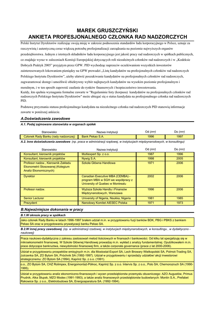 MAREK GRUSZCZYŃSKI ANKIETA PROFESJONALNEGO CZŁONKA RAD NADZORCZYCH Polski Instytut Dyrektorów realizując swoją misję w zakresie podnoszenia standardów ładu korporacyjnego w Polsce, uznaje za rzeczywistą i autentyczną coraz większą potrzebę profesjonalizacji zarządzania na poziomie najwyŜszych organów przedsiębiorstwa. Jednym z istotnych składników ładu korporacyjnego jest jakość pracy rad nadzorczych w spółkach publicznych, co znajduje wyraz w zaleceniach Komisji Europejskiej dotyczących roli niezaleŜnych członków rad nadzorczych i w „Kodeksie Dobrych Praktyk 2005” przyjętym przez GPW. PID wychodząc naprzeciw oczekiwaniom wszystkich inwestorów zainteresowanych lokowaniem pieniędzy na GPW prowadzi „Listę kandydatów na profesjonalnych członków rad nadzorczych Polskiego Instytutu Dyrektorów”, aŜeby ułatwić poszukiwanie kandydatów na profesjonalnych członków rad nadzorczych, zagwarantować dostęp i umoŜliwić obiektywny wybór najlepszych kandydatów na wysokim poziomie profesjonalnym i moralnym, i w ten sposób zapewnić zaufanie do rynków finansowych i bezpieczeństwo inwestowania. KaŜdy, kto spełnia wymagania formalne zawarte w "Regulaminie listy (korpusu) kandydatów na profesjonalnych członków rad nadzorczych Polskiego Instytutu Dyrektorów" moŜe ubiegać się o status kandydata na profesjonalnego członka rad nadzorczych PID. Podstawę przyznania statusu profesjonalnego kandydata na niezaleŜnego członka rad nadzorczych PID stanowią informacje zawarte w poniŜszej ankiecie. A.Doświadczenia zawodowe A.1. Podaj zajmowane stanowiska w organach spółek Stanowisko Członek Rady Banku (rady nadzorczej) Nazwa instytucji Bank Pekao S.A. Od (rrrr) Do (rrrr) 1996 1997 A.2. Inne doświadczenia zawodowe (np. praca w administracji rządowej, w instytucjach międzynarodowych, w konsultingu) Od (rrrr) Do (rrrr) 1987 1996 1998 2005 Szkoła Główna Handlowa 1971 2006 Dyrektor Canadian Executive MBA (CEMBA) program MBA w SGH we współpracy z University of Quebec w Montrealu 2002 2006 Profesor nadzw. WyŜsza Szkoła Handlu i Finansów Międzynarodowych, Warszawa 1996 2006 Senior Lecturer University of Nigeria, Nsukka, Nigeria 1981 1985 Prezydent Narodowy Komitet AIESEC Polska 1971 1973 Stanowisko Konsultant, kierownik projektów Nazwa instytucji Multiexpert Sp. z o.o. Konsultant, kierownik projektów Nywig S.A. Profesor nadzw., Kierownik Zakładu Ekonometrii Stosowanej (Kolegium Analiz Ekonomicznych) B.NajwaŜniejsze dokonania w pracy B.1.W okresie pracy w spółkach Jako członek Rady Banku w latach 1996-1997 brałem udział m.in. w przygotowaniu fuzji banków BDK, PBG i PBKS z bankiem Pekao SA oraz w przygotowaniu prywatyzacji banku Pekao SA. B.2.W innej pracy zawodowej (np. w administracji rzadowej, w instytucjach międzynarodowych, w konsultingu , w dydaktyczno naukowej) Praca naukowo-dydaktyczna z zakresu zastosowań metod ilościowych w finansach i bankowości. Od kilku lat specjalizuję się w mikroekonometrii finansowej. W Szkole Głównej Handlowej prowadzę m.in. wykład z analizy fundamentalnej. Opublikowałem m.in. prace dotyczące bankructwa, niewydolności finansowej firm, a takŜe corporate governance (prace z lat 2000-2006). Udział w przygotowaniu prospektów emisyjnych m.in. dla Mostostal-Export SA, Lech Browary Wielkopolski SA, Polmot-Trading SA, Jutrzenka SA, ZO Bytom SA, Próchnik SA (1992-1997). Udział w przygotowaniu i sprzedaŜy udziałów/ akcji inwestorowi strategicznemu: ZO Bytom SA przedprywatyzacyjnych, (1994), KaprinŜ Sp. z o.o. (1991). Udział w przygotowaniu analiz memorandów inwestycyjnych, analiz finansowych m.in. dla Intercell Sp. z o.o., ZO Bytom SA, CHZ Rolimpex, EnergomontaŜ-Północ, KaprinŜ Sp. z o.o. Intervis Sp. z o.o., Polo SA, Chemorozruch SA (19901995). Udział w przygotowaniu analiz ekonomiczno-finansowych i wycen przedsiębiorstw przemysłu obuwniczego: AZO Augustów, Primus Prudnik, Alka Słupsk, MZO Modex (1991-1993), a takŜe analiz finansowych przedsiębiorstw budowlanych: Montin S.A., Prefabet Rakowice Sp. z o.o., Elektrobudowa SA, Energoaparatura SA. (1992-1994). Oceny efektywności inwestycji, programy restrukturyzacji finansowej, wyceny, wnioski kredytowe m.in. dla Pazim Sp. z o.o., KW PRIM, Giga Sp. z o.o., Baltona SA, PIB Lech, Megatem EC Sp z o.o., Immo-Lux Sp. z o.o. (1998-2003). Wykłady dla kadry menedŜerskiej firmy Fiat (Turyn i Bielsko-Biała 1992-1993). Wykłady na szkoleniach dla doradców inwestycyjnych (1994-1995). C.Profesjonalne zainteresowania zawodowe (dziedzina zarządzania, sektor - branŜa gospodarki) preferencje kandydata przy obsadzie rad nadzorczych Interesuję się jakością nadzoru właścicielskiego w spółkach, a takŜe zarządzaniem finansami. W przeszłości zajmowałem się zarówno instytucjami finansowymi, jak i branŜami przetwórczymi czy teŜ budownictwem. D.Wykształcenie D.1.Wykształcenie formalne Tytuł naukowy Rok ukończenia (rrrr) magister Nazwa szkoły wyŜszej Szkoła Główna Planowania i Statystyki Nazwa wydziału (kierunku) Wydział Finansów i Statystyki doktor Szkoła Główna Planowania i Statystyki Wydział Finansów i Statystyki 1977 doktor habilitowany Szkoła Główna Handlowa Kolegium Analiz Ekonomicznych 2001 1971 D.2.Inne uprawnienia zawodowe (np. radca prawny, rzeczoznawca majatkowy, biegły rewident, makler gieldowy itp.) Rok ukończenia (rrrr) Tytuł / nazwa D.3.Studia podyplomowe i specjalistyczne Nazwa Nazwa szkoły / kursu Rok ukończenia (rrrr) D.4.Odbyte szkolenia w dziedzinie prawa gospodarczego, finansów, rachunkowości i Corporate Governance Rok ukończenia (rrrr) Nazwa szkoły / kursu Nazwa Szkolenie na członków rad nadzorczych - z państwowym egzaminem końcowym Kurs dla kadry menedŜerskiej organizowany przez Pekao S.A. 1997 D.5.Odbyte nieobligatoryjne szkolenia zalecane przez PID (rodz.V. "Regulaminu.." Nazwa - Nazwa szkoły / kursu Rok ukończenia (rrrr) D.6.Znajomość języków obcych Język Certyfikaty
