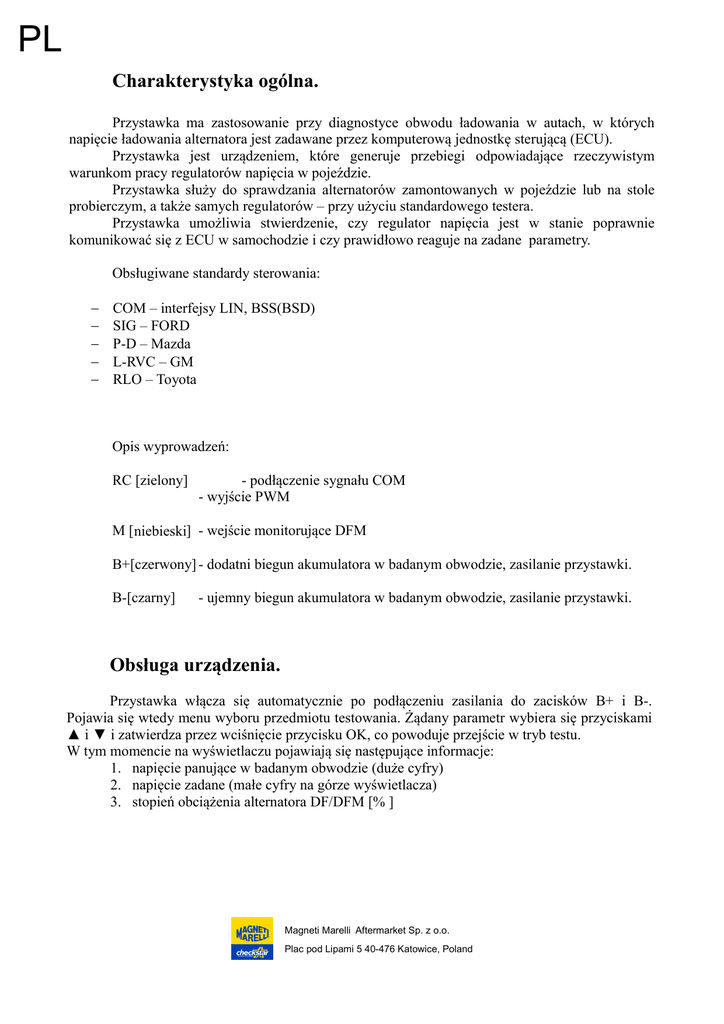 PL Charakterystyka ogólna. Przystawka ma zastosowanie przy diagnostyce obwodu ładowania w autach, w których napięcie ładowania alternatora jest zadawane przez komputerową jednostkę sterującą (ECU). Przystawka jest urządzeniem, które generuje przebiegi odpowiadające rzeczywistym warunkom pracy regulatorów napięcia w pojeździe. Przystawka służy do sprawdzania alternatorów zamontowanych w pojeździe lub na stole probierczym, a także samych regulatorów – przy użyciu standardowego testera. Przystawka umożliwia stwierdzenie, czy regulator napięcia jest w stanie poprawnie komunikować się z ECU w samochodzie i czy prawidłowo reaguje na zadane parametry. Obsługiwane standardy sterowania: − − − − − COM – interfejsy LIN, BSS(BSD) SIG – FORD P-D – Mazda L-RVC – GM RLO – Toyota Opis wyprowadzeń: RC [zielony] - podłączenie sygnału COM - wyjście PWM M [niebieski] - wejście monitorujące DFM B+[czerwony] - dodatni biegun akumulatora w badanym obwodzie, zasilanie przystawki. B-[czarny] - ujemny biegun akumulatora w badanym obwodzie, zasilanie przystawki. Obsługa urządzenia. Przystawka włącza się automatycznie po podłączeniu zasilania do zacisków B+ i B-. Pojawia się wtedy menu wyboru przedmiotu testowania. Żądany parametr wybiera się przyciskami ▲ i ▼ i zatwierdza przez wciśnięcie przycisku OK, co powoduje przejście w tryb testu. W tym momencie na wyświetlaczu pojawiają się następujące informacje: 1. napięcie panujące w badanym obwodzie (duże cyfry) 2. napięcie zadane (małe cyfry na górze wyświetlacza) 3. stopień obciążenia alternatora DF/DFM [% ] Magneti Marelli Aftermarket Sp. z o.o. Plac pod Lipami 5 40-476 Katowice, Poland Przewody RC oraz M należy podłączyć do właściwych pinów w gnieździe regulatora napięcia. Należy mieć na uwadze, że niektóre regulatory do prawidłowego działania wymagają dodatkowo podłączenia innych sygnałów (najczęściej B+) osobnym przewodem. Przewód M podczas pracy w trybie COM może pozostać niepodłączony. W trybie testowania przyciskami ▲ i ▼ zmienia się wartość zadanego napięcia. Podczas sprawdzania należy obserwować, czy zmiana wartości zadanego napięcia powoduje odpowiadającą zmianę napięcia na wyjściu alternatora/regulatora oraz czy odczyt DFM odpowiada stanowi faktycznemu. Wyjście z trybu testowania odbywa się przez przytrzymanie przycisku OK. Przykłady podłączenia testera. 1. COM – Mercedes, Opel, Audi, BMW, Renault, VW, Ford COM/LIN DFM Sposób podłączenia testera do alternatora: Przewód łączący pin DFM alternatora ze złączem M testera Przewód łączący pin COM alternatora ze złączem RC testera Przewód łączący złącze B+ alternatora ze złączem B+ testera Przewód łączący B- (obudowę) alternatora ze złączem B- testera Magneti Marelli Aftermarket Sp. z o.o. Plac pod Lipami 5 40-476 Katowice, Poland RC M Po podłączeniu testera, na ekranie ukaże się menu główne: W menu należy wybrać funkcję COM i potwierdzić przez wciśnięcie OK. Urządzenie przejdzie w tryb testowania COM i wyświetli następujące informacje: Aktualnie wybrana funkcja Aktualna wartość DFM: Wartość napięcia zadawana Rzeczywista wartość napięcia zmierzona w testowanym obwodzie Informacja o protokole transmisji Podczas testu, po uruchomieniu napędu alternatora, rzeczywista wartość napięcia powinna podążać za wartością zadaną, a wartość DFM powinna zmieniać się zgodnie z aktualnym obciążeniem alternatora. Pewne rozbieżności pomiędzy wartościami napięcia są dopuszczalne. Istotna jest przede wszystkim właściwa reakcja ze strony alternatora polegająca na zwiększaniu lub zmniejszaniu napięcia na wyjściu odpowiednio do napięcia zadanego. 2. SIG – Ford, Mazda FR SIG A M RC B+ Magneti Marelli Aftermarket Sp. z o.o. Plac pod Lipami 5 40-476 Katowice, Poland Sposób podłączenia testera do alternatora: Przewód łączący B- (obudowę) alternatora ze złączem B- testera Przewód łączący złącze B+ alternatora ze złączem B+ testera Przewód łączący pin FR alternatora ze złączem M testera Przewód łączący pin SIG alternatora ze złączem RC testera Przewód łączący pin A alternatora z zaciskiem B+ Podłączenie pinu A należy zrealizować niezależnie od testera, korzystając z przyłączy znajdujących się w samochodzie lub będących wyposażeniem stanowiska probierczego. Po podłączeniu testera, na ekranie ukaże się menu główne: Należy wybrać funkcję SIG i potwierdzić przez wciśnięcie OK. Urządzenie przejdzie w tryb testowania SIG i wyświetli następujące informacje: Magneti Marelli Aftermarket Sp. z o.o. Plac pod Lipami 5 40-476 Katowice, Poland Aktualnie wybrana funkcja Napięcie zadane Napięcie zmierzone Aktualna wartość DFM Podczas testu, po uruchomieniu napędu alternatora, rzeczywista wartość napięcia powinna podążać za wartością zadaną, a wartość DFM powinna zmieniać się zgodnie z aktualnym obciążeniem alternatora. Pewne rozbieżności pomiędzy wartościami napięcia są dopuszczalne. Istotna jest przede wszystkim właściwa reakcja ze strony alternatora polegająca na zwiększaniu lub zmniejszaniu napięcia na wyjściu odpowiednio do napięcia zadanego. 3. P-D – Mazda P D Magneti Marelli Aftermarket Sp. z o.o. Plac pod Lipami 5 40-476 Katowice, Poland M RC Sposób podłączenia testera do alternatora: Przewód łączący złącze B+ alternatora ze złączem B+ testera Przewód łączący pin D alternatora ze złączem RC testera Przewód łączący pin P alternatora ze złączem M testera Przewód łączący B- (obudowę) alternatora ze złączem B- testera Po podłączeniu testera, na ekranie ukaże się menu główne: Magneti Marelli Aftermarket Sp. z o.o. Plac pod Lipami 5 40-476 Katowice, Poland W menu należy wybrać funkcję P-D i potwierdzić przez wciśnięcie OK. Urządzenie przejdzie w tryb testowania. Podczas testu, po uruchomieniu nap