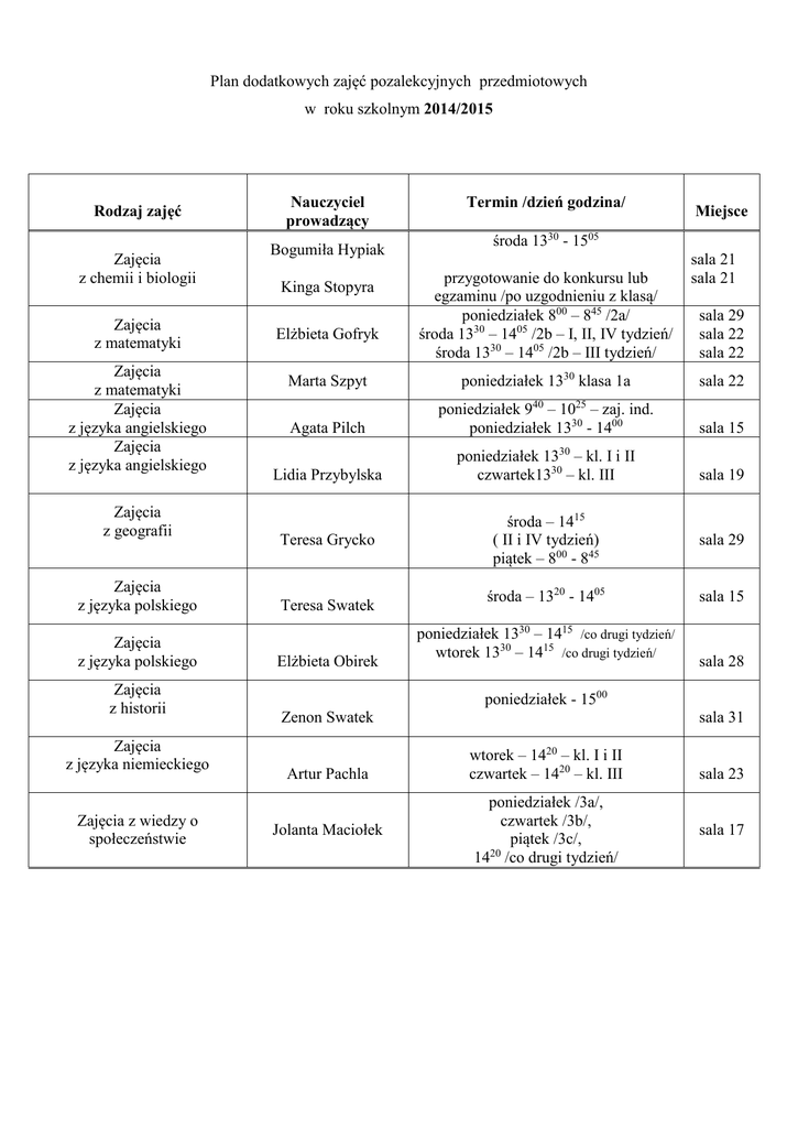 Plan dodatkowych zajęć pozalekcyjnych przedmiotowych w roku szkolnym 2014/2015 Rodzaj zajęć Zajęcia z chemii i biologii Zajęcia z matematyki Zajęcia z matematyki Zajęcia z języka angielskiego Zajęcia z języka angielskiego Zajęcia z geografii Zajęcia z języka polskiego Zajęcia z języka polskiego Zajęcia z historii Zajęcia z języka niemieckiego Zajęcia z wiedzy o społeczeństwie Nauczyciel prowadzący Bogumiła Hypiak Kinga Stopyra Elżbieta Gofryk Termin /dzień godzina/ Miejsce środa 1330 - 1505 przygotowanie do konkursu lub egzaminu /po uzgodnieniu z klasą/ poniedziałek 800 – 845 /2a/ środa 1330 – 1405 /2b – I, II, IV tydzień/ środa 1330 – 1405 /2b – III tydzień/ sala 21 sala 21 sala 29 sala 22 sala 22 Marta Szpyt poniedziałek 1330 klasa 1a sala 22 Agata Pilch poniedziałek 940 – 1025 – zaj. ind. poniedziałek 1330 - 1400 sala 15 Lidia Przybylska poniedziałek 1330 – kl. I i II czwartek1330 – kl. III sala 19 Teresa Grycko Teresa Swatek Elżbieta Obirek środa – 1415 ( II i IV tydzień) piątek – 800 - 845 sala 29 środa – 1320 - 1405 sala 15 poniedziałek 1330 – 1415 /co drugi tydzień/ wtorek 1330 – 1415 /co drugi tydzień/ sala 28 poniedziałek - 1500 Zenon Swatek Artur Pachla Jolanta Maciołek sala 31 wtorek – 1420 – kl. I i II czwartek – 1420 – kl. III poniedziałek /3a/, czwartek /3b/, piątek /3c/, 1420 /co drugi tydzień/ sala 23 sala 17 Plan dodatkowych zajęć pozalekcyjnych /w tym koła przedmiotowe/ w roku szkolnym 2014/2015 Rodzaj zajęć Nauczyciel prowadzący Termin /dzień godzina/ Miejsce Koło przedmiotowe Zajęcia artystyczne „ plastyczne” środa 1420 Anita Żmurko-Sieradzka Koło przedmiotowe Zajęcia muzyczne, wokalne Koło przedmiotowe Grzegorz Kowal z języka angielskiego Koło przedmiotowe Agata Pilch z geografii Teresa Grycko Koło przedmiotowe Teresa Swatek z języka polskiego Koło przedmiotowe Elżbieta Obirek z języka polskiego środa - 1530 środa - 1420 środa – 1415 ( I i III tydzień) wtorek - 1420 /co drugi tydzień – przygotowanie do konkursów/ środa - 1420 czwartek - 1420 /przygotowanie do konkursów/ sala 17 sala 16 sala 15 sala 29 sala 16 sala 28 Szkolne Koło Caritas Przygotowanie do konkursów Koło przedmiotowe Jolanta Maciołek wtorek - 1420 sala 17 Elżbieta Gofryk czwartek 1320 /raz w miesiącu/ sala 17 piątek - 1400 wg harmonogramu zbiórek /poza terenem szkoły/ biblioteka z matematyki Koło Przyjaciół Biblioteki Drużyna harcerka - X DSH „Wilki” Joanna Kopeć Plan dodatkowych zajęć pozalekcyjnych sportowych w roku szkolnym 2014/2015 Rodzaj zajęć Nauczyciel prowadzący Piłka koszykowa, piłka siatkowa Wiktor Wis Termin /dzień godzina/ wtorek: 1415 1500 - szachy Miejsce sala gimn. 1500 - 1600 – kosz szachy, 1600 – 1700 – siatka dziewcząt i chłopców) Zajęcia rekreacyjno - sportowe Jan Argasiński środa - 1700 – 1930 sala gimn. lub boisko szkolne