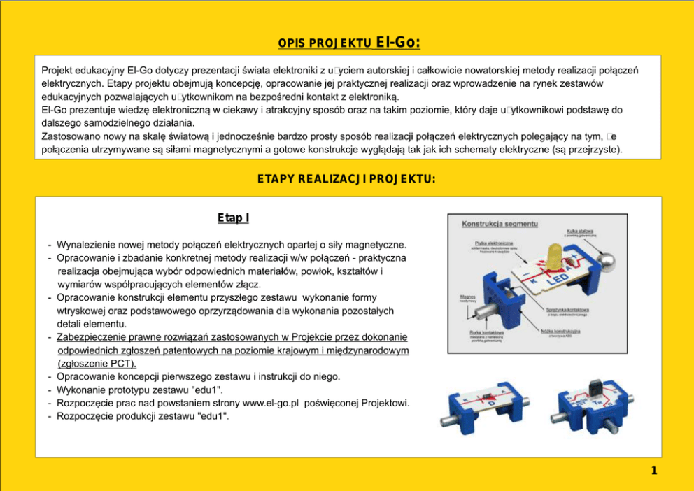 OPIS PROJEKTU El-Go: Projekt edukacyjny El-Go dotyczy prezentacji świata elektroniki z użyciem autorskiej i całkowicie nowatorskiej metody realizacji połączeń elektrycznych. Etapy projektu obejmują koncepcję, opracowanie jej praktycznej realizacji oraz wprowadzenie na rynek zestawów edukacyjnych pozwalających użytkownikom na bezpośredni kontakt z elektroniką. El-Go prezentuje wiedzę elektroniczną w ciekawy i atrakcyjny sposób oraz na takim poziomie, który daje użytkownikowi podstawę do dalszego samodzielnego działania. Zastosowano nowy na skalę światową i jednocześnie bardzo prosty sposób realizacji połączeń elektrycznych polegający na tym, że połączenia utrzymywane są siłami magnetycznymi a gotowe konstrukcje wyglądają tak jak ich schematy elektryczne (są przejrzyste). ETAPY REALIZACJI PROJEKTU: Etap I - Wynalezienie nowej metody połączeń elektrycznych opartej o siły magnetyczne. - Opracowanie i zbadanie konkretnej metody realizacji w/w połączeń - praktyczna realizacja obejmująca wybór odpowiednich materiałów, powłok, kształtów i wymiarów współpracujących elementów złącz. - Opracowanie konstrukcji elementu przyszłego zestawu wykonanie formy wtryskowej oraz podstawowego oprzyrządowania dla wykonania pozostałych detali elementu. - Zabezpieczenie prawne rozwiązań zastosowanych w Projekcie przez dokonanie odpowiednich zgłoszeń patentowych na poziomie krajowym i międzynarodowym (zgłoszenie PCT). - Opracowanie koncepcji pierwszego zestawu i instrukcji do niego. - Wykonanie prototypu zestawu "edu1". - Rozpoczęcie prac nad powstaniem strony www.el-go.pl poświęconej Projektowi. - Rozpoczęcie produkcji zestawu "edu1". 1 Etap II - Opracowanie koncepcji systemu na bazie Projektu El-Go. - Wprowadzenie na rynek pierwszego zestawu "edu1". Zestaw ten jest zwiastunem, który został tak zaprojektowany aby za jego pomocą mogły być realizowane proste układy tranzystorowe przez osoby nie posiadające nawet podstawowej wiedzy elektronicznej. Zestaw jest wyposażony w instrukcję zawierającą przykłady obwodów elektronicznych, logiczne wyjaśnienie zasady ich działania oraz dokładne omówienie podstawowego prawa elektronicznego - Prawa Ohma. Dodatkowe 2 uniwersalne segmenty El-Go zawarte w zestawie pozwalają bardziej zaawansowanym użytkownikom na wykorzystanie dowolnego elementu elektronicznego dwu-końcówkowego. W ten sposób liczba możliwych do realizacji obwodów staje się praktycznie nieograniczona. Etap III - Zakończenie głównych prac na stronie www.el-go.pl Na stronie www znajduje się specjalnie zaprojektowany moduł do budowy obwodów elektronicznych. Internauci mogą układać segmenty El-Go na ekranie swojego monitora tworząc własne obwody elektroniczne a następnie zamieszczać je (publikować) na forum, które służy do wymiany informacji między użytkownikami. Oprócz tworzenia obwodów w czasie rzeczywistym i uczestnictwa w forum można również zasięgnąć dokładniejszych informacji dotyczących El-Go. Na stronie zamieszczona została galeria zdjęć, instrukcja obsługi do zestawu "edu1" oraz linki do stron internetowych dystrybutorów oferujących produkty El-Go. 2 Etap IV - Wprowadzenie pierwszego zestawu szkolnego Zestaw jest dostosowany do programów nauczania w gimnazjach i liceach, wyposażony w elementy potrzebne do realizacji zajęć z fizyki i techniki, tj: sondy pomiarowe, mierniki, odpowiednie źródła zasilania oraz inne elementy, przydatne do przeprowadzania zajęć w szkołach. Zestaw umożliwia podłączenie do niego dowolnych mierników uniwersalnych. Za jego pomocą można badać prawo Ohma, prawa Kirhchoffa oraz obwody z diodą prostowniczą a także szeregowo i równolegle połączonymi odbiornikami prądu. Etap V - Rozbudowa oferty o segmenty uzupełniające. Segmenty uniwersalne El-Go dwu, trzy i wielo-końcówkowe, pozwalają na zastosowanie przez użytkownika własnych elementów, diod, tranzystorów, układów scalonych (analogowych i cyfrowych), czujników itp. Umożliwia to realizację nawet złożonych konstrukcji elektronicznych. 3 Etap VI - Wprowadzenie zestawów płaskich (flat) dla szkół. Proponowane zestawy są zbudowane w oparciu o kolejne nowatorskie rozwiązanie magnetycznych połączeń elektrycznych. Konstrukcje mają postać płaskich segmentów, i można je prezentować na typowej tablicy szkolnej. Zestawy “Flat” są wykonywane w wersjach - indywidualnej dla uczniów (małe segmenty) i nauczycielskiej (duże segmenty) do prezentacji na tablicy. Etap VII - Realizacja dedykowanych zestawów dydaktycznych. Projektowane i wykonywane są zestawy przeznaczone do określonych zadań. Znajdują one zastosowania w szkołach zawodowych oraz na uczelniach technicznych zgodnie z potrzebami zgłaszanymi przez te środowiska. 4 Etap VIII - Zestaw współpracujący z komputerem, do nauki programowania. Współpraca obwodów z komputerem odbywa się przez port USB. Obwody sterowane mikroprocesorem realizują złożone funkcje sterowania. Dwukierunkowa komunikacja z komputerem umożliwia programowanie obwodów lub prezentację na ekranie wyników uzyskanych np. z podłączonych czujników. Niezależne zasilanie obwodów umożliwia ich autonomiczne działanie. W dalszej przyszłości ? Planowane są działania stosowne do rozwoju sytuacji - zgodne z potrzebami i tendencjami zgłaszanymi przez użytkowników zestawów El-Go. 5