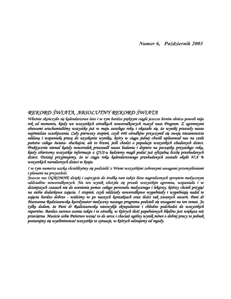 Numer 6, Październik 2003 REKORD ŚWIATA, ABSOLUTNY REKORD ŚWIATA Właśnie skończyło się kalendarzowe lato i w tym bardzo pięknym ciągle jeszcze letnim słońcu powoli mija rok od momentu, kiedy we wszystkich ośrodkach noworodkowych ruszył nasz Program. Z ogromnymi obawami uruchamialiśmy uruchamialiśmy wszystko już w maju zeszłego roku i okazało się, że wyniki przeszły nasze najśmielsze oczekiwania. Cały pierwszy stopień, czyli 446 ośrodków przyczynił się swoją niesamowicie oddaną i wspaniałą pracą do uzyskania wyniku, który w ciągu jednej chwili uplasował uplasował nas na czele państw całego świataświata- słuchajcie, ale to brzmi, jeśli chodzi o populacje wszystkich zbadanych dzieci. Praktycznie niemal każdy noworodek przeszedł nasze badania i dopiero na początku przyszłego roku, kiedy zbierzemy wszystkie informacje informacje z GUSGUS-u będziemy mogli podać już oficjalną liczbę przebadanych dzieci. Dzisiaj przyjmujemy, że w ciągu roku kalendarzowego przebadanych zostało około 97,8 % wszystkich narodzonych dzieci w kraju. I w tym numerze uszka chcielibyśmy się podzielić z Wami wszystkimi zebranymi uwagami przemyśleniami i planami na przyszłość. Jeszcze raz OGROMNE dzięki i zajrzyjcie do środka tam także lista nagrodzonych sprzętem medycznym oddziałów noworodkowych. Na ten wynik złożyła się przede wszystkim ogromna, wspaniała i w dzisiejszych czasach nie do ocenienia pomoc całego personelu medycznego i lekarzy, którzy chcieli przyjąć na siebie dodatkowe zajęcia. I stopień, czyli oddziały noworodkowe wypełniały i wypełniają nadal te zajęcia bardzo dobrze - widzimy to po naszych kontaktach kontaktach oraz ilości tak zwanych awarii. Pani dr Marzanna Radziszewska koordynator medyczny naszego programu podzieli się uwagami na ten temat. Ja tylko dodam, że Pani dr Radziszewska niezwykle skrupulatnie i chłodno podchodzi do wszystkich raportów. Bardzo Bardzo surowo ocenia także i te ośrodki, w których ilość popełnionych błędów jest większa niż przeciętna. Musicie sobie Państwo wziąć to do serca i chociaż ogólny wynik mówi o dobrej pracy to jednak postarajmy się wyeliminować wszystkie te sytuacje, w których odstajemy odstajemy od reguły. Program Powszechnych Przesiewowych Badań Słuchu u Noworodków spowodował jedno - nigdy dotąd na taką skalę nie prowadzono takich badań. My bardzo byliśmy ostrożni, jeśli chodzi o sposób jego realizacji i zakładaliśmy, że sukcesem już będzie będzie przebadanie 6060-70 % noworodków. Ta szczelność programu doprowadziła do wielkiego „tłoku” we wszystkich oddziałach audiologicznych. Mówimy tutaj o II poziomie naszego programu gdzie trafia dziecko z podejrzeniem uszkodzenia słuchu. Oprócz pojedynczych przypadków gdzie ośrodki niechętnie z nami współpracują (bywa, że wręcz nie korzystają z naszych urządzeń), czyli w żadne sposób nie uczestniczą w programie. Większość z 55 ośrodków II zaległości, egłości, ale już nie czynnik poziomu została po prostu zapchana pacjentami. W tych badaniach są zal ludzki tutaj zawinił. Wydaje nam się, że powinno powstać drugie tyle ośrodków do badań audiologicznych. Czy mogą one powstać??? Czy są na to pieniądze i odpowiednie ekipy w dodatkowych 50 miejscach??? Czy nadal właśnie lekarze związani z II poziomem zechcą bezpłatnie prowadzić nasz program w miarę swoich możliwości??? Na te pytania także w dalszej części uszka. I na koniec to wszystko ma wpływ na III stopień, gdzie dziecko jest protezowane i rehabilitowane. Zaczynając tak szybko leczenie, które ma być wynikiem tego programu zakładamy, że każdy tydzień, miesiąc liczy się niezwykle w skuteczności działania. Program spowodował, że do dnia dzisiejszego zaprotezowano 45 niemowląt. Ile niemowlaków w skutek braku możliwości zrobienia badania badania na II poziomie nie rozpoczęło w odpowiednim czasie leczenia??? 200 tysięcy, czyli dwójka i pięć zer. Coś fantastycznego!!! Po prostu nie do wiary, że tak wspaniale realizowany jest cały program dzięki fantastycznej i bardzo zaangażowanej pracy przede przede wszystkim – personelu medycznego i lekarzy w szpitalach I stopnia. To właśnie tam badane są wszystkie noworodki i widzimy, że badania te przebiegają niezwykle sprawnie o krótki ótki film mówiący o czym także mogliśmy się przekonać naocznie. Właśnie skończyliśmy realizować kr całym programie, który będzie pokazywany na VII Międzynarodowej Konferencji Implantów Ślimakowych i Medycyny Audiologicznej. Pomyśleliśmy, że zamiast wykładu pokażemy 1515-minutowy film, który wyjaśni wszystkim całe nasze dokonania. Na własne oczy wraz z ekipą filmową zobaczyliśmy w losowo wybranych szpitalach położniczych, jak badania te są prowadzone. Byliśmy w Ostrołęce, w Warszawie, w Łodzi, w Toruniu, w Kwidzynie oraz w Poznaniu. Szpitale duże, kliniczne i te mniejsze, lokalne. Serce się raduje i po prostu – tętni ogromnym optymizmem. I o tym w dzisiejszym Uszku, a także bardzo ważne podsumowanie dr Marzanny Radziszewskiej. USZKO – Biuletyn Programu Powszechnych Przesiewowych Badań Słuchu u Noworodków Nr 6/2003 Drodzy Państwo, Drodzy Przyjaciele. Wiadomo już, że przez kolejny rok a nawet jeszcze następny i następny Fundacja będzie w pełni finansowała wszystko to, co jest związane z tym programem. Chcemy otwierać kolejne ośrodki chcemy wpływać na to, aby zdobywać najnowocześniejszy sprzęt dla audiologów. Chcemy przeznaczać środki na serwis sprzętu, który już posiadamy. Taka jest rzeczywistość i nie ma co tracić czasu na pretensje i żale skierowane do Ministerstwa Zdrowia. Pragniemy jednego, aby w żaden sposób nie zaprzepaścić tego, co już osiągnęliśmy. Usprawniajmy to, spowodujmy, aby mieć jeszcze większy powód do dumy. WIELKA PROŚBA!!! Pomóżcie nam to dalej realizować, nie ponad siły, nie ponad swoje mo