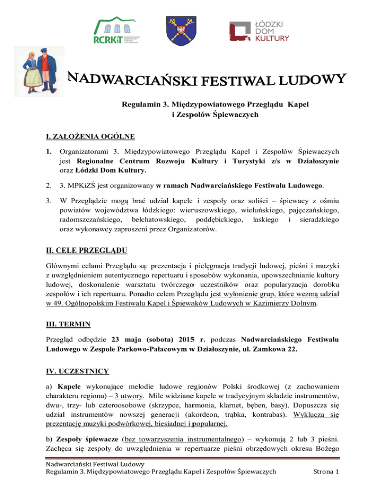 Regulamin 3. Międzypowiatowego Przeglądu Kapel i Zespołów Śpiewaczych I. ZAŁOŻENIA OGÓLNE 1. Organizatorami 3. Międzypowiatowego Przeglądu Kapel i Zespołów Śpiewaczych jest Regionalne Centrum Rozwoju Kultury i Turystyki z/s w Działoszynie oraz Łódzki Dom Kultury. 2. 3. MPKiZŚ jest organizowany w ramach Nadwarciańskiego Festiwalu Ludowego. 3. W Przeglądzie mogą brać udział kapele i zespoły oraz soliści – śpiewacy z ośmiu powiatów województwa łódzkiego: wieruszowskiego, wieluńskiego, pajęczańskiego, radomszczańskiego, bełchatowskiego, poddębickiego, łaskiego i sieradzkiego oraz wykonawcy zaproszeni przez Organizatorów. II. CELE PRZEGLĄDU Głównymi celami Przeglądu są: prezentacja i pielęgnacja tradycji ludowej, pieśni i muzyki z uwzględnieniem autentycznego repertuaru i sposobów wykonania, upowszechnianie kultury ludowej, doskonalenie warsztatu twórczego uczestników oraz popularyzacja dorobku zespołów i ich repertuaru. Ponadto celem Przeglądu jest wyłonienie grup, które wezmą udział w 49. Ogólnopolskim Festiwalu Kapel i Śpiewaków Ludowych w Kazimierzy Dolnym. III. TERMIN Przegląd odbędzie 23 maja (sobota) 2015 r. podczas Nadwarciańskiego Festiwalu Ludowego w Zespole Parkowo-Pałacowym w Działoszynie, ul. Zamkowa 22. IV. UCZESTNICY a) Kapele wykonujące melodie ludowe regionów Polski środkowej (z zachowaniem charakteru regionu) – 3 utwory. Mile widziane kapele w tradycyjnym składzie instrumentów, dwu-, trzy- lub czteroosobowe (skrzypce, harmonia, klarnet, bęben, basy). Dopuszcza się udział instrumentów nowszej generacji (akordeon, trąbka, kontrabas). Wyklucza się prezentację muzyki podwórkowej, biesiadnej i popularnej. b) Zespoły śpiewacze (bez towarzyszenia instrumentalnego) – wykonują 2 lub 3 pieśni. Zachęca się zespoły do uwzględnienia w repertuarze pieśni obrzędowych okresu Bożego Nadwarciański Festiwal Ludowy Regulamin 3. Międzypowiatowego Przeglądu Kapel i Zespołów Śpiewaczych Strona 1 Narodzenia i Wielkanocy, sobótkowych, żniwnych, dożynkowych, weselnych, chrzcinowych, a także pieśni o tematyce miłosnej, rodzinnej, pieśni żartobliwe, pasterskie, rekruckie, ballady. Sugeruje się, aby pieśni były zróżnicowane gatunkowo. c) Soliści – śpiewacy (bez towarzyszenia instrumentalnego) wykonują 2 pieśni dłuższe lub 3 krótsze; repertuar jw. d) Mistrz-Uczeń – w ramach przeglądu „uczniowie” wykonują po dwa utwory (kapele i soliści- instrumentaliści). Soliści-śpiewacy i grupy śpiewacze wykonują również po dwa utwory. Każda pozycja prezentowanego repertuaru powinna być rozpoczęta przez mistrza i kontynuowana przez ucznia. Jest to konkurs dla ucznia, a nie mistrza. V. CZAS PREZENTACJI Maksymalny czas trwania prezentacji to 10 minut. Występy przekraczające ten limit czasowy będą przerywane. VI. OCENA Uczestników oceniać będzie niezależne Jury powołane przez Organizatorów. Ocenie poddane zostaną: a) b) c) d) dobór repertuaru zgodnego z tradycją regionu; sposób i styl wykonania (poprawność gwarowa); wyraz i walory artystyczne prezentacji; strój zgodny z tradycją regionu. VII. NAGRODY 1. Laureaci Przeglądu otrzymają nagrody pieniężne. 2. Jury wytypuje spośród laureatów (każdej kategorii) uczestników 49. Ogólnopolskiego Festiwalu Kapel i Śpiewaków Ludowych w Kazimierzu Dolnym. VIII. AKREDYTACJA 1. Uczestnicy zobowiązani są do uiszczenia opłaty akredytacyjnej przed rozpoczęciem Przeglądu w wysokości 15,00zł od członka zespołu/kapeli/solisty. Akredytację należy wpłacać na: Regionalne Centrum Rozwoju Kultury i Turystyki z/s w Działoszynie ul. Zamkowa 22, 98-355 Działoszyn nr konta: 03 9251 0009 0000 0912 2000 0020 W tytule przelewu proszę wpisać: „Przegląd – akredytacja” oraz podać nazwę zespołu. Nadwarciański Festiwal Ludowy Regulamin 3. Międzypowiatowego Przeglądu Kapel i Zespołów Śpiewaczych Strona 2 2. Po przesłaniu zgłoszenia i kserokopii wpłaty akredytacyjnej zespoły otrzymają potwierdzenie udziału w Przeglądzie. IX. INFORMACJE DODATKOWE 1. Karty zgłoszenia przyjmowane będą w terminie do 10 maja 2015 r. 2. Organizatorzy zapewniają uczestnikom ciepły posiłek oraz napoje w dniu Przeglądu 3. Zgłoszenie udziału w Przeglądzie jest równoznaczne z wyrażeniem zgody na nieodpłatne prawo do rejestracji dowolną techniką zapisu oraz wykorzystania materiału. 4. Nadesłanie Karty Zgłoszenia jest równoznaczne z przyjęciem warunków niniejszego regulaminu. 5. Repertuar wpisany na Karcie zgłoszenia nie może być zmieniany w dniu występu. 6. Karty zgłoszeń z brakiem szczegółowej informacji o repertuarze oraz nadesłane po terminie nie będą przyjmowane przez Organizatorów. 7. Zespół przesyłając kartę zgłoszenia wyraża zgodę na uczestnictwo w imprezach towarzyszących. 8. Organizatorzy nie ponoszą odpowiedzialności za wszelkie straty poniesione przez uczestników podczas Przeglądu. 9. Uczestnicy ubezpieczają się od NW na własny koszt. 10. Uczestnicy przyjeżdżają na własny koszt. 11. Sprawy nie objęte regulaminem rozstrzygają Organizatorzy. X. DANE TELEADRESOWE: Regionalne Centrum Rozwoju Kultury i Turystyki z/s w Działoszynie ul. Zamkowa 22 98-355 Działoszyn tel./fax: 043/843-00-00 e-mail: [email protected] Nadwarciański Festiwal Ludowy Regulamin 3. Międzypowiatowego Przeglądu Kapel i Zespołów Śpiewaczych Strona 3