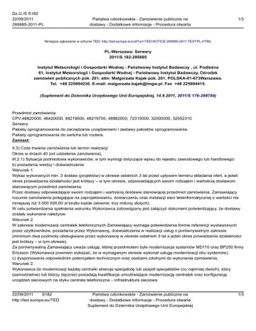 Dz.U./S S182 22/09/2011 295885-2011-PL Państwa członkowskie - Zamówienie publiczne na dostawy - Dodatkowe informacje - Procedura otwarta 1/3 Niniejsze ogłoszenie w witrynie TED: http://ted.europa.eu/udl?uri=TED:NOTICE:295885-2011:TEXT:PL:HTML PL-Warszawa: Serwery 2011/S 182-295885 Instytut Meteorologii i Gospodarki Wodnej - Państwowy Instytut Badawczy , ul. Podleśna 61, Instytut Meteorologii i Gospodarki Wodnej - Państwowy Instytut Badawczy, Ośrodek zamówień publicznych pok. 201, attn: Małgorzata Kajak pok. 201, POLSKA-01-673Warszawa. Tel. +48 225694230. E-mail: [email protected]. Fax +48 225694415. (Suplement do Dziennika Urzędowego Unii Europejskiej, 14.9.2011, 2011/S 176-288784) Przedmiot zamówienia: CPV:48820000, 48420000, 48219500, 48219700, 48982000, 72315000, 32000000, 32552310 Serwery. Pakiety oprogramowania do zarządzania urządzeniami i zestawy pakietów oprogramowania. Pakiety oprogramowania do switcha lub routera. Zamiast: II.3) Czas trwania zamówienia lub termin realizacji: Okres w dniach 40 (od udzielenia zamówienia). III.2.1) Sytuacja podmiotowa wykonawców, w tym wymogi dotyczące wpisu do rejestru zawodowego lub handlowego: b) posiadania wiedzy i doświadczenia Warunek 1. Wykaz wykonanych min. 3 dostaw (projektów) w okresie ostatnich 3 lat przed upływem terminu składania ofert, a jeżeli okres prowadzenia działalności jest krótszy – w tym okresie, odpowiadających swoim rodzajem i wartością dostawom stanowiącym przedmiot zamówienia. Przez dostawy odpowiadające swoim rodzajem i wartością dostawie stanowiącej przedmiot zamówienia, Zamawiający rozumie zamówienia polegające na zaprojektowaniu, dostarczeniu oraz instalacji sieci teleinformatycznej o wartości nie mniejszej niż 3 000 000,00 zł brutto każde (słownie: trzy miliony złotych). W celu potwierdzenia spełnienia warunku Wykonawca zobowiązany jest załączyć dokument potwierdzający, że dostawy zostały wykonane należycie. Warunek 2. W zakresie modernizacji centralek telefonicznych Zamawiający wymaga potwierdzenia formie referencji wystawionych przez użytkowników, posiadania przez Wykonawcę, doświadczenia w realizacji usług o porównywalnym zakresie (minimum dwa podmioty obsługiwane przez wykonawcę w okresie ostatnich 3 lat a jeżeli okres prowadzenia działalności jest krótszy – w tym okresie). Za porównywalną Zamawiający uważa usługę, której przedmiotem była modernizacja systemów MD110 oraz BP250 firmy Ericsson (Wykonawca powinien wykazać, że w wymaganym okresie wykonał usługę modernizacji obu systemów). c) dysponowania odpowiednim potencjałem technicznym oraz osobami zdolnymi do wykonania zamówienia, Warunek 2. Wykonawca do modernizacji każdej centralki skieruje specjalistę lub zespół specjalistów (co najmniej dwóch), który (samodzielnie) lub którzy (łącznie) posiadają kwalifikacje umożliwiające modernizację centralek oraz konfigurację urządzeń sieciowych na styku centrala telefoniczna – infrastruktura sieciowa. 22/09/2011 S182 http://ted.europa.eu/TED Państwa członkowskie - Zamówienie publiczne na dostawy - Dodatkowe informacje - Procedura otwarta Suplement do Dziennika Urzędowego Unii Europejskiej 1/3 Dz.U./S S182 22/09/2011 295885-2011-PL Państwa członkowskie - Zamówienie publiczne na dostawy - Dodatkowe informacje - Procedura otwarta 2/3 Specjaliści winni dysponować certyfikatami, wymaganymi do obsługi systemu centralki zainstalowanego w danej lokalizacji. Wykonawca skieruje do realizacji projektu minimum jedną osobę posiadającą odpowiednie kwalifikacje do prowadzenia projektów udokumentowane certyfikatem PRINCE lub równoważnym*. * Poprzez certyfikat równoważny Zamawiający rozumie, że Wykonawca dla tej roli przedstawi certyfikat, który: — jest analogiczny co do zakresu z przykładowymi certyfikatami wskazanymi z nazwy dla danej roli, co jest rozumiane jako: — analogiczna dziedzina merytoryczna wynikająca z roli której dotyczy certyfikat. (np. kompetencje związane z zarządzaniem projektami), — analogiczny stopień poziomu kompetencji (np. podstawowy, zaawansowany, ekspert), — analogiczny poziom doświadczenia zawodowego wymaganego do otrzymania danego certyfikatu (np. konieczność wykazania się uczestnictwem w określonej liczbie projektów w danej roli, lub liczba lat pracy w danej roli, etc), — potwierdzony jest egzaminem. Powinno być: II.3) Czas trwania zamówienia lub termin realizacji: Okres w dniach 42. III.2.1) Sytuacja podmiotowa wykonawców, w tym wymogi dotyczące wpisu do rejestru zawodowego lub handlowego: b) posiadania wiedzy i doświadczenia Warunek 1. Wykaz wykonanych min. 2 dostaw (projektów) w okresie ostatnich 3 lat przed upływem terminu składania ofert, a jeżeli okres prowadzenia działalności jest krótszy – w tym okresie, odpowiadających swoim rodzajem i wartością dostawom stanowiącym przedmiot zamówienia. Przez dostawy odpowiadające swoim rodzajem i wartością dostawie stanowiącej przedmiot zamówienia, Zamawiający rozumie zamówienia polegające na dostarczeniu oraz instalacji i konfiguracji sieci teleinformatycznej o wartości nie mniejszej niż 1 800 000 PLN brutto każde (słownie: jeden milion osiemset złotych). W celu potwierdzenia spełnienia warunku Wykonawca zobowiązany jest załączyć dokument potwierdzający, że dostawy zostały wykonane należycie. W zakresie modernizacji centralek telefonicznych Zamawiający wymaga potwierdzenia formie referencji wystawionych przez użytkowników, posiadania przez Wykonawcę, doświadczenia w realizacji usług o porównywalnym zakresie (minimum 2 podmioty obsługiwane przez wykonawcę w okresie ostatnich 3 lat a jeżeli okres prowadzenia działalności jest krótszy – w tym okresie). Za porównywalną Zamawiający uważa usługę, której przedmiotem była modernizacja systemów MD110 oraz BP250 firmy Ericsson (opis infrastruktury pkt 7.4 Specyfikacji Technicznej). Wykonawca powinien wykazać, 