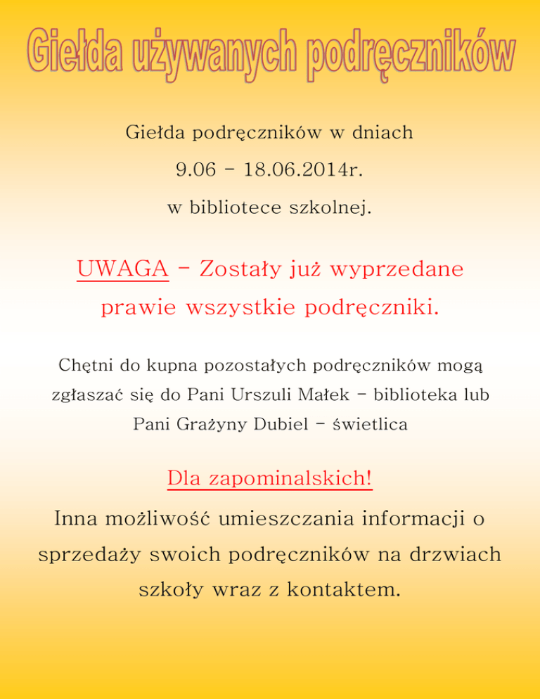 Giełda podręczników w dniach 9.06 - 18.06.2014r. w bibliotece szkolnej. UWAGA - Zostały już wyprzedane prawie wszystkie podręczniki. Chętni do kupna pozostałych podręczników mogą zgłaszać się do Pani Urszuli Małek - biblioteka lub Pani Grażyny Dubiel - świetlica Dla zapominalskich! Inna możliwość umieszczania informacji o sprzedaży swoich podręczników na drzwiach szkoły wraz z kontaktem.