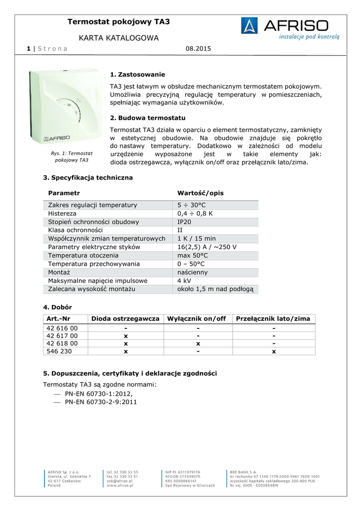 Termostat pokojowy TA3 KARTA KATALOGOWA