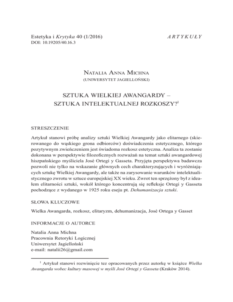 Estetyka i Krytyka 40 (1/2016) DOI: 10.19205/40.16.3 A R T Y K U ŁY Natalia Anna Michna (UNIWERSYTET JAGIELLOŃSKI) SZTUKA WIELKIEJ AWANGARDY – SZTUKA INTELEKTUALNEJ ROZKOSZY?1 STRESZCZENIE Artykuł stanowi próbę analizy sztuki Wielkiej Awangardy jako elitarnego (skierowanego do wąskiego grona odbiorców) doświadczenia estetycznego, którego pozytywnym zwieńczeniem jest świadoma rozkosz estetyczna. Analiza ta zostanie dokonana w perspektywie filozoficznych rozważań na temat sztuki awangardowej hiszpańskiego myśliciela José Ortegi y Gasseta. Przyjęta perspektywa badawcza pozwoli nie tylko na wskazanie głównych cech charakteryzujących i wyróżniających sztukę Wielkiej Awangardy, ale także na zarysowanie warunków intelektualistycznego zwrotu w sztuce europejskiej XX wieku. Zwrot ten sprzężony był z ideałem elitarności sztuki, wokół którego koncentrują się refleksje Ortegi y Gasseta pochodzące z wydanego w 1925 roku eseju pt. Dehumanizacja sztuki. SŁOWA KLUCZOWE Wielka Awangarda, rozkosz, elitaryzm, dehumanizacja, José Ortega y Gasset INFORMACJE O AUTORCE Natalia Anna Michna Pracownia Retoryki Logicznej Uniwersytet Jagielloński e-mail: [email protected] 1 Artykuł stanowi rozwinięcie tez opracowanych przez autorkę w książce Wielka Awangarda wobec kultury masowej w myśli José Ortegi y Gasseta (Kraków 2014). 44 Natalia Anna Michna Sztuka Wielkiej Awangardy była unikatowym zjawiskiem w historii artystycznej działalności człowieka. Nadrzędną ideą, która przyświecała twórcom awangardowym, było uwolnienie sztuki z wpływu tradycji i skostniałego akademizmu. Zerwanie ze stylistyką mimesis i utylitaryzmem miało ponadto ocalić sztukę od jej umasowienia i dewaluacji. Awangardyści postulowali także powrót do czysto estetycznych wartości sztuki, propagując hasło „sztuki dla sztuki”. Warto podkreślić, że uprawianie sztuki stanowiącej antytezę sztuki masowej miało swoje początki już w twórczości impresjonistów i postimpresjonistów, jednak dopiero twórczość artystów Wielkiej Awangardy stała się prawdziwą sztuką „niewielu dla niewielu”2. Artykuł stanowi próbę analizy sztuki Wielkiej Awangardy jako elitarnego (skierowanego do wąskiego grona odbiorców) doświadczenia estetycznego, którego pozytywnym zwieńczeniem jest świadoma rozkosz estetyczna. Analiza ta zostanie dokonana w perspektywie filozoficznych rozważań na temat sztuki awangardowej hiszpańskiego myśliciela José Ortegi y Gasseta. Przyjęta perspektywa badawcza pozwoli nie tylko na wskazanie głównych cech charakteryzujących i wyróżniających sztukę Wielkiej Awangardy, ale także na zarysowanie warunków intelektualistycznego zwrotu w sztuce europejskiej XX wieku. Zwrot ten sprzężony był z ideałem elitarności sztuki, wokół którego koncentrują się refleksje Ortegi y Gasseta pochodzące z wydanego w 1925 roku eseju pt. Dehumanizacja sztuki. Wielka Awangarda w historii sztuki Wielka Awangarda oznacza zespół trendów i tendencji w sztuce pierwszej połowy XX wieku i obecnie uważamy ją raczej za nowatorską postawę artystyczną niż konkretny rodzaj sztuki, rozumiany w kategoriach stylistycznych. Stefan Morawski określa ramy czasowe Wielkiej Awangardy, wyznaczając jej punkty wyjścia i dojścia na lata 1905–19303. W artykule Spoglądając na sztukę minionego wieku Grzegorz Dziamski podkreśla, że większość badaczy zgadza się co do tych czasowych ram pierwszej awangardy, ponieważ właśnie wtedy „narodziły się programy wszystkich głównych kierunków awangardowych, nastąpiło «wybuchowe rozszczepienie 2 3 A. Kłoskowska, Kultura masowa: krytyka i obrona, Warszawa 1980, s. 221. Por. S. Morawski, Na zakręcie: od sztuki do po-sztuki, Kraków 1985. Sztuka Wielkiej Awangardy – sztuka intelektualnej rozkoszy?45 ducha europejskiego» (Charles Jencks) powodujące łańcuchową reakcję we wszystkich sferach kultury, nałożenie się rewolucji artystycznej, politycznej, technicznej, dające poczucie uczestnictwa w narodzinach nowej epoki”4. Niewątpliwie jednak, na co także wskazuje Dziamski, artystyczny okres ścisłej Wielkiej Awangardy kończy się mniej więcej w 1930 roku: W odniesieniu do lat 30. można mówić o tradycji awangardy, ale już nie o awangardzie, jeśli nie chce się popadać w contradiction in terminis i nazywać awangardą zjawisk, które – choć niezrozumiałe i nieakceptowane przez większość publiczności, bezpardonowo atakowane tak z prawicowych, jak i lewicowych pozycji – pozbawione już były wcześniejszego radykalizmu artystycznego i społecznego5. Sam termin „awangarda” został zapożyczony z języka wojskowego, w którym oznacza straż przednią, torującą drogę głównym siłom armii. Francuskie określenie avant-garde, użyte do opisania nowatorskich rozwiązań w sztuce, pojawiło się już w epoce romantyzmu, wówczas jednak rozumiane było przez krytykę artystyczną jako synonim radykalizmu i dynamizmu artystycznego. Na przełomie wieków XIX i XX jednym z głównych popularyzatorów tego terminu był poeta Guillaume Apollinaire, który przez artystyczną awangardę rozumiał zbieżne dążenia współczesnych mu malarzy i poetów. Niewątpliwie zjawisko tak wielobarwne i złożone, jakim była Wielka Awangarda, trudno nawet dzisiaj, z perspektywy czasu, włożyć w ramy jednej, trwałej definicji. Zdarza się również, że podejmowane próby, mające na celu definicyjne dookreślenie Wielkiej Awangardy, doprowadziły do powstania jej dwuwymiarowego obrazu, któremu daleko do naukowego obiektywizmu. Przyczyny tego zjawiska są dwojakiego rodzaju. Z jednej strony część badaczy sztuki, obok opisu wybranych działań awangardowych, skupiała się głównie na negatywnej ocenie sztuki tradycyjnej. Badacze ci zwykli stawiać Wielką Awangardę w prostej opozycji do dotychczasowej sztuki, wskazując na jej antyhistoryczną postawę. Z drugiej strony apologeci sztuki trad