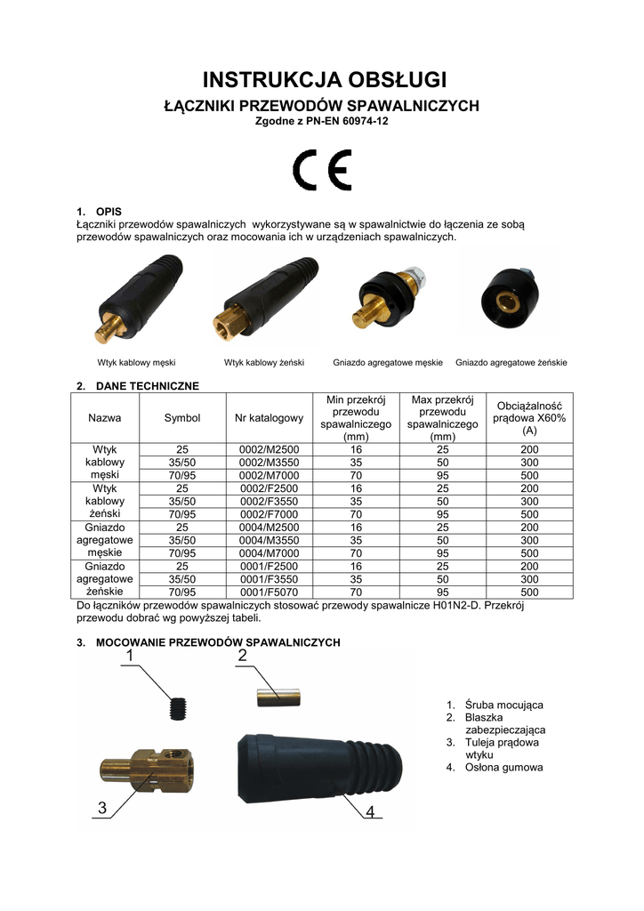 INSTRUKCJA OBSŁUGI ŁĄCZNIKI PRZEWODÓW SPAWALNICZYCH Zgodne z PN-EN 60974-12 1. OPIS Łączniki przewodów spawalniczych wykorzystywane są w spawalnictwie do łączenia ze sobą przewodów spawalniczych oraz mocowania ich w urządzeniach spawalniczych. Wtyk kablowy męski Wtyk kablowy żeński Gniazdo agregatowe męskie Gniazdo agregatowe żeńskie 2. DANE TECHNICZNE Min przekrój Max przekrój Obciążalność przewodu przewodu Nazwa Symbol Nr katalogowy prądowa X60% spawalniczego spawalniczego (A) (mm) (mm) Wtyk 25 0002/M2500 16 25 200 kablowy 35/50 0002/M3550 35 50 300 męski 70/95 0002/M7000 70 95 500 Wtyk 25 0002/F2500 16 25 200 kablowy 35/50 0002/F3550 35 50 300 żeński 70/95 0002/F7000 70 95 500 Gniazdo 25 0004/M2500 16 25 200 agregatowe 35/50 0004/M3550 35 50 300 męskie 70/95 0004/M7000 70 95 500 Gniazdo 25 0001/F2500 16 25 200 agregatowe 35/50 0001/F3550 35 50 300 żeńskie 70/95 0001/F5070 70 95 500 Do łączników przewodów spawalniczych stosować przewody spawalnicze H01N2-D. Przekrój przewodu dobrać wg powyższej tabeli. 3. MOCOWANIE PRZEWODÓW SPAWALNICZYCH 1. Śruba mocująca 2. Blaszka zabezpieczająca 3. Tuleja prądowa wtyku 4. Osłona gumowa 3.1 Wtyki kablowe Zdjąć gumową osłonę wtyku (4) i nasunąć ją na przewód spawalniczy. Wykręcić śrubę mocującą (1) z tulei wtyku (3), aby całkowicie odsłonić otwór tulei. Zdjąć izolację z przewodu spawalniczego (ok. 2 cm). Odsłoniętą część przewodu wsunąć w otwór tulei prądowej wtyku. Umieścić blaszkę zabezpieczającą (2) pod śrubą mocującą i dokręcić śrubę przy pomocy klucza imbusowego tak, aby uzyskać pewne połączenie przewodu z tuleją wtyku i zapewnić dobrą przewodność elektryczną. Nasunąć osłonę gumową wtyku na tuleję prądową. 3.2 Gniazda agregatowe Usunąć izolację z przewodu spawalniczego i założyć końcówkę oczkową. Przymocować przewód prądowy do gniazda przy pomocy śruby mocującej tak aby uzyskać pewne połączenie. 4. ROZŁĄCZANIE I ŁĄCZENIE ELEMENTÓW POŁĄCZENIOWYCH Aby połączyć 2 elementy połączeniowe należy bolec łącznika męskiego umieścić w otworze łącznika żeńskiego i przekręcić do oporu zgodnie z ruchem wskazówek zegara. Aby rozłączyć elementy, należy przekręcić wtyk przeciwnie do wskazówek zegara i wyjąć bolec z otworu. DEKLARACJA ZGODNOŚCI 01/LPS/2014 Upoważniony przedstawiciel producenta: TECWELD Piotr Polak 41-943 Piekary Śląskie ul. Szmaragdowa 21/3/6 oddział: 41-909 Bytom ul. Krzyżowa 3 POLSKA Deklarujemy, że niżej wymienione wyroby: Wtyki kablowe męskie 25, 35/50, 70/95 Wtyki kablowe żeńskie 25, 35/50, 70/95 Gniazda agregatowe męskie 25, 35/50, 70/95 Gniazda agregatowe żeńskie 25, 35/50, 70/95 Znak towarowy producenta: do których odnosi się niniejsza deklaracja spełniają wymogi następujących dyrektyw Unii Europejskiej oraz przepisów krajowych wprowadzających te dyrektywy: Dyrektywy Niskonapięciowej LVD 2006/95/EC oraz są zgodne z następującymi normami: PN-EN 60974-12:2011 Sprzęt do spawania łukowego -- Część 12:Elementy połączeniowe przewodów spawalniczych. Bytom, dn. 03.02.2014 Piotr Polak (podpis osoby upoważnionej)