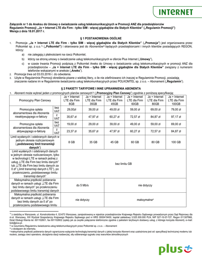Załącznik nr 1 do Aneksu do Umowy o świadczenie usług telekomunikacyjnych w Promocji ANZ dla przedsiębiorców Regulamin Promocji „Ja + Internet LTE dla Firm - tylko SIM - więcej gigabajtów dla Stałych Klientów” („Regulamin Promocji”) Wersja z dnia 18.01.2017 r. § 1 POSTANOWIENIA OGÓLNE 1. Promocja „Ja + Internet LTE dla Firm - tylko SIM - więcej gigabajtów dla Stałych Klientów” („Promocja”) jest organizowana przez Polkomtel sp. z o.o.1) („Polkomtel”) i skierowana jest do Abonentów2) będących przedsiębiorcami i innych klientów posiadających REGON, którzy: a) nie zalegają z płatnościami na rzecz Polkomtel, b) którzy sa stroną umowy o świadczenie usług telekomunikacyjnych w ofercie Plus Internet („Umowy”), c) w czasie trwania Promocji podpiszą z Polkomtel Aneks do Umowy o świadczenie usług telekomunikacyjnych w promocji ANZ dla przedsiębiorców – „Ja + Internet LTE dla Firm - tylko SIM - więcej gigabajtów dla Stałych Klientów” związany z numerami telefonów wskazanymi w aneksie („Aneks”). 2. Promocja trwa od 03.03.2016 r. do odwołania. 3. Użyte w Regulaminie Promocji określenia pisane z wielkiej litery, o ile nie zdefiniowano ich inaczej w Regulaminie Promocji, posiadają znaczenie nadane im w Regulaminie świadczenia usług telekomunikacyjnych przez POLKOMTEL sp. z o.o. – Abonament („Regulamin”). § 2 PAKIETY TARYFOWE I INNE UPRAWNIENIA ABONENTA Abonent może wybrać jeden z promocyjnych planów cenowych 3) („Promocyjny Plan Cenowy”) zgodnie z poniższą specyfikacją: Ja + Internet Ja + Internet Ja + Internet Ja + Internet Ja + Internet Ja + Internet Promocyjny Plan Cenowy LTE dla Firm LTE dla Firm LTE dla Firm LTE dla Firm LTE dla Firm LTE dla Firm 8GB 35GB 45GB 60GB 80GB 100GB bez 29,00zł 39,00 zł 49,00 zł 59,00 zł 69,00 zł 79,00 zł Promocyjna opłata VAT abonamentowa dla Abonenta z nieaktywującego e-faktury 35,67 zł 47,97 zł 60,27 zł 72,57 zł 84,87 zł 97,17 zł VAT bez 19,00 zł 29,00 zł 39,00 zł 49,00 zł 59,00 zł 69,00 zł Promocyjna opłata VAT abonamentowa dla Abonenta z aktywującego e-fakturę 23,37 zł 35,67 zł 47,97 zł 60,27 zł 72,57 zł 84,87 zł VAT Limit wysłanych i odebranych danych w jednym okresie rozliczeniowym 8 GB 35 GB 45 GB 60 GB 80 GB 100 GB („podstawowy limit transmisji danych”) Limit wysłanych i odebranych danych w jednym okresie rozliczeniowym, tylko w technologii LTE w ramach jednej z usług „LTE dla Firm bez limitu danych” bez limitu GB lub „LTE dla Firm bez limitu danych za 0 zł” („limit transmisji danych LTE”), po przekroczeniu „podstawowego limitu transmisji danych” Maksymalna prędkość pobierania danych w ramach usługi „LTE dla Firm do 5 Mb/s nie dotyczy bez limitu danych” po przekroczeniu podstawowego limitu transmisji danych Maksymalna prędkość pobierania danych w ramach usługi „LTE dla Firm nie dotyczy maksymalna4 bez limitu danych za 0 zł” po przekroczeniu podstawowego limitu 1. 1) z siedzibą w Warszawie, ul. Konstruktorska 4, 02-673 Warszawa, zarejestrowaną w rejestrze przedsiębiorców Krajowego Rejestru Sądowego prowadzonym przez Sąd Rejonowy dla m.st. Warszawy, XIII Wydział Gospodarczy Krajowego Rejestru Sądowego pod nr KRS 0000419430, kapitał zakładowy 3.525.300.000 PLN, NIP 527-10-37-727, Regon 011307968, Dział Obsługi Klienta tel. 601102601, fax 601102602 (opłaty jak za zwykłe połączenie telefoniczne zgodnie z pakietem taryfowym dostawcy usług, z którego korzysta Abonent), e-mail: [email protected]. 2) w rozumieniu Regulaminu świadczenia usług telekomunikacyjnych przez Polkomtel sp. z o.o. – Abonament 3) z dostępem do internetu. 4 maksymalna prędkość pobierania danych ograniczona wyłącznie technologią transmisji danych z jakiej korzysta Abonent oraz uzależniona jest od: specyfikacji technicznej modemu lub routera, zasięgu sieci operatora, obciążenia stacji nadawczej, siły odbieranego sygnału oraz warunków atmosferycznych transmisji danych 2. 3. 4. 5. 6. 7. 8. 9. 10. 11. 12. 13. 14. 15. 16. 17. 18. 5) Wszystkie pozostałe opłaty w promocyjnych planach cenowych naliczane są zgodnie z Cennikiem Plus Internet dla Klientów biznesowych („Cennik”). W ramach Promocji Abonent korzystający z promocyjnego planu cenowego Ja + Internet LTE dla Firm 8 GB i Ja + Internet LTE dla Firm 35 GB ma możliwość włączenia Usługi dodatkowej „LTE dla Firm bez limitu danych” oferującej nielimitowany dostęp do transmisji danych w technologii LTE. W ramach promocji Abonent korzystający z planu cenowego Ja + Internet LTE dla Firm 45 GB, Ja + Internet LTE dla Firm 60 GB, Ja + Internet LTE dla Firm 80 GB, Ja + Internet LTE dla Firm 100 GB zleca włączenie Usługi dodatkowej „LTE dla Firm bez limitu danych za 0 zł” oferującej nielimitowany dostęp do transmisji danych w technologii LTE. Aktywacja usługi nastąpi w dniu zmiany taryfy/planu cenowego na Promocyjny Plan Cenowy. Abonent może zlecić aktywację usługi dodatkowej, o której mowa w § 2 pkt 3 w następujący sposób: a) telefonicznie, dzwoniąc na numer Działu Obsługi Klienta: 6011026015 z telefonu wszystkich sieci lub 2601 z telefonu sieci Plus – Usługę aktywuje konsultant, b) logując się do Plus Online na www.plus.pl, c) u sprzedawcy w Punkcie Sprzedaży Plusa. Usługa dodatkowa, o której mowa w § 2 pkt 3 zostanie aktywowana następnego dnia po otrzymaniu przez Polkomtel zlecenia aktywacji o którym mowa w § 2 pkt 5. Opłata za korzystanie z usług dodatkowych o których mowa w § 2 pkt 3 oraz § 2 pkt 4 w każdym Okresie rozliczeniowym wyniesie 8 zł bez VAT (9,84 zł z VAT). W ramach Promocji w Promocyjnych Planach Cenowych Ja + Internet LTE dla Firm 45 GB, Ja + Internet LTE dla Firm 60 GB, Ja + Internet LTE dla Firm 80 GB, Ja + Internet LTE dla Firm 100 GB opłata za usługę dodatkową, o której mowa w § 2 pkt 4, jest wliczona w promocyjną opłatę abonamentową. Usługi dodatkowe, o których mowa 