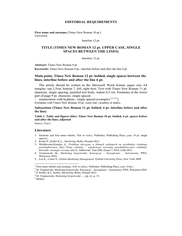 EDITORIAL REQUIREMENTS First name and surname (Times New Roman 10 pt.) University Interline 12 pt. TITLE (TIMES NEW ROMAN 12 pt. UPPER CASE, SINGLE SPACES BETWEEN THE LINES) Interline 12 pt. Abstract: Times New Roman 9 pt. Keywords: Times New Roman 9 pt., interline before and after the line 6 pt. Main point, Times New Roman 12 pt. bolded, single spaces between the lines, interline before and after the line 6 pt. The article should be written in the Microsoft Word format, paper size A4 margins: top 2,5cm, bottom 7, left, right 4cm. Text with Times New Roman 11 pt. character, single spacing, justified text body, indent 0,5 cm. Footnotes at the lower part of page 9 pt. character, single spaced. ˗ enumeration with hyphens , single spaced (examples1,2,3,4,5). Formulas with Times New Roman 10 pt. cente red, variables in italics. Subsections (Times New Roman 11 pt. bolded, 6 pt. interline before and after the line) Table 1. Table and figures titles: Times New Roman 10 pt. bolded, 6 pt. spaces before and after the lines, adjusted Source: (9 pt.) Literature 1. Surname and first name initials, Title in italics, Publisher, Publishing Place, year. (9 pt. single spaces). 2. Kotler P., Keller K.L., Marketing, Rebis, Poznań 2012. 3. Wróblewska-Kazakin A., Problemy decyzyjne w firmach rodzinnych na przykładzie średniego przedsiębiorstwa, [In:] Firmy rodzinne – współczesne wyzwania przedsiębiorczości rodzinnej. Kierunki i strategie rozwoju, (ed.) Ł. Sułkowski, Tom XIII, Zeszyt 7, SAN, Łódź 2012. 4. Trojanowski M., Marketing bezpośredni, Koncepcja – Zarządzanie – Instrumenty, PWE, Warszawa 2010. 5. Lee K., Carter S., Global Marketing Management, Oxford University Press, New York 2009. 1 First name initials and surname, Title in italics, Publisher, Publishing Place, year. (9 pt.) M. Trojanowski, Marketing bezpośredni, Koncepcja – Zarządzanie – Instrumenty, PWE, Warszawa 2010. 3 P. Kotler, K.L. Keller, Marketing, Rebis, Poznań 2012. 4 M. Trojanowski, Marketing bezpośredni …, op. cit., p. 15. 5 Ibidem. 2