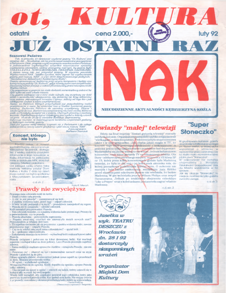 ot9 KULTURA ostatni cena 2.000,- luty 92 JUŻ O STATNI R A Z Szanowni Państwo Tak, to prawda, że dzisiejsze wydanie gazety "Ot, Kultura"jest ostatnie. Ale... No właśnie, ale nieje st to naszeostatecznepożegnanie z Państwem. Otóż,pragnąc wyjść naprzeciw oczekiwaniom Państwa, a jednocześnie wykorzystać wszelkie nowoczesne sposoby wydawania czasopism, usilnie pracujemy nad tym, by gazeta była N I E Z A L E Ż N A . NOWOCZEŚNIEJSZA, CIEKAWSZA i ŁADNIEJSZA. A zatem nowy rok. ju ż przyniósł zmiany. W styczniu powstało Wydawnictwo NAK - spółka cywilna, które zajmie się wydawaniem gazety pod nazwą "NAK", a więc skrót dotychczasowego podtytułu "Niecodzienne Aktualności Kęclzierzyna-Koźla". Gazetę opracowywać będziemy przy użyciu komputera i będzie ona kontynuacją gazety "Ot, Kultura”,gdyż tworzyją tensamzespół ludzi. Dzisiejszy numerjestju ż wcałościjinansowanyprzez nowopowstałe Wydawnictwo. Czy pozostanie wgazecie na stałe dodatek samorządowy zależeć bę dzie tylko od woli władz miasta. Czy gazeta wzbogaci się o inne stałe rubryki, czy zwiększy się ilość stron i częstotliwość ukazywania, czy poszerzy się krąg odbiorców oraz zakres poruszanych tematów i spraw, zależy od tego kto ijak efektywnie zechce z nami współpracować. Sądzę, że Państwo, których przychylnośćju ż pozyskaliśmy nadal pozostaniecie z nami. by umacniać nas w trudzie tworzenia gazety lokalnej. Zachęcam Państwa do szerokiej współpracy. Piszcie i telefonujcie do nas. Zainteresowanijesteśmy również osobą, która na stałe zechciałyby związać się z gazetą. Chętnych prosimy o osobisty kontakt. Popołudniowy dyżur redakcyjnąje s t nadal w każdy wtorek odgodz. 16.oo do 20,oo w siedzibie Redakcji. Zapraszamy. Informuję również, iż rozstrzygnięcie konkursu wspomnień podamy w kolejnym numerze gazety. Dziś ju ż życząc miłej lektury żegnam się z Państwem i do miłego zobaczenia w nowej szacie graficznej i pod nową nazwą "NAK'. Z poważaniem _____________________________ BarbaraCharczuk NAK NIECODZIENNE AKTUALNOŚCI KĘDZIERZYNA-KOŹLA Gwiazdy "małej" telewizji Koncert, którego nie było Ba rdzo lu b ię ,a na w e t kocham muzykę, jaką proponuje Mieczysław Szczęśniak, d late go też z wielką radością przyją łem informację o jego koncercie w Koźlu. Informacja ta zaskoczyła mnie w autobusie MPK, który był oklejony (Mietka) plakatami. O d jakiegoś czasu chyba taką m e to d ę reklam y przyją ł Dom Kultury z Koźla. Z dnia na dzień m oja radość na myśl o spotkaniu z Mieczysławem Szczęśniakiem rosła. c.d. str. 2 Foto R. Meroń Prawdy nie zwyciężysz Pewnego razu człowiek rzekł do króla: - Znam o tobie całą prawdę. - A cóż to jest prawda? - zainteresował się król. - Z punktu widzenia ludzi, jesteś nagi - odparł człowiek. - A któż to taki podsunął ci tę myśl? - prawdziwie zaniepokoił się regent. - Prawda mi to oznajmiła - odrzekł człowiek. Król zarządził przyprowadzić Prawdę. - Ten człowiek twierdzi, ż e z punktu widzenia ludzi jestem nagi. Proszę cię o potwierdzenie, czy to prawda. - Prawda absolutna - potwierdziła zaproszona. - Popatrz uważniej, czyżbyś nie zauważyła moich nowych szat!? Przywdziałem je właśnie dziś rano. - To zupełnie nieistotne jak się przystroisz: z punktu widzenia ludzi, zawsze pozostaniesz nagi - odparła Prawda. - Czy to ty wbiłaś taką myśl temu człowiekowi? - spytał król. - Ja - spokojnie odpowiedziała. - Za kalumnię skazuję cię na śmierć - wybuchnął król i rozkazał katowi zabić Prawdę. Prawdę związano i położono na kikut drewnianej belki. Kat machnął toporem i rozłupał kikut na dwie połowy. Lecz Prawda pozostała zupełnie zdrowa. - Sama osobiście osądzam oprawców i królów - oznajmiła Prawda - nie oni mnie. - Powieszę cię! - oburzył się kat i momentalnie zarzucił sznur na szyję Prawdy i podniósł Ją do góry. Ofiarę ogarnęła słabość, równocześnie jednak sznur zapalił się i przeobraził w dym. Skazana pozostawała wolna. - W ogień - wybełkotał egzekutor. Wrzucono Prawdę do ogniska. Kiedy dopaliło się ognisko, ujrzano Prawdę całą i zdrową. - Ona nie pali się nawet w ogniu! - zdziwili się ludzie, którzy ustawili się w kolejce aby wyrazić Jej swój respekt. Wtedy król zarządził, aby ezgekutor powiesił tego człowieka, który jako pierwszy wymów ił prawdę o nim. Kat spełnił wolę króla. Nie mogąc zwyciężyć prawdy, mocodawcy okrutnie prześladują ludzi, którzy ją wypowiadają. ChristasPelitevas (Tłumaczenie z esperanto S. Śmigielski) Bilety na finał imprezy "Zostań gwiazdą telewizji" rozeszły się błyskawicznie. Organizatorzypomyśleli i szybko zorganizowali "wielką galę" w dwa dni później F rekwencjabyła stuprocentowa także i w tym przypadku. Jest chyba jakaś magia w TV, że koncert tego typu przyciąga publiczność i wykonawców. A przecież jest to tylko naśladowanie i powielanie każdej postaci. Wydawałoby się,ż e nic więcej to nie wnosi. Jednak bohaterowie koncertów, czyli te same gwiazdy TV s ą odmiennego zdania. Ola Bury - zdobywczyni pierwszego miejsca, uczennica VII klasy SP nr 15, która przez kilka koncertowych godzin była Madonną twierdzi, że była to dla niej i jej koleżanek aktorska rola, do której początkowo podchodziła bard zo serio. O sukcesie nie marzyła i była bardzo zaskoc zo n a werdyktem jury. Krótko przed eliminacjami szkolnymi j eszcze nie wiedziała, że będzie Madonną. W grę wchodziła jeszcze Wilson Philips oraz zespół Bananarama. Jednak po wnikliwym obejrzeniu videoklipu "Like a Prayer" wraz z koleżankami postanowiła zagrać właśnie Madonnę. c.d. str. 2 Jasełka w wyk. TEATRU DESZCZU z Wrocławia dn. 28 I 92 dostarczyły niezapomnianych wrażeń Organizator Miejski Dom Kultury "Super Słoneczko" W grudniowym numerze gazety ukazała się notatka super szpiega p t "Sup e r strefa" w której autor 