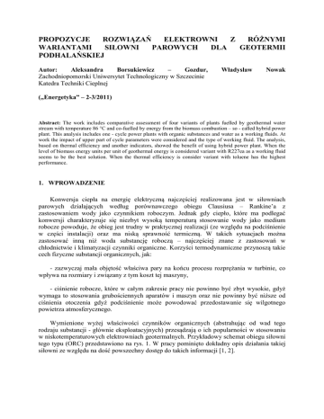 PROPOZYCJE ROZWIĄZAŃ ELEKTROWNI Z RÓŻNYMI WARIANTAMI SIŁOWNI PAROWYCH DLA GEOTERMII PODHALAŃSKIEJ Autor: Aleksandra Borsukiewicz – Gozdur, Zachodniopomorski Uniwersytet Technologiczny w Szczecinie Katedra Techniki Cieplnej Władysław Nowak („Energetyka” – 2-3/2011) Abstract: The work includes comparative assessment of four variants of plants fuelled by geothermal water stream with temperature 86 °C and co-fuelled by energy from the biomass combustion – so - called hybrid power plant. This analysis includes one - cycle power plants with organic substances and water as a working fluids. At work the impact of upper part of cycle parameters were considered and the type of working fluid. The analysis, based on thermal efficiency and another indicators, showed the benefit of using hybrid power plant. When the level of biomass energy units per unit of geothermal energy is considered variant with R227ea as a working fluid seems to be the best solution. When the thermal efficiency is consider variant with toluene has the highest performance. 1. WPROWADZENIE Konwersja ciepła na energię elektryczną najczęściej realizowana jest w siłowniach parowych działających według porównawczego obiegu Clausiusa – Rankine’a z zastosowaniem wody jako czynnikiem roboczym. Jednak gdy ciepło, które ma podlegać konwersji charakteryzuje się niezbyt wysoką temperaturą stosowanie wody jako medium robocze powoduje, że obieg jest trudny w praktycznej realizacji (ze względu na podciśnienie w części instalacji) oraz ma niską sprawność termiczną. W takich sytuacjach można zastosować inną niż woda substancję roboczą – najczęściej znane z zastosowań w chłodnictwie i klimatyzacji czynniki organiczne. Korzyści termodynamiczne przynoszą takie cech fizyczne substancji organicznych, jak: - zazwyczaj mała objętość właściwa pary na końcu procesu rozprężania w turbinie, co wpływa na rozmiary i związany z tym koszt tej maszyny, - ciśnienie robocze, które w całym zakresie pracy nie powinno być zbyt wysokie, gdyż wymaga to stosowania grubościennych aparatów i maszyn oraz nie powinny być niższe od ciśnienia otoczenia gdyż podciśnienie może powodować przedostawanie się wilgotnego powietrza atmosferycznego. Wymienione wyżej właściwości czynników organicznych (abstrahując od wad tego rodzaju substancji - głównie eksploatacyjnych) przesądzają o ich popularności w stosowaniu w niskotemperaturowych elektrowniach geotermalnych. Przykładowy schemat obiegu siłowni tego typu (ORC) przedstawiono na rys. 1. W pracy pominięto dokładny opis działania takiej siłowni ze względu na dość powszechny dostęp do takich informacji [1, 2]. o1 czynnik roboczy parowacz turbina parowa ~ geo1 generator woda geotermalna o5 & ORC m geo geo3 o2s geo2 skraplacz podgrzewacz o4 o3 pompa Rys. 1. Schemat instalacji siłowni ORC (wariant ORC) [5] Istnieje wiele udanych wdrożeń ORC w elektrowniach geotermalnych na świecie szczególnie w tych regionach, gdzie zasoby wód geotermalnych są klasyfikowane jako niskotemperaturowe [3], jednak układy tego typu cechują się dość niskimi sprawnościami [2] wynikającymi przede wszystkim z niezbyt wysokiej temperatury górnego źródła ciepła (temperatury wody geotermalnej) oraz stopnia wykorzystania energii zawartej w wodzie geotermalnej. Ocena właściwości termodynamicznych związków organicznych jako czynników obiegowych siłowni parowej pod kątem możliwości poprawy jej efektywności pracy wpłynęła na podjęcie analizy odnośnie możliwości modyfikacji i „wyciągnięcia” jednoczynnikowej siłowni parowej z czynnikiem organicznym w kierunku wyższych temperatur (i ciśnienia) czynnika roboczego w obiegu. Efekt ten można uzyskać poprzez doprowadzanie do obiegu energii z innego źródła na przykład energii uzyskiwanej ze spalania biomasy. Energia uzyskiwana ze spalania biomasy zasila część górną obiegu tzn. wykorzystywana jest do odparowania i w niektórych wariantach (szczegółowo opisanych w pkt. 2) do podgrzewania czynnika roboczego. Schemat instalacji siłowni hybrydowej przedstawiono na rys. 2. czynnik roboczy kocioł w4x w4 geo2 turbina parowa ~ generator podgrzewacz geo1 w1 pompa w2s w3 skraplacz woda geotermalna HYB & geo m Rys. 2. Schemat instalacji siłowni hybrydowej (wariant HYB) [5] 2. PODSTAWOWE ZAŁOŻENIA ORAZ MODELE OBLICZENIOWE W ramach pracy wykonano analizę energetyczną elektrowni geotermalnej z siłownią ORC (rys. 1) oraz trzech wariantów elektrowni hybrydowych (rys. 2). Punktem wyjścia analizy energetycznej dla wszystkich wariantów elektrowni jest przyjęcie, że do dyspozycji pozostaje woda geotermalna o temperaturze Tgeo1=86oC i stałym strumieniu co można zapisać równaniem. & ORC & HYB & m geo = m geo = m geo = 35 kg/s (1) Przyjęto, że temperatura skraplania czynnika roboczego wynosi To3 = Tw 3 = Tb 3 = 30°C (2) tym samym największy możliwy stopień wykorzystania energii wody geotermalnej (przy założeniu, że minimalna, napędowa różnica temperatur pomiędzy czynnikami wymieniającymi energię wynosi ∆Tpp=3K) będzie miał miejsce w sytuacji, gdy temperatura wody geotermalnej zatłaczanej będzie wynosić min Tgeo 2 = 33°C (3) Na tej podstawie zdefiniowano wielkość dyspozycyjnego (możliwego do wykorzystania): ( min & & geo c pgeo Tgeo1 − Tgeo Q =m geo 2 ) strumienia ciepła geotermalnego (4) Wielkość ta jest użyteczna w określaniu stopnia wykorzystania energii wody geotermalnej ϕ , zapisanej zależnością (5), będącą ilorazem strumienia ciepła faktycznie wykorzystywanego w poszczególnych wariantach siłowni do wartości strumienia ciepła dyspozycyjnego. ϕ = &i Q geo & Q (5) geo gdzie i= ORC lub HYB. & i dla każdego wariantu elektrowni podano w dalszej części pracy. Sposób obliczenia Q geo Różnica pomiędzy strumieniem ciepła dyspozycyjnego a strumieniem ciepła faktycznie wykorzystanego to strumień ciepła zatłaczanego do z