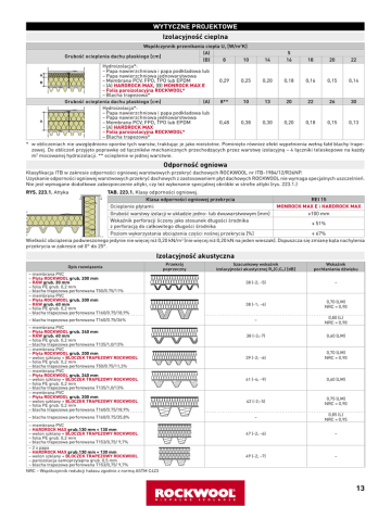 WYTYCZNE PROJEKTOWE Izolacyjność cieplna Współczynnik przenikania ciepła Uc [W/m2K] (A) 5 Grubość ocieplenia dachu płaskiego [cm] (B) 8 10 14 16 18 20 22 Hydroizolacja*: – Papa nawierzchniowa i papa podkładowa lub A – Papa nawierzchniowa jednowarstwowa – Membrana PCV, FPO, TPO lub EPDM 0,29 0,25 0,20 0,18 0,16 0,15 0,14 B – (A) HARDROCK MAX, (B) MONROCK MAX E – Folia paroizolacyjna ROCKWOOL* – Blacha trapezowa* Grubość ocieplenia dachu płaskiego [cm] (A) 8** 10 13 20 22 26 30 Hydroizolacja*: – Papa nawierzchniowa i papa podkładowa lub – Papa nawierzchniowa jednowarstwowa A – Membrana PCV, FPO, TPO lub EPDM 0,48 0,38 0,30 0,20 0,18 0,15 0,13 – (A) HARDROCK MAX – Folia paroizolacyjna ROCKWOOL* – Blacha trapezowa* * w obliczeniach nie uwzględniono oporów tych warstw, traktując je jako nieistotne. Pominięto również efekt wypełnienia wełną fałd blachy trapezowej. Do obliczeń przyjęto poprawkę od łączników mechanicznych przechodzących przez warstwę izolacyjną – 4 łączniki teleskopowe na każdy m2 mocowanej hydroizolacji. ** ocieplenie w jednej warstwie. Odporność ogniowa Klasyfikacja ITB w zakresie odporności ogniowej warstwowych przekryć dachowych ROCKWOOL nr ITB-1984/12/R36NP. Uzyskanie odporności ogniowej warstwowych przekryć dachowych z zastosowaniem płyt dachowych ROCKWOOL nie wymaga specjalnych uszczelnień. Nie jest wymagane dodatkowe zabezpieczenie attyki, czy też wykonanie specjalnej obróbki w strefie attyki (rys. 223.1.) RYS. 223.1. Attyka TAB. 223.1. Klasy odporności ogniowej. Klasa odporności ogniowej przekrycia REI 15 Ocieplenie płytami: MONROCK MAX E i HARDROCK MAX Grubość warstwy izolacji w układzie jedno- lub dwuwarstwowym [mm] ≥100 mm Wskaźnik perforacji liczony jako stosunek długości środnika ≤ 51% z perforacją do całkowitego długości środnika Poziom wykorzystania obciążenia części nośnej przekrycia [%] ≤ 67% Wielkość obciążenia podwieszonego jedynie nie więcej niż 0,20 kN/m2 (nie więcej niż 0,20 kN na jeden wieszak). Dopuszcza się zmianę kąta nachylenia przekrycia w zakresie od 0° do 25°. Izolacyjność akustyczna Opis rozwiązania – membrana PVC – Płyta ROCKWOOL grub. 200 mm – RAW grub. 30 mm – folia PE grub. 0,2 mm – blacha trapezowa perforowana T50/0.75/11% – membrana PVC – Płyta ROCKWOOL grub. 200 mm – RAW grub. 40 mm – folia PE grub. 0,2 mm – blacha trapezowa perforowana T160/0.75/18,9% – blacha trapezowa perforowana T160/0.75/36% – membrana PVC – Płyta ROCKWOOL grub. 240 mm – RAW grub. 40 mm – folia PE grub. 0,2 mm – blacha trapezowa perforowana T135/1,0/13% – membrana PVC – Płyta ROCKWOOL grub. 200 mm – welon szklany + BLOCZEK TRAPEZOWY ROCKWOOL – folia PE grub. 0,2 mm – blacha trapezowa perforowana T50/0.75/11,3% – membrana PVC – Płyta ROCKWOOL grub. 240 mm – welon szklany + BLOCZEK TRAPEZOWY ROCKWOOL – folia PE grub. 0,2 mm – blacha trapezowa perforowana T135/1,0/13% – membrana PVC – Płyta ROCKWOOL grub. 200 mm – welon szklany + BLOCZEK TRAPEZOWY ROCKWOOL – folia PE grub. 0,2 mm – blacha trapezowa perforowana T160/0.75/18,9% – blacha trapezowa perforowana T160/0.75/35,8% – membrana PVC – HARDROCK MAX grub.130 mm + 130 mm – welon szklany + BLOCZEK TRAPEZOWY ROCKWOOL – folia PE grub. 0,2 mm – blacha trapezowa perforowana T153/0,75/ 9,7% – 2 x papa – HARDROCK MAX grub.130 mm + 130 mm – welon szklany + BLOCZEK TRAPEZOWY ROCKWOOL – paroizolacja samoprzylepna grub. 0,5 mm – blacha trapezowa perforowana T153/0,75/ 9,7% NRC – Współczynnik redukcji hałasu zgodnie z normą ASTM C423 Przekrój poprzeczny Szacunkowy wskaźnik izolacyjności akustycznej Rw(C;Ctr) [dB] Wskaźnik pochłaniania dźwięku 38 (-2; -5) – 38 (-1; -4) 0,70 (LM) NRC = 0,90 – 0,80 (L) NRC = 0,90 38 (-3;-7) 0,60 (LM) 39 (-2; -6) 0,70 (LM) NRC = 0,90 41 (-4; -9) 0,60 (LM) 42 (-2;-5) 0,75 (LM) NRC = 0,90 – 0,85 (L) NRC = 0,95 47 (-2; -6) – 49 (-2; -7) – 13 Ochrona przed zawilgoceniem warstw i zagrzybieniem Dla właściwej ochrony przed zawilgoceniem warstw i powstaniem zagrzybienia dobieramy odpowiednią paroizolację. Zmieniając parametry paroizolacji (zwiększając jej ekwiwalentną dyfuzyjną grubość powietrza Sd) eliminujemy efekt narastania zawilgocenia, spowodowanego kondensacją pary wodnej. TAB. 223.2. Klasyfikacja pomieszczeń zależnie od ich mikroklimatu. Ciśnienie pary wodnej [hPa] rzeczywiste nasyconej pn Klasa wilgotności Pomieszczenia do 2,7 1 garaże, składy, sucha produkcja od 2,7 do 5,4 2 biura, sale sprzedaży, sklepy od 10 do 13 od 5,4 do 8,1 3 pokoje, mieszkania niezagęszczone od 13 do 16 od 8,1 do 10,8 4 kuchnie, kantyny, hale sportowe do 10 Paroizolacja folia paroizolacyjna ROCKWOOL Wykonujemy obliczenia sprawdzające możliwość powstania zawilgocenia warstw i ewentualnego zagrzybienia, wykorzystując np. kalkulator cieplno-wilgotnościowy ze strony www.rockwool.pl. W przypadku wystąpienia efektu kondensacji należy rozważyć zastosowanie 1 kominka wentylacyjnego na każde 50 m2 pokrycia, w celu umożliwienia odprowadzenia kondensatu z przegrody. WYTYCZNE WYKONAWCZE a) Płyty powinny być układane mijankowo w każdej warstwie, zachowując minimalne przesuniecie styków o 100 mm w sąsiednich warstwach. b) Płyty powinny być przenoszone w trakcie montażu przy uchwycie za dłuższe krawędzie. W miarę możliwości należy tak zaplanować prace, aby zminimalizować ilość wprowadzanych na dach obciążeń w trakcie prac, jak również w jego późniejszej eksploatacji. 1 2 RYS. 223.2. Rekomendowany sposób przenoszenia płyt. c) Dla wybranego rodzaju hydroizolacji należy sprawdzić u jej dostawcy konieczność stosowania klinów dachowych ROCKFALL (KD), rys. 223.3 (najczęściej są zalecane przed producentów pokryć papowych). d) Na blachach trapezowych należy dobrać minimalną wymaganą grubość płyt MONROCK MAX E i HARDROCK MAX, zależnie od odległości 