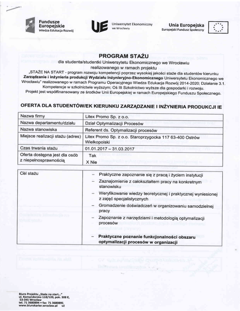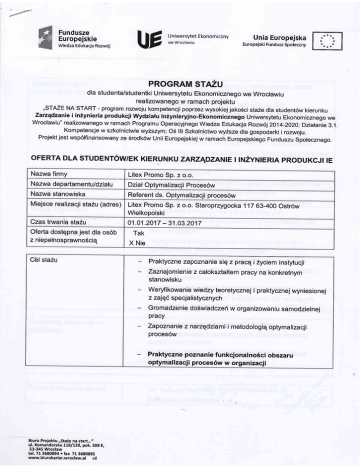 a a -.aE VP Fundusze Europejskie Wiedza Edukacja Rozw6j Ekonomiczny Unia EUfOpejska | wrociawiu Europejski Fundusz ipoleczny I Uniwersytet we :i* -': * *J PROGRAM STAZU dla studenta/studentki Uniwersytetu Ekonomicznego we Wroclawiu realizowanego w ramach projektu ,,STAZE NA START - program rozwoju kompetencji poptzezwysokiejjako5ci sta2e dla student6w kierunku Zarzqdzanie i in2ynieria produkcjiWydzialu Iniynieryjno-Ekonomicznego Uniwersytetu Ekonomicznego we wroclawiu" realizowanego w ramach Programu operacyjnego wiedza Edukacja Rozw6j 2014-2020; ozialanie g.1. Kompetencje w szkolnictwie wyzszym; OS lll Szkolnictwo wyzsze dla gospodarki i rozwoju. Projekt jest wsp6lfinansowany ze Srodk6w Unii Europejskiej w ramach Europejskiego Funduszu Spolecznego. OFERTA DLA STUDENTOWEK KIERUNKU ZARZADZANIE I INZYNIER;A PRODUKCJT tE Nazwa firmy Litex Promo Sp. z o.o. Nazwa departamentu/dziaNu Dzial Optym alizacji Proces6w Nazwa stanowiska Referent ds. Optyma lizaqi proces6w Miejsce realizaqi sta2u (adres) Litex Promo Sp. z o.o. Staroprzygocka 117 63-400 Ostr6w Wielkopolski Czas tnrvania stazu 01.01.2017 Oferta dostqpna jest dla os6b z niepelnosprawnoSciq Cbl stazu - 31.03.2017 Tak X Nie | - Praktyczne zapoznaniesiQ z pracA i zyciem instytucji Zaznalomienie z caloksztattem pracy na konkretnym stanowisku Weryfi kowa n ie wiedzy teo retycznej i z za1q6, specja istycznych p ra ktycznej wyn ies io nej I Gromadzenie do5wiadczefi w organizowan iu samodzielnej pracy Zapoznanie z narzqdziami i metodologiq optym alizaqi proces6w Praktyczne poznan ie funkcional no6ci obszaru optymalizacji proces6w w organizacji Biuro Projektu,,Staie na start.,.,, uf. Komandorcka!!8i12O, pok.308 53-345 Wroclaw tef.71 3680894 0lax 7! 3680895 www,blurokarier,wroclaw.ol vz E, I I Fundusze Europejskie Wiedza Edukacja Rozw6j Zakres czynno5ci i Harmonogram zadah UE ::*:J'.r-T' Ekonomicznv .","Lln',?*ro1l?lr."i?L? E Analiza procesu produkcyjnego - standaryzacja, bilans operator6w, Shopfloor Management Doskonalenie metod pracy - TWI (JM, Jl, JR) Rozpoznawanie warto6ci procesu (warto66 dodana, marnotrawstwo) Udzial w mapowaniu procesu produkcyjnego Udzial w spotkaniach analizy problem6w produkcyjnych Samodzielne tworzenie arkusza RCA wraz z analizqkoszt6w. Analiza procesu przezbrojeh Rozw6j programu 5s Udzial w rozmowach z osobami nadzorujqcymi proces oraz pracownikami - sprawozdanie produkcyjne (calo6c zakresu zrealizowana w okresie 3 miesiqcy) Rodzaj uzyskanych Um iejqtno6 kom petencj i, zwiqzany ch z efektami ksztalcenia, zdobywanych podczas realizacji stazu e analizy proces6w prod u kcyj nych Umiejqtno66 szkolenia pracownik6w w mySl metody TWI Praca w zespole iejqtnoS6 wykorzystywa n ia wiedzy teoretyczn ej w ozwiqzyw an u p rob lem6w pra ktycznych Um r i Odpowiedzialno6i za wsp6lnie realizowan e zadania Diagnozowanie i rozwiqzywanie problem6w zwiqzanych z procesami produkcyjnymi Um iejqtno66 prezentacj i informacj i (ra portowa n ie) Umiejqtno66 zastosowania i poslugiwania siq wybranymi narzqdziami Lean Management Dodatkowe informacje na temat staZu Udzial w zespolach analiz procesu / problemu Udzial w spotkaniach produkcyjnych kazdego poziomu zarzqdzania (czynny) Budowanie relacji z pracownikami w ideologii ciqglego doskonalenia Forma aplikowania na staz Rozmowa kwalifikacyj Biuro Projektu,,Staie na start,.," ul. Komandorska t1.8l12O, pok. 308 53-345 Wroclaw tel. 71 3680894. fax 71 3680895 www.biurokarier,wroclaw.Dl v2 E, Fundusze aE Europejskie Wiedza Edukacja Rozw6j :i#,::'J-T' Ekonomicznv r,,"Llni,?":.T:lr:/":f E WYMAGAN tA STAWTAN E PRZEZ PRACODAWCE Wiedza Pod stawowe zagad n ie nia z zakresu zarzqdza n ia p rod u kcj4 m i le widziana z zakresu lean management Umiejqtno6ci B udowa n ie pozytywn ych relacj i, efektywna wsp6lpraca, Znajomo56 jqzyk6w Znajomo56 program6w komputerowych Mile widziane (autocad, excel) Prawo jazdy Inne, jakie (data i czytelny podpis Pracodawcy lub osoby upowaznionej do reprezentowania Pracodawcy) Biuro Projektu,,Staie na start,.." uf. Komandorckal1,Sll20, pok.308 53-345 Wroclaw tef. 71 3680894 c lax 7L 3680895 www,biurokarier,wroclaw.pl v2 E,