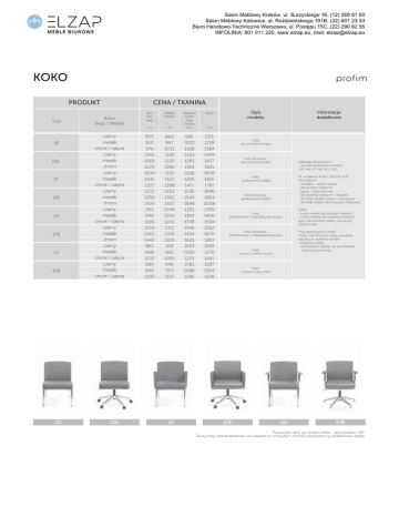 Salon Meblowy Kraków, ul. Surzyckiego 16, (12) 269 81 60 Salon Meblowy Katowice, al. Roździeńskiego 191B, (32) 601 23 33 Biuro Handlowo-Techniczne Warszawa, ul. Postępu 15C, (22) 290 62 55 INFOLINIA: 801 011 220, www.elzap.eu, mail: [email protected] KOKO CENA / TKANINA PRODUKT Kod 10 10E 1P 1PE 1H 1HE 1U 1UK 10 Kolor bazy / stelaża czarny metalik chrom / satyna czarny metalik chrom czarny metalik chrom / satyna czarny metalik chrom czarny metalik chrom / satyna czarny metalik chrom czarny metalik chrom / satyna czarny metalik chrom / satyna 10E Eco Evo Next Medley Softline Skóra ( II ) Aquarius Fame Step Ultima ( III ) (I) 803 810 976 1061 1069 1223 1034 1041 1207 1272 1280 1434 991 998 1186 1254 1262 1443 861 868 1033 889 896 1100 860 867 1033 1118 1126 1280 1115 1122 1288 1353 1361 1515 1048 1055 1243 1311 1319 1500 918 925 1090 946 953 1157 995 1002 1168 1253 1261 1415 1298 1305 1471 1536 1544 1698 1183 1190 1378 1446 1454 1635 1053 1060 1225 1081 1088 1292 1211 1218 1384 1469 1477 1631 1608 1615 1781 1846 1854 2008 1399 1406 1594 1662 1670 1851 1269 1276 1441 1297 1304 1508 1P Opis modelu Informacje dodatkowe ( IV ) fotel, bez podłokietników fotel obrotowy, bez podłokietników Nakładka drewniana H - wg standardowych kolorów (H5, H6, H7, H8, H11, H12). W modelach KOKO 10E/1PE/1HE na stopkach: - standard - stopki twarde (do podłóg miękkich), - opcja - stopki filcowe (do podłóg twardych) - dopłata: 44 zł/kpl (stopki czarne - tworzywo), 49 zł/kpl (stopki chromowane, metalowe). fotel, podłokietniki pełne fotel obrotowy, podłokietniki pełne fotel, podłokietniki z nakładką drewnianą fotel obrotowy, podłokietniki z nakładką drewnianą fotel, uchwyt z jednej strony Kółka: - kółka twarde (do podłóg miękkich), - kółka miękkie (do podłóg twardych), (przy zamówieniu należy zaznaczyć rodzaj kółek). Przy zamówieniu modeli KOKO 10E/1PE/1HE należy wyraźnie zaznaczyć wybrany wariant: - kółka lub stopki, - amortyzator zwykły lub amortyzator z pamięcią powrotu. fotel, uchwyt z obu stron 1PE 1H 1HE Powyższe ceny są cenami netto - bez podatku VAT. Za wyroby niestandardowe nie zawarte w niniejszym cenniku pobierane są dodatkowe opłaty. Salon Meblowy Kraków, ul. Surzyckiego 16, (12) 269 81 60 Salon Meblowy Katowice, al. Roździeńskiego 191B, (32) 601 23 33 Biuro Handlowo-Techniczne Warszawa, ul. Postępu 15C, (22) 290 62 55 INFOLINIA: 801 011 220, www.elzap.eu, mail: [email protected] KOKO Dane techniczne 550 680 500 870 17,0 700 0,43 m3 0,43 m3 19,0 680 430 (kółka 420-510) (stopki 420-490) 1H 870 17,0 700 0,43 m3 0,43 m3 stopki 700 720 kółka 870 680 (ø 720) 700 1HE 20,0 720 21,0 kółka 470-560 stopki 460-530 710 1PE 24,0 kółka 850-940 stopki 830-900 700 500 550 640 840 450 (410) 680 (ø 720) 680 500 550 220 430 (kółka 420-510) (stopki 420-490) kółka 470-560 stopki 460-530 720 700 22,0 500 550 kółka 850-940 stopki 830-900 870 18,0 680 kółka 20,0 720 200 0,43 m3 stopki 700 stopki 710 1P 21,0 kółka 870 22,0 700 10E 720 25,0 670 840 450 (410) 680 (ø 720) 10 / 10U / 10UK 14,0 500 550 430 (kółka 420-510) (stopki 420-490) kółka 470-560 stopki 460-530 840 450 (410) 710 17,0 640 500 550 kółka 850-940 stopki 830-900 550 24,0 720 870 21,0 25,0 22,0 700 0,43 m3 Salon Meblowy Kraków, ul. Surzyckiego 16, (12) 269 81 60 Salon Meblowy Katowice, al. Roździeńskiego 191B, (32) 601 23 33 Biuro Handlowo-Techniczne Warszawa, ul. Postępu 15C, (22) 290 62 55 INFOLINIA: 801 011 220, www.elzap.eu, mail: [email protected] KOKO CENA / TKANINA PRODUKT Kolor bazy / stelaża Kod czarny metalik chrom / satyna czarny metalik chrom / satyna czarny metalik chrom / satyna czarny metalik chrom / satyna czarny metalik chrom / satyna 20 2P 2H 2U 2UK 20 Eco Evo Next Medley Softline (I) 1531 1540 1706 1763 1772 1938 1718 1727 1915 1588 1597 1763 1616 1625 1830 2P Skóra ( II ) Aquarius Fame Step Ultima ( III ) 1653 1662 1828 1909 1918 2084 1840 1849 2037 1710 1719 1885 1738 1747 1952 1943 1952 2118 2250 2259 2425 2130 2139 2327 2000 2009 2175 2028 2037 2242 2403 2412 2578 2814 2823 2989 2590 2599 2787 2460 2469 2635 2488 2497 2702 Opis modelu Informacje dodatkowe ( IV ) sofa, 2 siedziska, bez podłokietników sofa, 2 siedziska, podłokietniki pełne sofa, 2 siedziska, podłokietniki z nakładką drewnianą Nakładka drewniana H - wg standardowych kolorów (H5, H6, H7, H8, H11, H12). sofa, 2 siedziska, uchwyt z jednej strony sofa, 2 siedziska, uchwyt z obu stron 2H Powyższe ceny są cenami netto - bez podatku VAT. Za wyroby niestandardowe nie zawarte w niniejszym cenniku pobierane są dodatkowe opłaty. Salon Meblowy Kraków, ul. Surzyckiego 16, (12) 269 81 60 Salon Meblowy Katowice, al. Roździeńskiego 191B, (32) 601 23 33 Biuro Handlowo-Techniczne Warszawa, ul. Postępu 15C, (22) 290 62 55 INFOLINIA: 801 011 220, www.elzap.eu, mail: [email protected] KOKO Dane techniczne 1210 500 1230 500 840 450 (410) 710 710 20 / 2U / 2UK 30,0 2H 33,0 860 24,0 710 2P 1490 810 33,0 1490 860 27,0 810 1,00 m3 500 1100 670 450 (410) 450 (410) 840 1100 840 1100 640 1100 1490 860 27,0 810 1,00 m3 1,00 m3 Salon Meblowy Kraków, ul. Surzyckiego 16, (12) 269 81 60 Salon Meblowy Katowice, al. Roździeńskiego 191B, (32) 601 23 33 Biuro Handlowo-Techniczne Warszawa, ul. Postępu 15C, (22) 290 62 55 INFOLINIA: 801 011 220, www.elzap.eu, mail: [email protected] KOKO CENA / TKANINA PRODUKT Kolor bazy / stelaża Kod czarny metalik chrom / satyna czarny metalik chrom / satyna czarny metalik chrom / satyna czarny metalik chrom / satyna czarny metalik chrom / satyna 30 3P 3H 3U 3UK 30 Eco Evo Next Medley Softline (I) 2123 2136 2300 2454 2467 2631 2311 2324 2511 2181 2194 2358 2209 2222 2423 Skóra ( II ) Aquarius Fame Step Ultima ( III ) 2294 2307 2471 2650 2663 2827 2482 2495 2682 2352 2365 2529 2380 2393 2594 2741 2754 2918 3156 3169 3333 2929 2942 3129 2799 2812 2976 2827 2840 3041 3432 3445 3609 3964 3977 4141 3620 3633 3820 3490 3503 3667 3518 3531 3732 Opis modelu Informacje doda