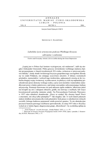 ANNALES UNIVERSITATIS MARIAE CURIE-SKŁODOWSKA LUBLIN – POLONIA VOL. II SECTIO L 2004 Instytut Sztuk Pi˛eknych UMCS I RENEUSZ J. K AMI ŃSKI Lubelskie życie artystyczne podczas Wielkiego Kryzysu odświ˛etne i codzienne Festive and Everyday Artistic Life in Lublin during the Great Depression „Lepiej jest w Polsce być koniem wyścigowym, niż malarzem”, żalił si˛e niegdyś Aleksander Gierymski. Pełne goryczy stwierdzenie wybitnego malarza ch˛etnie przypominano w latach trzydziestych XX wieku, zwłaszcza w pierwszej połowie dekady1 , kiedy skutki światowego kryzysu gospodarczego szczególnie dawały si˛e we znaki Polakom, nie omijajac ˛ oczywiście artystów. Z lektury rozmaitych artykułów, memoriałów i uchwał tego środowiska, ogłaszanych zreszta˛ aż do wybuchu drugiej wojny światowej, wynika nawet, że plastycy czuli si˛e najbardziej poszkodowani przez demony wolnego rynku, a przy tym moralnie i materialnie zaniedbywani przez władze państwowe, nad miar˛e oszcz˛ednie subwencjonujace ˛ kultur˛e artystyczna.˛ Pretensje kierowano też pod adresem ogółu rodaków, albowiem jakoś nie kwapili si˛e oni z zakupem obrazów, grafik, nie mówiac ˛ o rzeźbach, lub wr˛ecz kwestionowali potrzeb˛e istnienia sztuki. Na Powszechnym Festiwalu Warszawy w 1937 roku młodzież skandowała: „Precz ze sztuka! ˛ My chcemy haseł! Precz 2 z artystami, oni chca˛ tylko pieni˛edzy!” Jak niegdyś, tak i w tych latach jedynym stałym źródłem utrzymania dla wielu plastyków była praca w szkolnictwie różnych szczebli, którego kadrowa pojemność miała przecież granice. To nie abstrakcyjne poczucie humoru pewnego rzeźbiarza spowodowało, że zima˛ 1937 roku w Krynicy wykuł on w lodzie figury alegorycznej grupy „Bezrobocie”, by za drobna˛ opłata˛ na 1 „Sztuk Pi˛eknych” rocznik dziewiaty, ˛ „Sztuki Pi˛ekne” 1933, z. 1, s. IV. Materiały do dziejów Instytutu Propagandy Sztuki (1930–1939), oprac. i przedm. J. Sosnowska, IS PAN, Warszawa 1992, s. 17. 2 10 Ireneusz J. Kamiński cele charytatywne „udost˛epniać” obiekt rozbawionym kuracjuszom.3 Wcześniej (1936) podobny temat podjał˛ lublinianin Zygmunt Bartkiewicz, który farba˛ olejna˛ zgrabnie namalował obraz „Pałac bezrobotnych artystów w Kazimierzu”. Oczywiście, Lublin tamtego czasu również borykał si˛e z ci˛eżka˛ depresja˛ gospodarcza.˛ W fabrykach skracano tydzień pracy lub je zamykano. Malały zarobki, rosło bezrobocie, w mi˛edzywojniu zawsze tu zreszta˛ wysokie. Wielu mieszkańców, proporcjonalnie najwi˛ecej w kraju, chorowało na gruźlic˛e. Zmniejszyła si˛e liczba ludności miasta: ze 119 200 w 1930 do 114 315 w 1935 roku, co pozostawało w zwiazku ˛ z osłabieniem, a wreszcie ustaniem migracji mieszkańców prowincji do Lublina, gdzie wcześniej mogli oni liczyć na zatrudnienie.4 Majac ˛ na uwadze ów regres, wpływowy dziennik oznajmiał w poczatkach ˛ 1934 roku, iż mamy do czynienia ze świadectwem „niesłychanej n˛edzy panujacej ˛ w mieście [. . . ] rozpowszechnionej w kraju”5 . Bieda ta wynikała w cz˛eści z ogromnego zadłużenia Lublina. Jego finanse obciażała ˛ zwłaszcza spłata kredytu zaciagni˛ ˛ etego jeszcze w połowie lat dwudziestych w amerykańskim towarzystwie Ulen and Co. Jedynie pół procent ogólnych wydatków miasta w okresie 1933/1934 przeznaczano na „kultur˛e i sztuk˛e”.6 W praktyce oznaczało to skromne subwencjonowanie tylko Biblioteki Publicznej im. Hieronima Łopacińskiego i Muzeum Lubelskiego. Potencjał materialny i stan ducha lublinian wyraźnie ilustruje statystyka lokalnych wydawnictw prasowych. Otóż, jeśli w 1928 roku ukazywało si˛e nad Bystrzyca˛ 36 tytułów czasopism, gazet i gazetek, to w 1932 było ich tylko 21.7 Naturalnie, horyzont ideowy społeczeństwa polskiego czasów kryzysu nie był pusty. Wypełniały go rozmaite cele, wartości i utopie — od skrajnie prawicowych po radykalnie lewicowe. Wyróżniała si˛e wśród nich „państwowotwórcza” idea Polski mocarstwowej, powiazana ˛ z kultem Józefa Piłsudskiego. Propagowana silnie przez sanacj˛e po przewrocie majowym 1926 roku, określała ona jeden z głównych kierunków działalności Bezpartyjnego Bloku Współpracy z Rzadem, ˛ formacji politycznie dość przecież umiarkowanej w porównaniu z nacjonalistycznym i wojowniczo nastawionym Obozem Zjednoczenia Narodowego („Ozonem”), powstałym w 1937 roku, po oficjalnym rozwiazaniu ˛ BBWR (1935). Pomijajac ˛ niebagatelne, lecz dobrze znane kwestie społeczno-politycznych implikacji wspomnianej idei, zwróćmy jedynie uwag˛e na jej znaczenie w polu kultury artystycznej. 3 „Bezrobocie” w bryle lodowej, „Express Lubelski i Wołyński” 1937, nr 30, s. 5. A. Kierek, Rozwój gospodarczy Lublina w latach 1918–1939 [w:] Dzieje Lublina, t. II, red. S. Krzykała, Lublin 1975, s. 39. 5 Lublin wyludnia si˛e?, „Głos Lubelski” 1934, nr 311, s. 4. Cytowana˛ opini˛e przytacza, w bardziej rozwini˛etej formie i bez podania strony źródła, A. Kierek (supra). 6 Kierek, op. cit., s. 109. 7 R., Ile mamy czasopism w Lublinie, „Kurier Lubelski” 1932, nr 188, s. 5. 4 Lubelskie życie artystyczne podczas Wielkiego Kryzysu. . . 11 Otóż, zdaje si˛e nie ulegać watpliwości, ˛ iż właśnie wizja silnego, liczacego ˛ si˛e w świecie państwa stworzyła warunki sprzyjajace ˛ powstaniu takich ważnych instytucji, jak Towarzystwo Szerzenia Sztuki Polskiej wśród Obcych (w 1926)8 i współpracujacy ˛ z nim Instytut Propagandy Sztuki. W cz˛eści utrzymywane ze środków publicznych, cz˛esto niewystarczajacych, ˛ odegrały one nader pozytywna˛ rol˛e w polskim życiu artystycznym, co nie znaczy, że ich działalność aprobowana była bez reszty. Wiadomo, że na łamach prasy atakowano np. poczynania dyrektora ToSSPO, Mieczysława Tretera, i współzałożyciela IPS-u, Władysława Skoczylasa, któremu wytykano też „grzechy” z nieodległej przeszłości, 