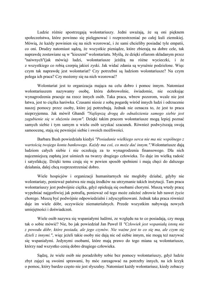 Ludzie różnie spostrzegają wolontariuszy. Jedni uważają, że są oni pięknem społeczeństwa, które powinno się pielęgnować i rozprzestrzeniać po całej kuli ziemskiej. Mówią, że każdy powinien się na nich wzorować, i że sami chcieliby posiadać tyle empatii, co oni. Drudzy natomiast sądzą, że wszystkie pieniądze, które zbierają na dobre cele, tak naprawdę zostawiane są w ''kieszeni'' wolontariatu. Myślą, że dzięki ofiarom składanym przez ''naiwnych''(jak mówią) ludzi, wolontariusze jeżdżą na różne wycieczki, i że z wszystkiego co robią czerpią jakieś zyski. Jak widać zdania są wyraźnie podzielone. Więc czym tak naprawdę jest wolontariat? Czy potrzebni są ludziom wolontariusze? Na czym polega ich praca? Czy możemy się na nich wzorować? Wolontariat jest to organizacja mająca na celu dobro i pomoc innym. Natomiast wolontariuszem nazywamy osobę, która dobrowolnie, świadomie, nie oczekując wynagrodzenia pracuje na rzecz innych osób. Taka praca, wbrew pozorom, wcale nie jest łatwa, jest to ciężka harówka. Czasami niesie z sobą pogardę wśród innych ludzi i odrzucenie naszej pomocy przez osoby, które jej potrzebują. Jednak nie oznacza to, że jest to praca nieprzyjemna. Jak mówił Ghandi "Najlepszą drogą do odnalezienia samego siebie jest zagubienie się w służeniu innym". Dzięki takim pracom wolontariusze mogą lepiej poznać samych siebie i tym samym u wielu osób uzyskać szacunek. Również podwyższają swoją samoocenę, stają się pewniejsi siebie i swoich możliwości. Barbara Bush powiedziała kiedyś "Posiadanie wielkiego serca nie ma nic wspólnego z wartością twojego konta bankowego. Każdy ma coś, co może dać innym.".Wolontariusze dają ludziom całych siebie i nie oczekują za to wynagrodzenia finansowego. Dla nich najcenniejszą zapłatą jest uśmiech na twarzy drugiego człowieka. To daje im wielką radość i satysfakcję. Dzięki temu czują się w pewien sposób spełnieni i mają chęci do dalszego działania, dalej chcą rozprzestrzeniać dobro. Wiele hospicjów i organizacji humanitarnych nie mogłoby działać, gdyby nie wolontariaty, ponieważ państwa nie mają środków na utrzymanie takich instytucji. Tam praca wolontariuszy jest podwójnie ciężka, gdyż opiekują się osobami chorymi. Muszą wtedy pracę wypełniać najgorliwiej jak potrafią, ponieważ od tego może zależeć zdrowie lub nawet życie chorego. Muszą być podwójnie odpowiedzialni i zdyscyplinowani. Jednak taka praca również daje im wiele dóbr, oczywiście niematerialnych. Przede wszystkim nabywają nowych umiejętności i doświadczeń. Wiele osób nazywa się wspaniałymi ludźmi, ze względu na to co posiadają, czy mogą tak o sobie mówić? Nie, bo jak powiedział Jan Paweł II "Człowiek jest wspaniałą istotą nie z powodu dóbr, które posiada, ale jego czynów. Nie ważne jest to co się ma, ale czym się dzieli z innymi.", więc jeżeli takie osoby nie dają nic od siebie innym, nie mogą też nazywać się wspaniałymi. Jedynymi osobami, które mają prawo do tego miana są wolontariusze, którzy nad wszystko cenią dobro drugiego człowieka. Sądzę, że wiele osób nie poradziłoby sobie bez pomocy wolontariuszy, gdyż ludzie zbyt zajęci są swoimi sprawami, by móc zareagować na potrzeby innych, na ich krzyk o pomoc, który bardzo często nie jest słyszalny. Natomiast każdy wolontariusz, kiedy zobaczy smutek na twarzy drugiego człowieka, potrafi się zatrzymać wśród natłoku różnych, innych spraw i zapytać się, czy może jakoś pomóc. Myślę, że każdy z nas powinien się na nich wzorować. ,,Trzeba być dobrym jak chleb, który leży na stole, z którego każdy może kęs ukroić i wziąć dla siebie" i tacy są wolontariusze w naszej szkole. W zeszłym roku zorganizowali wiele akcji charytatywnych, z których pieniądze przeznaczyli m.in. na budowę przedszkola w Kongo, schronisko w Jeleniej Górze, TOZ we Wrocławiu, fundację Centaurus, schronisko w Wałbrzychu, fundację OTOZ Animals w Tczewie. Ponadto zaangażowali się w wirtualne adopcje, jeździli do Domu Małego Dziecka w Wałbrzychu, do schroniska w Jeleniej Górze, do Środowiskowego Domu Samopomocy w Kamiennej Górze. W tym roku znów zabrali się do pracy i wsparli fundację MONDO CANE. Na pewno będą, pracowali tak sumiennie jak w ubiegłym roku i pomogą kolejnym osobom i zwierzętom. Wszyscy naśladujmy wolontariuszy i nieśmy pomoc, bo kiedyś karty mogą się odwrócić i to my możemy jej potrzebować. Autor: Joanna Gumulak Gimnazjum Publiczne w Chełmsku Śląskim