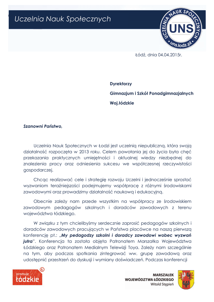 Łódź, dn. ……………………2014 r. Uczelnia Nauk Społecznych Łódź, dnia 04.04.2015r. Dyrektorzy Gimnazjum i Szkół Ponadgimnazjalnych Woj.łódzkie Szanowni Państwo, Uczelnia Nauk Społecznych w Łodzi jest uczelnią niepubliczną, która swoją działalność rozpoczęła w 2013 roku. Celem powołania jej do życia była chęć przekazania praktycznych umiejętności i aktualnej wiedzy niezbędnej do znalezienia pracy oraz odniesienia sukcesu we współczesnej rzeczywistości gospodarczej. Chcąc realizować cele i strategię rozwoju Uczelni i jednocześnie sprostać wyzwaniom teraźniejszości podejmujemy współpracę z różnymi środowiskami zawodowymi oraz prowadzimy działalność naukową i edukacyjną. Obecnie zależy nam przede wszystkim na współpracy ze środowiskiem zawodowym pedagogów szkolnych i doradców zawodowych z terenu województwa łódzkiego. W związku z tym chcielibyśmy serdecznie zaprosić pedagogów szkolnych i doradców zawodowych pracujących w Państwa placówce na naszą pierwszą konferencję pt.: „My pedagodzy szkolni i doradcy zawodowi wobec wyzwań jutra”. Konferencja ta została objęta Patronatem Marszałka Województwa Łódzkiego oraz Patronatem Medialnym Telewizji Toya. Zależy nam szczególnie na tym, aby podczas spotkania zintegrować ww. grupę zawodową oraz udostępnić przestrzeń do dyskusji i wymiany doświadczeń. Podczas konferencji Ul. Kamińskiego 21 90-229 Łódź Tel. 42 232 74 99 zostaną zaprezentowane wybrane sposoby działania (m.in. sposoby radzenia sobie w trudnych zawodowo sytuacjach) i funkcjonowania w systemie szkolnym. Dzięki temu można będzie nie tylko określić obszary do doskonalenia swojego warsztatu zawodowego, ale również promować te pomysły i rozwiązania, które charakteryzują się wyższym poziomem skuteczności w pracy z uczniem i rodzicem. W ramach tego jednodniowego spotkania uczestnicy (pedagodzy/psycholodzy szkolni, doradcy zawodowi) wezmą udział w warsztatach pn. "Integracja środowiska szkolnych pedagogów i doradców zawodowych wobec problemów i wyzwań przyszłości”, które pozwolą poszerzyć posiadającą już wiedzę i podwyższyć poziom umiejętności. Jest to pierwsza edycja takiego przedsięwzięcia, pragniemy jednak w przyszłości organizować kolejne. Do współpracy zostali zaproszeni zarówno przedstawiciele ośrodków naukowych jak i eksperci (tj. wieloletni trenerzy – psycholog i doradca zawodowy), aby podnieść wartość organizowanego spotkania. W ramach konferencji zaplanowano więc warsztaty oraz panel dyskusyjny. Uprzejmie informujemy, iż udział w naszej konferencji jest bezpłatny. Prosimy zapoznać się z wstępnym programem konferencji podanym poniżej. Zatwierdzona wersja programu zostanie Państwu przesłana najpóźniej do 20.05.2015r. W załączeniu przesyłamy formularz zgłoszenia wraz z warunkami uczestnictwa, licząc na obecność Państwa pracowników. Z wyrazami szacunku Rektor Uczelni Nauk Społecznych w Łodzi Dr Agnieszka Kubacka PROGRAM I Konferencja Naukowa UNS w Łodzi „My pedagodzy szkolni i doradcy zawodowi wobec wyzwań jutra” Ul. Kamińskiego 21 w Łodzi 08.30 - 09.00 rejestracja uczestników 09.00 - 09.30 przywitanie zaproszonych gości (przedstawiciela Urzędu Marszałkowskiego w Łodzi, Wydziału Edukacji UMŁ, Kuratorium Oświaty itp.) i uczestników - przez przedstawicieli władzy UNS w Łodzi (Rektor – dr Agnieszkę Kubacką, Prezesa UNS – mgr Rafała Szklarka, Kanclerza UNS – mgr Piotra Domżała) 09.30 – 10.00 MIEJSCE I ROLA PEDAGOGA I DORADCY ZAWODOWEGO W SZKOLE NIEPUBLICZNEJ – mgr Łukasz Sońdka 10.00 – 10.15 MIEJSCE I ROLA DORADCY ZAWODOWEGO W SZKOLE PUBLICZNEJ – mgr Krzysztof Durnaś 10.15 – 10.30 wprowadzenie w tematykę warsztatów – mgr Krzysztof Wilski i mgr Arkadiusz Trzuskowski 10.30 - 11.15 przerwa kawowa 11.30 - 14.00 Warsztaty pt.: " Integracja środowiska szkolnych pedagogów i doradców zawodowych wobec problemów i wyzwań przyszłości (jutra!)" – prowadzenie mgr Krzysztof Wilski i mgr Arkadiusz Trzuskowski 14.00 - 14.30 Podsumowanie warsztatów i zakończenie konferencji