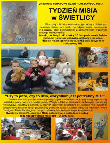 25 listopad ŚWIATOWY DZIEŃ PLUSZOWEGO MISIA TYDZIEŃ MISIA w ŚWIETLICY Pluszowy miś od ponad stu lat jest jedną z ulubionych maskotek dzieci, a i wielu dorosłych szuka pocieszenia w pluszaku albo przynajmniej z sentymentem wspomina swojego starego misia. Miękki, puchaty i taki z łatką. 25 listopada swoje święto obchodzi najmilsza zabawka, najlepszy przyjaciel dzieci i niezastąpiona przytulanka przy zasypianiu – Pluszowy Miś. “Czy to jutro, czy to dziś, wszystkim jest potrzebny Miś!” Świetliczaki różnymi technikami plastycznymi - rozwijając motorykę małą, wyobraźnię i estetykę pracy tworzyły postać misia. Wzięły udział w zabawach ruchowych, uczyły się wierszyków i tekstów piosenek, w których głównym bohaterem był właśnie miś. Wspólnie odczytaliśmy historię misia, poznaliśmy postacie; Misia Uszatka, Kubusia Puchatka, Misia Coralgola, Misia Paddington i innych misiowych bohaterów bajek książkowych. Światowy Dzień Pluszowego Misia ustanowiono dokładnie w setną rocznicę powstania maskotki – w 2002 roku. Miś Pluszowy, a szczególnie ten nasz, wyjątkowy i ukochany, nie jest zwykłą, pluszową zabawką. Nie, nie! Taki Miś, po to misiem jest, żeby było kogo tulić, kiedy pada deszcz. Ma duże uszy, żeby mieć coś do targania i kochania. W końcu Miś ma bardzo miękkie łapki, za które możemy trzymać, kiedy tylko chcemy. ..Miś z zajęć komputerowych dla świetliczków: wychowawcy świetlicy