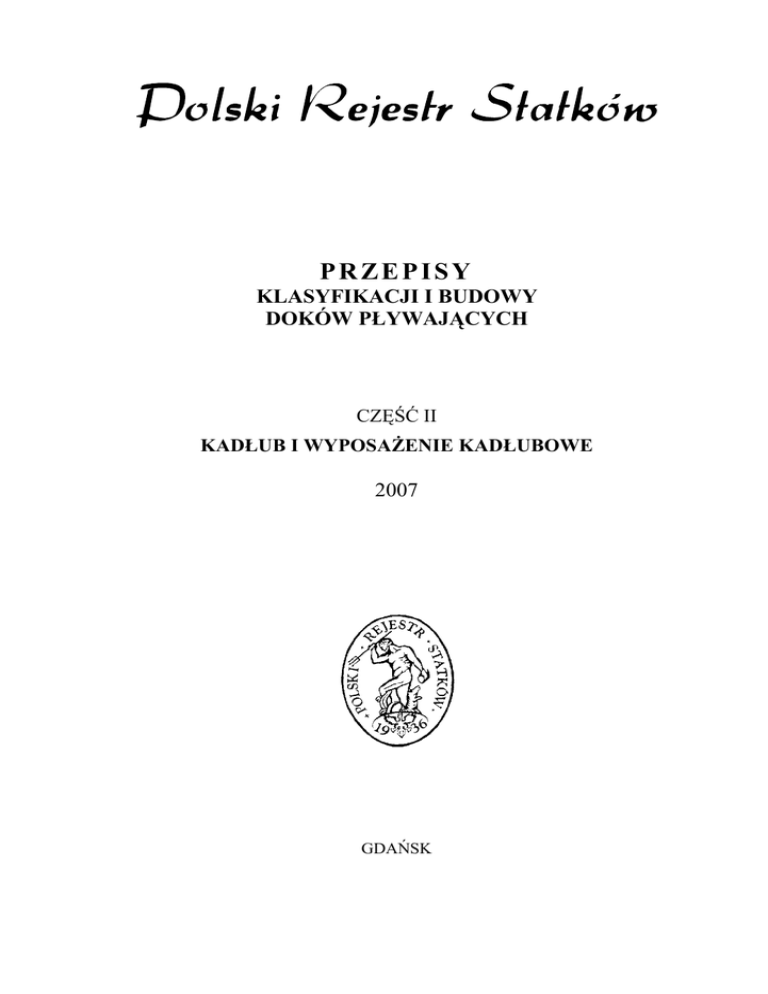 PRZEPISY KLASYFIKACJI I BUDOWY DOKÓW PŁYWAJĄCYCH CZĘŚĆ II KADŁUB I WYPOSAśENIE KADŁUBOWE 2007 GDAŃSK PRZEPISY KLASYFIKACJI I BUDOWY DOKÓW PŁYWAJĄCYCH CZĘŚĆ II KADŁUB I WYPOSAśENIE KADŁUBOWE 2007 GDAŃSK PRZEPISY KLASYFIKACJI I BUDOWY DOKÓW PŁYWAJĄCYCH opracowane i wydane przez Polski Rejestr Statków S.A., zwany dalej PRS, składają się z następujących części: Część I Część II Część III Część IV Część V Część VI Część VII – – – – – – – Zasady klasyfikacji Kadłub i wyposaŜenie kadłubowe Stateczność i wolna burta Ochrona przeciwpoŜarowa Urządzenia maszynowe Urządzenia elektryczne Urządzenia dźwignicowe natomiast w odniesieniu do materiałów i spawania obowiązują wymagania Części IX – Materiały i spawanie, Przepisów klasyfikacji i budowy statków morskich. Część II – Kadłub i wyposaŜenie kadłubowe – 2007, została zatwierdzona przez Zarząd PRS w dniu 11 września 2007 r. i wchodzi w Ŝycie z dniem 15 października 2007 r. Z dniem wejścia w Ŝycie niniejszej Części II, jej wymagania mają zastosowanie do doków pływających, na zasadach określonych w Części I – Zasady klasyfikacji. Rozszerzeniem i uzupełnieniem Części II – Kadłub i wyposaŜenie kadłubowe jest następująca Publikacja: Publikacja Nr 21/P – Próby szczelności kadłuba. © Copyright by Polski Rejestr Statków S.A., 2007 PRS/HW, 09/2007 ISBN 978-83-60629-50-5 SPIS TREŚCI str. 1 Postanowienia ogólne ............................................................................................................... 1.1 Zakres zastosowania ......................................................................................................... 1.2 Zastosowanie innych Przepisów PRS ............................................................................... 1.3 Dokumentacja kadłubowa ................................................................................................. 1.3.1 ZałoŜenia projektowe doku .................................................................................. 1.3.2 Zakres dokumentacji ............................................................................................ 5 5 5 5 5 5 2 Oznaczenia i określenia ........................................................................................................... 6 2.1 Określenia ogólne ..............................................................................................................6 2.2 Podstawowe parametry doku .............................................................................................7 2.3 Oznaczenia ogólne .............................................................................................................7 3 Materiały i ochrona przed korozją ......................................................................................... 3.1 Zasady ogólne ................................................................................................................... 3.2 Stal kadłubowa .................................................................................................................. 3.3 Inne materiały konstrukcyjne ............................................................................................ 3.4 Ochrona przed korozją i naddatki korozyjne .................................................................... 4 Wymagania ogólne dotyczące konstrukcji kadłuba i podstawowych elementów wyposaŜenia doku ................................................................................................................... 10 4.1 Rozmieszczenie podstawowych elementów konstrukcji doku ........................................ 10 4.1.1 Pokład górny ...................................................................................................... 10 4.1.2 Pokład bezpieczeństwa ....................................................................................... 10 4.1.3 Przedziały ochronne ........................................................................................... 11 4.1.4 Grodzie ............................................................................................................... 11 4.1.5 WzdłuŜne i poprzeczne przegrody pontonu doku ............................................... 11 4.1.6 Wiązary i podpory pontonu doku ....................................................................... 11 4.2 Szczegóły konstrukcyjne, połączenia elementów konstrukcyjnych i spawanie .............. 11 4.3 Otwory przepływowe ...................................................................................................... 12 4.4 Elementy wyposaŜenia doku ........................................................................................... 12 4.4.1 Bariery ................................................................................................................ 12 4.4.2 Włazy, szyby zrjściowe, otwory pomiarowe ...................................................... 12 4.4.3 Odbojnice ........................................................................................................... 12 4.4.4 Urządzenia do wprowadzania i centrowania statków ......................................... 13 4.4.5 Podpory stępkowe i boczne ................................................................................ 13 4.4.6 Urządzenia do posadowienia doku ...................................................................... 14 4.4.7 Pomost łaczący dok z lądem ............................................................................... 15 4.4.8 Pomost komunikacyjny pomiędzy basztami ....................................................... 15 4.4.9 Trapy i przestawne klatki komunikacyjne .......................................................... 16 4.5 Sterownia doku ............................................................................................................... 16 5 ObciąŜenia obliczeniowe ................