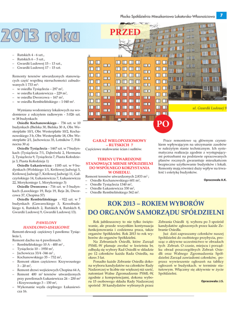 Płocka Spółdzielnia Mieszkaniowa Lokatorsko-Własnościowa 7 PRZED – – – – Rutskich 4 - 6 szt., Rutskich 6 – 5 szt., Gwardii Ludowej 15 – 13 szt., Gwardii Ludowej 17 – 15 szt. Remonty terenów utwardzonych stanowiących część wspólną nieruchomości zabudowanych 1 733 m2: – w osiedlu Tysiąclecia – 297 m2, – w osiedlu Łukasiewicza – 229 m2, – w osiedlu Dworcowa – 167 m2, – w osiedlu Rembielińskiego – 1 040 m2. Wymiana wodomierzy lokalowych na wodomierze z odczytem radiowym - 5.026 szt. w 38 budynkach: Osiedle Kochanowskiego - 736 szt. w 10 budynkach (Bielska 30, Bielska 30 A, Obr. Westerplatte 10/1, Obr. Westerplatte 10/2, Kochanowskiego 3 b, Obr. Westerplatte 18, Obr. Westerplatte 2/1, Jachowicza 35, Lotników 7, Północna 30 a) Osiedle Tysiąclecia – 1467 szt. w 7 budynkach (Tysiąclecia 7/1, Dąbrówki 2, Hermana 2, Tysiąclecia 9, Tysiąclecia 7, Piasta Kołodzieja 3, Piasta Kołodzieja 1) Osiedle Łukasiewicza - 1185 szt. w 9 budynkach (Wolskiego 1/1, Królowej Jadwigi 5, Królowej Jadwigi 7, Królowej Jadwigi 11, Gałczyńskiego 14, Łukasiewicza 7, Łukasiewicza 22, Morykoniego 1, Morykoniego 3) Osiedle Dworcowa - 716 szt. w 5 budynkach (Lasockiego 19, Reja 19, Reja 26, Dworcowa 37, Chopina 57) Osiedle Rembielińskiego - 922 szt. w 7 budynkach (Gawareckiego 3, Kossobudzkiego 6, Rutskich 2, Rutskich 4, Rutskich 8, Gwardii Ludowej 9, Gwardii Ludowej 13). PAWILONY HANDLOWO-USŁUGOWE Remont elewacji częściowy 1 pawilonu: Tysiąclecia 1, Remont dachu na 4 pawilonach: – Rembielińskiego 10 A - 400 m2 , – Tysiąclecia 10 – 1950 m2, – Jachowicza 33/4 -346 m2 , – Kochanowskiego 35 – 732 m2, – Remont okien częściowo: Krzywoustego 3 – 20 m2, – Remont drzwi wejściowych Chopina 64 A, – Remont 400 m2 terenów utwardzonych przy pawilonach Łukasiewicza 24 – 250 m2 i Krzywoustego 3 – 150 m2, – Wykonanie węzła cieplnego: Łukasiewicza 16. ul. Gwardii Ludowej 9 PO GARAŻ WIELOPOZIOMOWY – RUTSKICH 7 Częściowe malowanie ścian i sufitów. TERENY UTWARDZONE STANOWIĄCE MIENIE SPÓŁDZIELNI DO WSPÓLNEGO KORZYSTANIA W OSIEDLU. Remont terenów utwardzonych 2.833 m2 ; – Osiedle Kochanowskiego 601 m2, – Osiedle Tysiąclecia 1340 m2, – Osiedle Łukasiewicza 330 m2, – Osiedle Rembielińskiego 562 m2. Prace remontowe są głównym czynnikiem wpływającym na utrzymanie zasobów w należytym stanie technicznym. Ich systematyczna realizacja zgodnie z występującymi potrzebami na podstawie opracowanych planów rocznych gwarantuje mieszkańcom bezpieczne użytkowanie budynków i lokali. Remonty mają również duży wpływ na trwałość i estetykę budynków. Opracowała A.K. ROK 2013 – ROKIEM WYBORÓW DO ORGANÓW SAMORZĄDU SPÓŁDZIELNI Rok jubileuszowy to nie tylko świętowanie, ale przede wszystkim kontynuacja funkcjonowania i codzienna praca, także organów Spółdzielni. Rok 2013 to rok wyborów do organów Spółdzielni. Na Zebraniach Osiedli, które Zarząd PSML-W planuje zwołać w kwietniu br, odbędą się wybory Rad Osiedli w składzie po 12 członków każda Rada Osiedla, na okres 3 lat. Ponadto każde Zebranie Osiedla dokona wyboru kandydatów na członków Rady Nadzorczej w liczbie nie większej niż sześć, natomiast Walne Zgromadzenie PSML-W, zgodnie z kompetencjami, dokona wyboru 15 osobowego składu Rady Nadzorczej spośród 30 kandydatów wybranych przez Zebrania Osiedli tj. wyboru po 3 spośród kandydatów zgłoszonych przez każde Zebranie Osiedla. Już dziś zapraszamy członków naszej Spółdzielni do osobistego przybycia, prosząc o aktywne uczestnictwo w obradach tych Zebrań. O czasie, miejscu i porządku obrad poszczególnych Zebrań Osiedli oraz Walnego Zgromadzenia Spółdzielni Zarząd zawiadomi członków, poprzez wywieszenie ogłoszeń na tablicy ogłoszeń w budynkach. w terminie statutowym. Włączmy się aktywnie w życie Spółdzielni. Opracowała: J.S.
