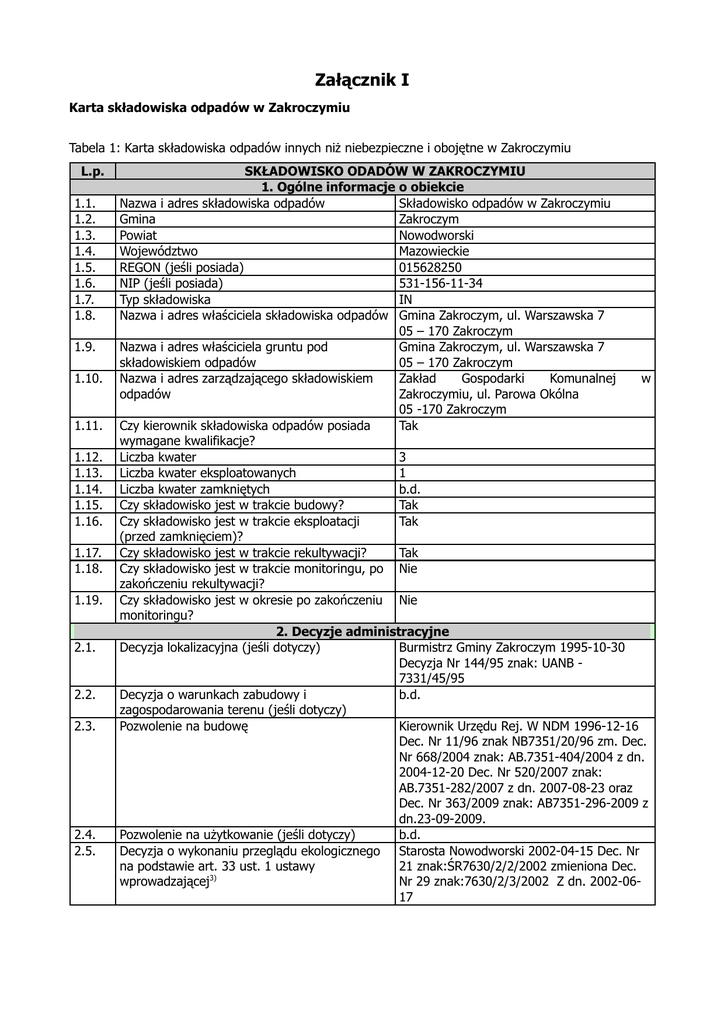 Załącznik I Karta składowiska odpadów w Zakroczymiu Tabela 1: Karta składowiska odpadów innych niż niebezpieczne i obojętne w Zakroczymiu L.p. 1.1. 1.2. 1.3. 1.4. 1.5. 1.6. 1.7. 1.8. 1.9. 1.10. 1.11. 1.12. 1.13. 1.14. 1.15. 1.16. 1.17. 1.18. 1.19. 2.1. 2.2. 2.3. 2.4. 2.5. SKŁADOWISKO ODADÓW W ZAKROCZYMIU 1. Ogólne informacje o obiekcie Nazwa i adres składowiska odpadów Składowisko odpadów w Zakroczymiu Gmina Zakroczym Powiat Nowodworski Województwo Mazowieckie REGON (jeśli posiada) 015628250 NIP (jeśli posiada) 531-156-11-34 Typ składowiska IN Nazwa i adres właściciela składowiska odpadów Gmina Zakroczym, ul. Warszawska 7 05 – 170 Zakroczym Nazwa i adres właściciela gruntu pod Gmina Zakroczym, ul. Warszawska 7 składowiskiem odpadów 05 – 170 Zakroczym Nazwa i adres zarządzającego składowiskiem Zakład Gospodarki Komunalnej w odpadów Zakroczymiu, ul. Parowa Okólna 05 -170 Zakroczym Czy kierownik składowiska odpadów posiada Tak wymagane kwalifikacje? Liczba kwater 3 Liczba kwater eksploatowanych 1 Liczba kwater zamkniętych b.d. Czy składowisko jest w trakcie budowy? Tak Czy składowisko jest w trakcie eksploatacji Tak (przed zamknięciem)? Czy składowisko jest w trakcie rekultywacji? Tak Czy składowisko jest w trakcie monitoringu, po Nie zakończeniu rekultywacji? Czy składowisko jest w okresie po zakończeniu Nie monitoringu? 2. Decyzje administracyjne Decyzja lokalizacyjna (jeśli dotyczy) Burmistrz Gminy Zakroczym 1995-10-30 Decyzja Nr 144/95 znak: UANB 7331/45/95 Decyzja o warunkach zabudowy i b.d. zagospodarowania terenu (jeśli dotyczy) Pozwolenie na budowę Kierownik Urzędu Rej. W NDM 1996-12-16 Dec. Nr 11/96 znak NB7351/20/96 zm. Dec. Nr 668/2004 znak: AB.7351-404/2004 z dn. 2004-12-20 Dec. Nr 520/2007 znak: AB.7351-282/2007 z dn. 2007-08-23 oraz Dec. Nr 363/2009 znak: AB7351-296-2009 z dn.23-09-2009. Pozwolenie na użytkowanie (jeśli dotyczy) b.d. Decyzja o wykonaniu przeglądu ekologicznego Starosta Nowodworski 2002-04-15 Dec. Nr na podstawie art. 33 ust. 1 ustawy 21 znak:ŚR7630/2/2/2002 zmieniona Dec. wprowadzającej3) Nr 29 znak:7630/2/3/2002 Z dn. 2002-0617 L.p. 2.6. 2.7. 2.8. 2.9. 2.10. 2.11. 2.12. 2.13. 2.14. 2.15. 2.16. 2.17. 2.18. 2.19. 2.20. 2.21. 2.22. 2.23. 2.24. 2.25. 2.26. 2.27. SKŁADOWISKO ODADÓW W ZAKROCZYMIU Decyzja o dostosowaniu na podstawie art. 33 ust. 2 pkt 1 ustawy wprowadzająccej3) (jeśli Nie dotyczy dotyczy) Czy treść decyzji o dostosowaniu na podstawie art. 33 ust. 2 pkt. 1 ustawy wprowadzającej b.d. została wykonana? Czy decyzja o dostosowaniu została b.d. przedłużona? Czy przedłużona decyzja została wykonana? b.d. Rok faktycznego dostosowania składowiska b.d. odpadów Decyzja o dostosowaniu na podstawie art. 33 ust. 2 pkt 2 ustawy wprowadzającej3) (jeśli Nie dotyczy dotyczy) Czy treść decyzji o dostosowaniu na podstawie art. 33 ust. 2 pkt. 2 ustawy wprowadzającej b.d. została wykonana? Czy decyzja o dostosowaniu została b.d. przedłużona? Czy przedłużona decyzja została wykonana? b.d. Rok faktycznego dostosowania składowiska b.d. odpadów Decyzja o zamknięciu składowiska na podstawie art. 33 ust. 6 ustawy wprowadzającej3) (jeśli Nie dotyczy dotyczy) Czy decyzja o zamknięciu składowiska na podstawie art. 33 ust. 6 ustawy Nie dotyczy wprowadzającej 2) została wykonana? Czy decyzja o zamknięciu została przedłużona? b.d. Czy przedłużona decyzja o zamknięciu została b.d. wykonana? Zgoda na zamknięcie wydzielonej części składowiska na podstawie art. 54 ustawy o b.d. odpadach Zgoda na zamknięcie składowiska odpadów na b.d. podstawie art. 54 ustawy o odpadach Rok faktycznego zamknięcia składowiska b.d. odpadów Decyzja zatwierdzająca instrukcję eksploatacji Wojewoda Mazowiecki 02-01-2007 składowiska WSR.V.GG.6625/1/07 Dec. Zmieniająca z dnia 02-05-2007 WSR.V.GG6625/7/2007 zm. Dec. Nr 95/09/PŚ. O z dnia 03.XI.2009 znak:PS.IV/BS/7671-16.5/09 Czy decyzja zatwierdzająca instrukcję b.d. eksploatacji składowiska była czasowa? Zezwolenie na prowadzenie działalności w Marszałek Województwa Mazowieckiego zakresie odzysku lub unieszkodliwiania 30.X.2008 PŚ.IV/7670-83.4/08 Decyzja Nr odpadów (jeśli dotyczy) 95/08/PS.O 31 grudnia 2011. Pozwolenie zintegrowane (jeśli dotyczy) Marszałek Województwa Mazowieckiego 15.07.2008 Decyzja Nr 31/08/PS.Z PŚ.V/KS/7600-17/08 31.XII.2010 Czy składowisko jest przewidziane do uzyskania b.d. pozwolenia zintegrowanego? L.p. 2.28. 3.1. 3.2. 3.3. 3.4. 3.5. 3.6. 3.7. 3.8. 4.1. 4.2. 4.3. 4.4. 4.5. 4.6. SKŁADOWISKO ODADÓW W ZAKROCZYMIU Czy dla składowiska była wydana decyzja w b.d. sprawie wstrzymania działalności? 3. Bazy danych i wykazy Czy składowisko jest ujęte w wykazie Tak zamieszczonym w wojewódzkim planie gospodarki odpadami? Czy w wojewódzkim planie gospodarki 2014 r. odpadami określono termin zamknięcia składowiska? Czy składowisko jest ujęte w Wojewódzkiej Tak Bazie Odpadowej? Czy składowisko odpadów jest ujęte w bazie Tak Wojewódzkiej Inspekcji Ochrony Środowiska? Czy składowisko jest ujęte w bazie Tak Wojewódzkiego Urzędu Statystycznego? Czy składowisko zostało ujęte w wykazie Tak przekazywanym przez Urząd Wojewódzki do Ministerstwa Środowiska w 2004 r.? Czy składowisko zostało ujęte w wykazie Tak przekazywanym przez Urząd Wojewódzki do Ministerstwa Środowiska w 2005 r.? Czy składowisko zostało ujęte w wykazie Tak przekazywanym przez Urząd Wojewódzki do Ministerstwa Środowiska w 2006 r.? 4. Wymagania techniczne Pojemność całkowita m3 475,200 m3 Pojemność zapełniona m3 384,740 m3 3 Pojemność pozostała m 90,460 m3 do zapełnienia Powierzchnia w m2 1500 m2 granicach korony Uszczelnienie [tak/nie] Tak Drenaż odcieków Naturalna bariera geologiczna (miąższość, współczynnik filtracji) Sztuczna bariera geologiczna (miąższość, współczynnik filtracji) Izolacja syntetyczna (materiał, grubość) [tak/nie] Warstwa drenażowa (miąższość, współczynnik filtracji)