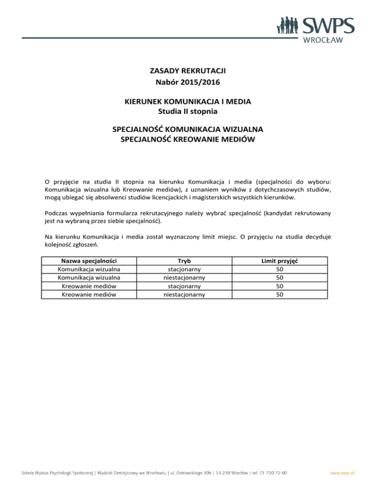ZASADY REKRUTACJI Nabór 2015/2016 KIERUNEK KOMUNIKACJA I MEDIA Studia II stopnia SPECJALNOŚĆ KOMUNIKACJA WIZUALNA SPECJALNOŚĆ KREOWANIE MEDIÓW O przyjęcie na studia II stopnia na kierunku Komunikacja i media (specjalności do wyboru: Komunikacja wizualna lub Kreowanie mediów), z uznaniem wyników z dotychczasowych studiów, mogą ubiegać się absolwenci studiów licencjackich i magisterskich wszystkich kierunków. Podczas wypełniania formularza rekrutacyjnego należy wybrać specjalność (kandydat rekrutowany jest na wybraną przez siebie specjalność). Na kierunku Komunikacja i media został wyznaczony limit miejsc. O przyjęciu na studia decyduje kolejność zgłoszeń. Nazwa specjalności Komunikacja wizualna Komunikacja wizualna Kreowanie mediów Kreowanie mediów Tryb stacjonarny niestacjonarny stacjonarny niestacjonarny Limit przyjęć 50 50 50 50