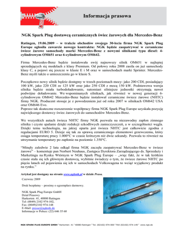 1/1 Informacja prasowa NGK Spark Plug dostawcą ceramicznych świec żarowych dla Mercedes-Benz Ratingen, 19.06.2009 – w trakcie obchodów swojego 30-lecia firma NGK Spark Plug Europe ogłosiła zawarcie nowego kontraktu: NGK będzie zaopatrywać w ceramiczne świece żarowe samochody marki Mercedes-Benz z nowymi silnikami typu diesel: 4cylindrowym OM651 oraz 6-cylindrowym OM642. Firma Mercedes-Benz będzie instalowała swój najnowszy silnik OM651 w najlepiej sprzedających się modelach z klasy Premium. Od połowy roku 2008 zasila on już samochody klasy C, a pojawi się jeszcze w klasie E i M oraz w samochodach marki Sprinter. MercedesBenz myśli także o umieszczeniu go w klasie S. Początkowo nowy silnik będzie dostępny w trzech poziomach mocy: jako 200 CDI, posiadający 100 kW, jako 220 CDI ze 125 kW oraz jako 250 CDI z mocą 150 kW. Podstawowa wersja silnika będzie miała turbodoładowanie, natomiast silniejsze jednostki otrzymają nawet podwójne doładowanie. We wspominanych silnikach, jak również w nowej generacji 6cylindrowym OM642 Mercedes-Benz będzie instalował ceramiczne świece żarowe (NHTC) firmy NGK. Producent stosuje je z powodzeniem już od roku 2007 w silnikach OM642 USA oraz OM646 Evo. Poprzez tak skuteczne rozszerzenie współpracy firma NGK Spark Plug Europe uzyskała pozycję największego dostawcy świec żarowych do samochodów Mercedes-Benz. We wszystkich autach świeca NHTC firmy NGK pozwala na niezawodny zapłon zimnego silnika i czyste spalanie dzięki redukcji szkodliwych zanieczyszczeń, a w szczególności węgla. Dzięki temu technologia, na jakiej oparta jest świeca NHTC jest całkowicie zgodna z regulacjami EURO 5. Dzieje się tak za sprawą ceramicznego elementowi grzewczemu, który osiąga temperaturę pracy 1.000°C w czasie krótszym niż dwie sekundy. Pozwala to również na utrzymanie temperatury po zapłonie na poziomie 1.350°C. “Minęły zaledwie 2 lata odkąd firma NGK zaczęła zaopatrywać Mercedes-Benz w świece żarowe” – komentuje pan Norbert Neuhaus, Zastępca Dyrektora Zarządzającego ds. Sprzedaży i Marketingu na Rynku Wtórnym w NGK Spark Plug Europe – „więc fakt, że w tak krótkim czasie stała się ich głównym dostawcą, wybitnie świadczy o tym, że świece żarowe NHTC po pięciu latach od pojawienia się ich w samochodach Volkswagena to wciąż wyjątkowy produkt na rynku.” Artykuł jest dostępny na stronie www.ngkntk.pl w dziale Prasa. Czerwiec 2009 Druk bezpłatny – prosimy o egzemplarz darmowy. NGK Spark Plug Europe GmbH Dział Prasowy Harkortstr. 41, 40880 Ratingen Tel: (0049) 2102 974-102, Fax: (0049)2102 974-148 E-Mail: [email protected] Informacje w Polsce: (22) 646 35 60 NGK SPARK PLUG EUROPE GMBH • Harkortstr. 41 • 40880 Ratingen • Tel. (02102) 974-000 • FAX (02102) 974-149 • www.ngk.de