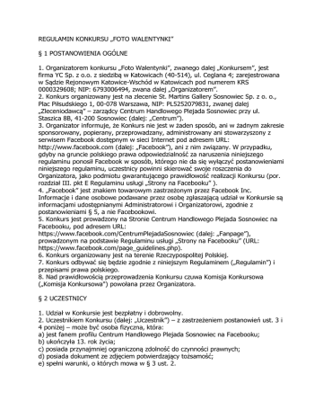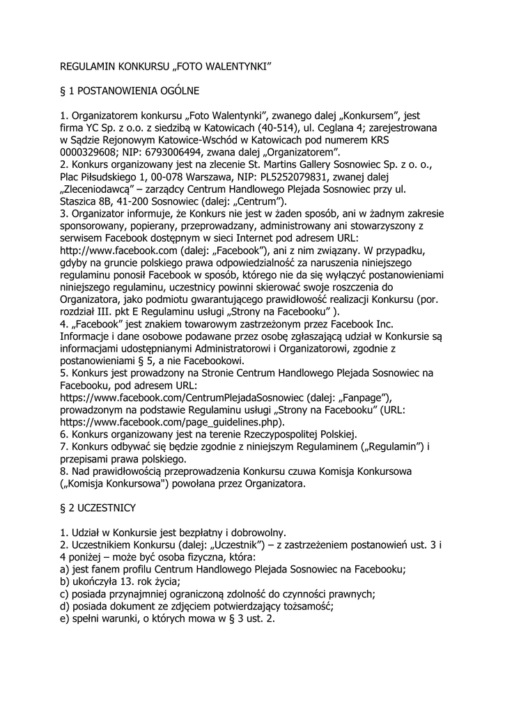 REGULAMIN KONKURSU „FOTO WALENTYNKI” § 1 POSTANOWIENIA OGÓLNE 1. Organizatorem konkursu „Foto Walentynki”, zwanego dalej „Konkursem”, jest firma YC Sp. z o.o. z siedzibą w Katowicach (40-514), ul. Ceglana 4; zarejestrowana w Sądzie Rejonowym Katowice-Wschód w Katowicach pod numerem KRS 0000329608; NIP: 6793006494, zwana dalej „Organizatorem”. 2. Konkurs organizowany jest na zlecenie St. Martins Gallery Sosnowiec Sp. z o. o., Plac Piłsudskiego 1, 00-078 Warszawa, NIP: PL5252079831, zwanej dalej „Zleceniodawcą” – zarządcy Centrum Handlowego Plejada Sosnowiec przy ul. Staszica 8B, 41-200 Sosnowiec (dalej: „Centrum”). 3. Organizator informuje, że Konkurs nie jest w żaden sposób, ani w żadnym zakresie sponsorowany, popierany, przeprowadzany, administrowany ani stowarzyszony z serwisem Facebook dostępnym w sieci Internet pod adresem URL: http://www.facebook.com (dalej: „Facebook”), ani z nim związany. W przypadku, gdyby na gruncie polskiego prawa odpowiedzialność za naruszenia niniejszego regulaminu ponosił Facebook w sposób, którego nie da się wyłączyć postanowieniami niniejszego regulaminu, uczestnicy powinni skierować swoje roszczenia do Organizatora, jako podmiotu gwarantującego prawidłowość realizacji Konkursu (por. rozdział III. pkt E Regulaminu usługi „Strony na Facebooku” ). 4. „Facebook” jest znakiem towarowym zastrzeżonym przez Facebook Inc. Informacje i dane osobowe podawane przez osobę zgłaszającą udział w Konkursie są informacjami udostępnianymi Administratorowi i Organizatorowi, zgodnie z postanowieniami § 5, a nie Facebookowi. 5. Konkurs jest prowadzony na Stronie Centrum Handlowego Plejada Sosnowiec na Facebooku, pod adresem URL: https://www.facebook.com/CentrumPlejadaSosnowiec (dalej: „Fanpage”), prowadzonym na podstawie Regulaminu usługi „Strony na Facebooku” (URL: https://www.facebook.com/page_guidelines.php). 6. Konkurs organizowany jest na terenie Rzeczypospolitej Polskiej. 7. Konkurs odbywać się będzie zgodnie z niniejszym Regulaminem („Regulamin”) i przepisami prawa polskiego. 8. Nad prawidłowością przeprowadzenia Konkursu czuwa Komisja Konkursowa („Komisja Konkursowa") powołana przez Organizatora. § 2 UCZESTNICY 1. Udział w Konkursie jest bezpłatny i dobrowolny. 2. Uczestnikiem Konkursu (dalej: „Uczestnik”) – z zastrzeżeniem postanowień ust. 3 i 4 poniżej – może być osoba fizyczna, która: a) jest fanem profilu Centrum Handlowego Plejada Sosnowiec na Facebooku; b) ukończyła 13. rok życia; c) posiada przynajmniej ograniczoną zdolność do czynności prawnych; d) posiada dokument ze zdjęciem potwierdzający tożsamość; e) spełni warunki, o których mowa w § 3 ust. 2. 3. Osoba posiadająca ograniczoną zdolność do czynności prawnych może brać udział w Konkursie wyłącznie za zgodą przedstawiciela ustawowego, która powinna obejmować również zgodę na przetwarzanie danych osobowych. 4. W Konkursie nie mogą brać udziału pracownicy, współpracownicy lub przedstawiciele Organizatora, Administratora oraz innych podmiotów biorących bezpośredni udział w przygotowaniu i przeprowadzeniu Konkursu, ani członkowie ich rodzin. Przez członków rodziny rozumie się na potrzeby Konkursu: wstępnych, zstępnych, rodzeństwo, małżonków, rodziców współmałżonka oraz osoby pozostające w stosunku przysposobienia, zaś za pracowników uważa się: wszelkie osoby wykonujące pracę lub inne powtarzające się czynności na rzecz podmiotów wymienionych powyżej, niezależnie od podstawy, na jakiej ta współpraca jest wykonywana. 5. Organizator zastrzega sobie prawo do wykluczenia z udziału w Konkursie Uczestników, których działania są sprzeczne z prawem lub Regulaminem oraz regulaminem Facebooka, w szczególności uczestników, którzy: a) podejmują działania z wykorzystaniem konta/profilu utworzonego niezgodnie z zasadami Facebooka; b) podejmują działania z wykorzystaniem konta/profilu osób trzecich; c) tworzą fikcyjne konta/profile w serwisie Facebook w celu uniknięcia weryfikacji wieku; d) nie ukończyli 13 lat. § 3 CZAS I WARUNKI KONKURSU 1. Konkurs rozpoczyna się w dniu 11.02.2017 i trwa do dnia 14.02.2017 roku do godziny 23:59. Ogłoszenie wyników nastąpi dnia 20.02.2017 r. do godziny 16:00. 2. Warunkiem wzięcia udziału w Konkursie przez Uczestnika jest: a) bycie fanem profilu Centrum Handlowego Plejada Sosnowiec w serwisie Facebook.com b) wykonanie zadania konkursowego, o którym mowa w ust. 3 poniżej; c) zapoznanie się z treścią niniejszego Regulaminu; d) udzielenie zgody i przesłanie Organizatorowi informacji, oświadczeń i danych – zgodnie z postanowieniami w § 4 oraz § 6 ust. 7. 3. Zadanie konkursowe brzmi: „Zrób sobie romantyczne zdjęcie razem ze swoją „drugą połówką” (chłopakiem/dziewczyną, narzeczonym/narzeczoną, mężem/żoną) na „ściance” ustawionej od 11.02 na terenie Centrum Handlowego Plejada i umieść je w komentarzach do postu konkursowego; dalej „Zadanie konkursowe” na Facebooku CH Plejada”. 4. Zamieszczanie przez Uczestnika w wiadomości treści o charakterze bezprawnym jest zakazane. 5. Przesłanie zadania konkursowego jest równoznaczne z akceptacją regulaminu Konkursu. § 4 PRAWA AUTORSKIE 1. Wykonanie zadania konkursowego określonego w § 3 ust. 3 pkt. jest równoznaczne z oświadczeniem, że Uczestnik jest wyłącznym twórcą zadania, że Uczestnikowi przysługują do niego (jako całości) nieograniczone osobiste i majątkowe prawa autorskie i prawa pokrewne, a także iż nie naruszają one praw autorskich osób trzecich, uprawnień jakiejkolwiek osoby związanej z rozpowszechnianiem jej wizerunku, przepisów Ustawy z dnia 16 kwietnia 1993 r. o zwalczaniu nieuczciwej konkurencji (Dz. U. z 2003r., nr 153, poz. 1503 tj. ze zm.), są wolne od niedozwolonych zapożyczeń oraz nie mają miejsca żadne inne okoliczności, które mogłyby narazić Organizatora lub