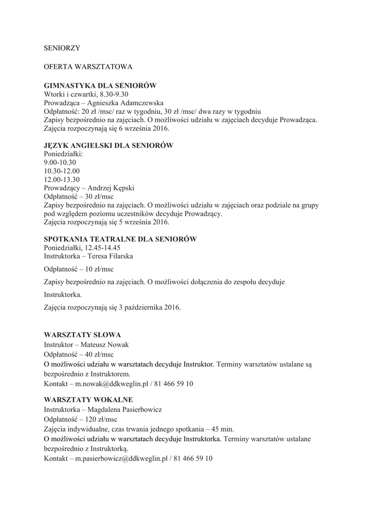 SENIORZY OFERTA WARSZTATOWA GIMNASTYKA DLA SENIORÓW Wtorki i czwartki, 8.30-9.30 Prowadząca – Agnieszka Adamczewska Odpłatność: 20 zł /msc/ raz w tygodniu, 30 zł /msc/ dwa razy w tygodniu Zapisy bezpośrednio na zajęciach. O możliwości udziału w zajęciach decyduje Prowadząca. Zajęcia rozpoczynają się 6 września 2016. JĘZYK ANGIELSKI DLA SENIORÓW Poniedziałki: 9.00-10.30 10.30-12.00 12.00-13.30 Prowadzący – Andrzej Kępski Odpłatność – 30 zł/msc Zapisy bezpośrednio na zajęciach. O możliwości udziału w zajęciach oraz podziale na grupy pod względem poziomu uczestników decyduje Prowadzący. Zajęcia rozpoczynają się 5 września 2016. SPOTKANIA TEATRALNE DLA SENIORÓW Poniedziałki, 12.45-14.45 Instruktorka – Teresa Filarska Odpłatność – 10 zł/msc Zapisy bezpośrednio na zajęciach. O możliwości dołączenia do zespołu decyduje Instruktorka. Zajęcia rozpoczynają się 3 października 2016. WARSZTATY SŁOWA Instruktor – Mateusz Nowak Odpłatność – 40 zł/msc O możliwości udziału w warsztatach decyduje Instruktor. Terminy warsztatów ustalane są bezpośrednio z Instruktorem. Kontakt – [email protected] / 81 466 59 10 WARSZTATY WOKALNE Instruktorka – Magdalena Pasierbowicz Odpłatność – 120 zł/msc Zajęcia indywidualne, czas trwania jednego spotkania – 45 min. O możliwości udziału w warsztatach decyduje Instruktorka. Terminy warsztatów ustalane bezpośrednio z Instruktorką. Kontakt – [email protected] / 81 466 59 10 ZESPÓŁ CHÓRALNY „BELLO CANTO” Poniedziałki, 9.00-10.30 Piątki, 8.30-10.00 Dyrygentka – Agnieszka Milaniuk Akompaniatorka i korepetytorka – dr Lidia Dzhmachyan Odpłatność – 10 zł/msc O możliwości dołączenia do Zespołu decyduje Dyrygentka. Próby rozpoczynają się 5 września 2016. ZESPÓŁ „LUBELSKIE CZADERKI” Poniedziałki i czwartki, 11.00-13.00 Instruktorka – Magdalena Piórkowska Odpłatność – 10 zł/msc O możliwości dołączenia do Zespołu decyduje Instruktorka. Zajęcia rozpoczynają się 7 września 2016. KLUB „AKTYWNI 50+” Wtorki, 9.45-12.00 Koordynatorka działań – Anna Grzybek Zajęcia bezpłatne Pierwsze spotkanie odbędzie się 6 września 2016. Szczegółowe informacje: www.ddkweglin.pl / [email protected]