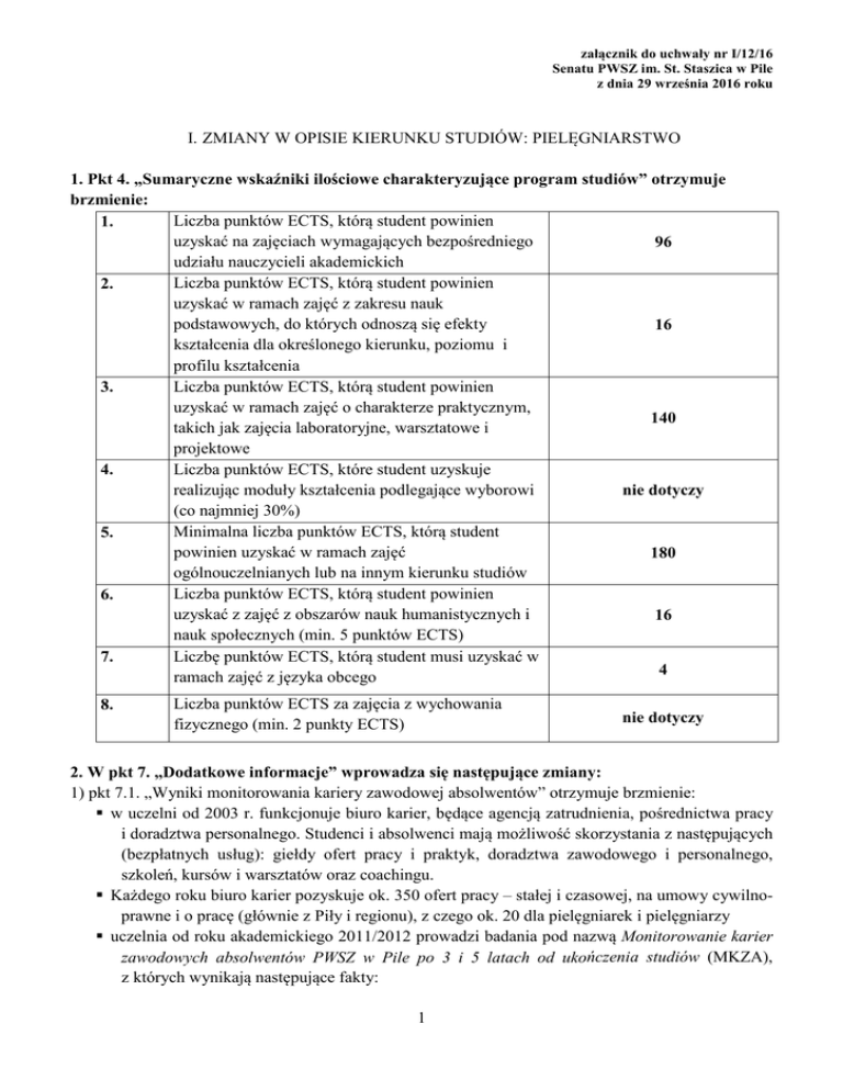 załącznik do uchwały nr I/12/16 Senatu PWSZ im. St. Staszica w Pile z dnia 29 września 2016 roku I. ZMIANY W OPISIE KIERUNKU STUDIÓW: PIELĘGNIARSTWO 1. Pkt 4. „Sumaryczne wskaźniki ilościowe charakteryzujące program studiów” otrzymuje brzmienie: Liczba punktów ECTS, którą student powinien 1. uzyskać na zajęciach wymagających bezpośredniego 96 udziału nauczycieli akademickich Liczba punktów ECTS, którą student powinien 2. uzyskać w ramach zajęć z zakresu nauk podstawowych, do których odnoszą się efekty 16 kształcenia dla określonego kierunku, poziomu i profilu kształcenia Liczba punktów ECTS, którą student powinien 3. uzyskać w ramach zajęć o charakterze praktycznym, 140 takich jak zajęcia laboratoryjne, warsztatowe i projektowe Liczba punktów ECTS, które student uzyskuje 4. realizując moduły kształcenia podlegające wyborowi nie dotyczy (co najmniej 30%) Minimalna liczba punktów ECTS, którą student 5. powinien uzyskać w ramach zajęć 180 ogólnouczelnianych lub na innym kierunku studiów Liczba punktów ECTS, którą student powinien 6. uzyskać z zajęć z obszarów nauk humanistycznych i 16 nauk społecznych (min. 5 punktów ECTS) Liczbę punktów ECTS, którą student musi uzyskać w 7. 4 ramach zajęć z języka obcego 8. Liczba punktów ECTS za zajęcia z wychowania fizycznego (min. 2 punkty ECTS) nie dotyczy 2. W pkt 7. „Dodatkowe informacje” wprowadza się następujące zmiany: 1) pkt 7.1. „Wyniki monitorowania kariery zawodowej absolwentów” otrzymuje brzmienie: w uczelni od 2003 r. funkcjonuje biuro karier, będące agencją zatrudnienia, pośrednictwa pracy i doradztwa personalnego. Studenci i absolwenci mają możliwość skorzystania z następujących (bezpłatnych usług): giełdy ofert pracy i praktyk, doradztwa zawodowego i personalnego, szkoleń, kursów i warsztatów oraz coachingu. Każdego roku biuro karier pozyskuje ok. 350 ofert pracy – stałej i czasowej, na umowy cywilnoprawne i o pracę (głównie z Piły i regionu), z czego ok. 20 dla pielęgniarek i pielęgniarzy uczelnia od roku akademickiego 2011/2012 prowadzi badania pod nazwą Monitorowanie karier zawodowych absolwentów PWSZ w Pile po 3 i 5 latach od ukończenia studiów (MKZA), z których wynikają następujące fakty: 1 załącznik do uchwały nr I/12/16 Senatu PWSZ im. St. Staszica w Pile z dnia 29 września 2016 roku − 90% po 3 latach (2012); 87% po 3 latach oraz 90,12% po 5 latach (2013); ponad 87% po 3 latach oraz 91% po 5 latach (2014); 78% po 3 latach oraz 78% po 3 latach oraz 77% po 5 latach (2015), jest aktywnych na rynku pracy, z czego większość pracuje w branżach związanych z kierunkami kształcenia, znajdującymi się w ofercie dydaktycznej uczelni, − większość absolwentów zatrudniona jest na podstawie umowy o pracę 76% (2012); 70% (2013); 70% (2014); 62% (2015), − znaczna część absolwentów pierwsze doświadczenia zawodowe uzyskiwała już w trakcie studiów (oprócz obowiązkowych praktyk), − większość absolwentów (ok. 75%) kontynuuje (lub planuje kontynuować) kształcenie na studiach uzupełniających magisterskich, studiach podyplomowych, kursach, warsztatach, szkoleniach, a pojedyncze osoby także na studiach doktoranckich. Wśród powodów ankietowani najczęściej wskazują: chęć awansu/rozwoju zawodowego, chęć poprawy statusu materialnego, chęć poprawy statusu społecznego, zainteresowanie tematyką, wymagania kwalifikacyjne wykonywanej pracy, wymagania kwalifikacyjne niezbędne do zmiany pracy, skierowanie przez zakład pracy w maju br. przez MNiSW udostępniony został Ogólnopolski system monitorowania Ekonomicznych Losów Absolwentów szkół wyższych (na podstawie danych administracyjnych ZUS i POL-on), dot. absolwentów (z 2014 r.) kierunku pielęgniarstwo w PWSZ w Pile: wskaźniki studia stacjonarne studia niestacjonarne liczba absolwentów 33 71 średni czas od uzyskania 3,68 miesiące wszyscy absolwenci dyplomu do podjęcia posiadali pracę pierwszej pracy średni czas od uzyskania 4,43 miesiące dyplomu do podjęcia pierwszej pracy na umowę o pracę % absolwentów, którzy 27,3% 1,4% przynajmniej raz w ciągu roku od ukończenia studiów zarejestrowani byli jako bezrobotni ryzyko bezrobocia wśród 7,5% (ryzyko) – 11,32% 0,11% (ryzyko) – 12,2% absolwentów a stopa (stopa) (stopa) bezrobocia w powiatach zamieszkania absolwentów średnia miesięczna liczba 1 (dla 95,7% absolwentów) 1,04 (dla 93,4%) pracodawców, od których absolwenci otrzymywali 2 załącznik do uchwały nr I/12/16 Senatu PWSZ im. St. Staszica w Pile z dnia 29 września 2016 roku studia stacjonarne studia niestacjonarne wskaźniki wynagrodzenie średnia roczna liczba 0,23 0,08 przypadków zakończenia pracy etatowej1 średnie miesięczne 2298,51 zł 3568,62 wynagrodzenie z tytułu umowy o pracę zamieszkanie: - powiat pilski 3 13 - woj. wielkopolskie 21 39 -poza woj. wielkopolskim 18 - brak danych 9 1 % osób 8,33% 19,05% samozatrudnionych Weryfikacja opinii i oczekiwań studentów oraz absolwentów w zakresie przygotowania zawodowego przez pracodawców. uczelnia od roku akademickiego 2014/2015 prowadzi badania dotyczące oceny organizacji studenckich praktyk zawodowych, w ramach których respondentami są studenci wszystkich kierunków i trybów studiów. Studenci wysoko oceniają system organizacji praktyk zawodowych, współpracę z opiekunami praktyk – zarówno ze strony uczelni, jak i w zakładach pracy, a nade wszystko możliwość zdobycia doświadczenia zawodowego w trakcie studiów. Z odpowiedzi studentów wynika, że aż 85% (Raport, 2014, s. 9 ) i 87% (Raport, 2015, s. 9) z nich chciałaby odbyć praktykę ponownie w tym samym miejscu, zatem należy wysnuć wniosek, że praktyki spełniły ich oczekiwania. Analogicznie, również stosunek pracodawców do studentów oceniany jest przez nich bardzo dobrze – 86% i 92% studentów jest bardzo zadowolonych lub zadowolonych ze współpracy z opiekunami p