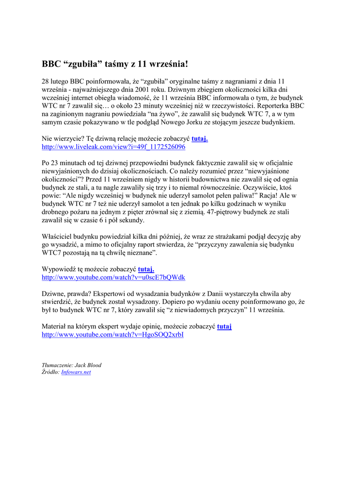 BBC “zgubiła” taśmy z 11 września! 28 lutego BBC poinformowała, Ŝe “zgubiła” oryginalne taśmy z nagraniami z dnia 11 września - najwaŜniejszego dnia 2001 roku. Dziwnym zbiegiem okoliczności kilka dni wcześniej internet obiegła wiadomość, Ŝe 11 września BBC informowała o tym, Ŝe budynek WTC nr 7 zawalił się… o około 23 minuty wcześniej niŜ w rzeczywistości. Reporterka BBC na zaginionym nagraniu powiedziała “na Ŝywo”, Ŝe zawalił się budynek WTC 7, a w tym samym czasie pokazywano w tle podgląd Nowego Jorku ze stojącym jeszcze budynkiem. Nie wierzycie? Tę dziwną relację moŜecie zobaczyć tutaj. http://www.liveleak.com/view?i=49f_1172526096 Po 23 minutach od tej dziwnej przepowiedni budynek faktycznie zawalił się w oficjalnie niewyjaśnionych do dzisiaj okolicznościach. Co naleŜy rozumieć przez “niewyjaśnione okoliczności”? Przed 11 wrześniem nigdy w historii budownictwa nie zawalił się od ognia budynek ze stali, a tu nagle zawaliły się trzy i to niemal równocześnie. Oczywiście, ktoś powie: “Ale nigdy wcześniej w budynek nie uderzył samolot pełen paliwa!” Racja! Ale w budynek WTC nr 7 teŜ nie uderzył samolot a ten jednak po kilku godzinach w wyniku drobnego poŜaru na jednym z pięter zrównał się z ziemią. 47-piętrowy budynek ze stali zawalił się w czasie 6 i pół sekundy. Właściciel budynku powiedział kilka dni później, Ŝe wraz ze straŜakami podjął decyzję aby go wysadzić, a mimo to oficjalny raport stwierdza, Ŝe “przyczyny zawalenia się budynku WTC7 pozostają na tą chwilę nieznane”. Wypowiedź tę moŜecie zobaczyć tutaj. http://www.youtube.com/watch?v=u0scE7bQWdk Dziwne, prawda? Ekspertowi od wysadzania budynków z Danii wystarczyła chwila aby stwierdzić, Ŝe budynek został wysadzony. Dopiero po wydaniu oceny poinformowano go, Ŝe był to budynek WTC nr 7, który zawalił się “z niewiadomych przyczyn” 11 września. Materiał na którym ekspert wydaje opinię, moŜecie zobaczyć tutaj http://www.youtube.com/watch?v=HgoSOQ2xrbI Tłumaczenie: Jack Blood Źródło: Infowars.net